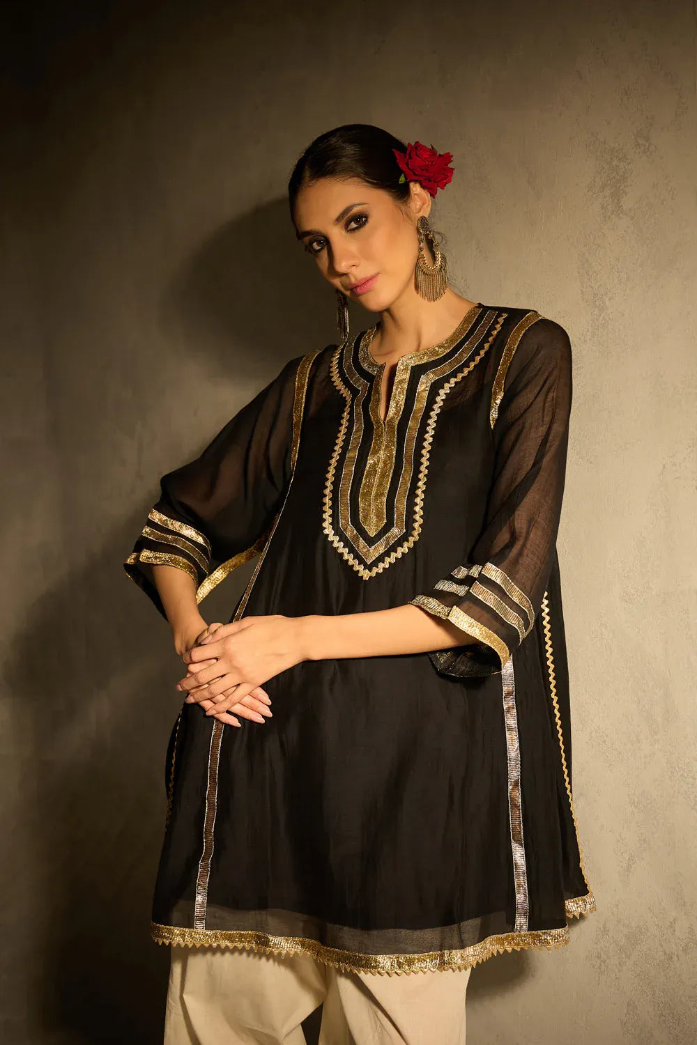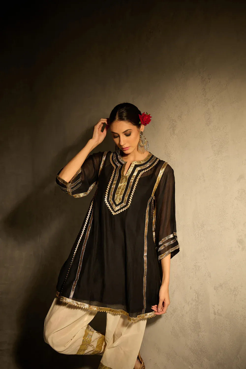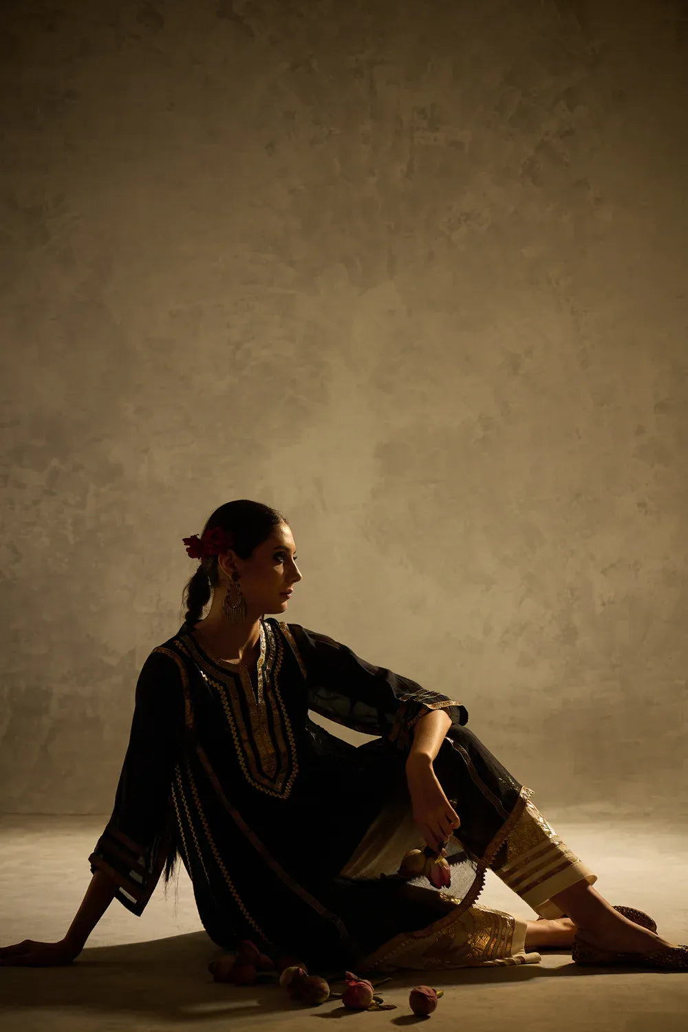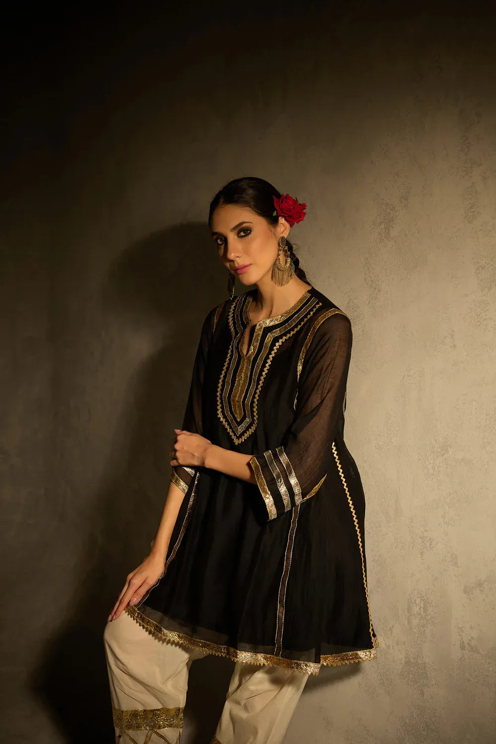 A classic Black kalidaar kurta crafted with delicate sucha gota work, blending classic cuts with modern refinement. The kurta features clean lines and thoughtful detailing, paired with our timeless gota salwar highlighted with artistic gota patterns.