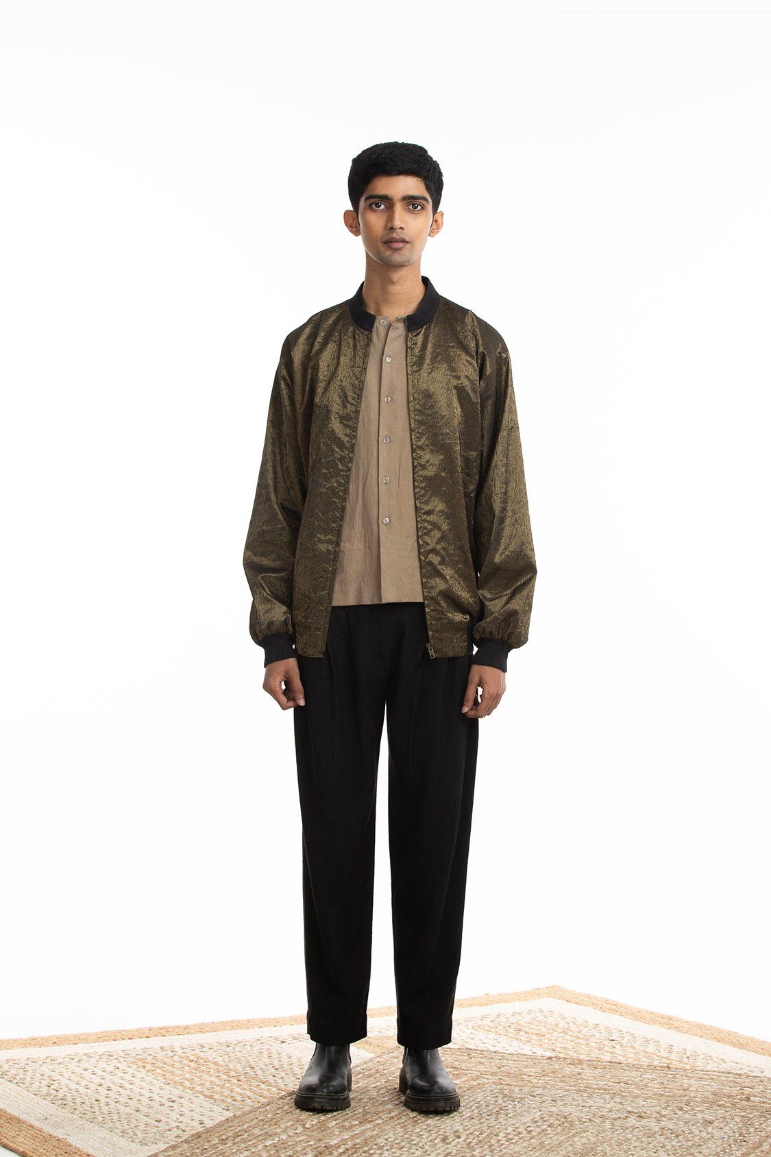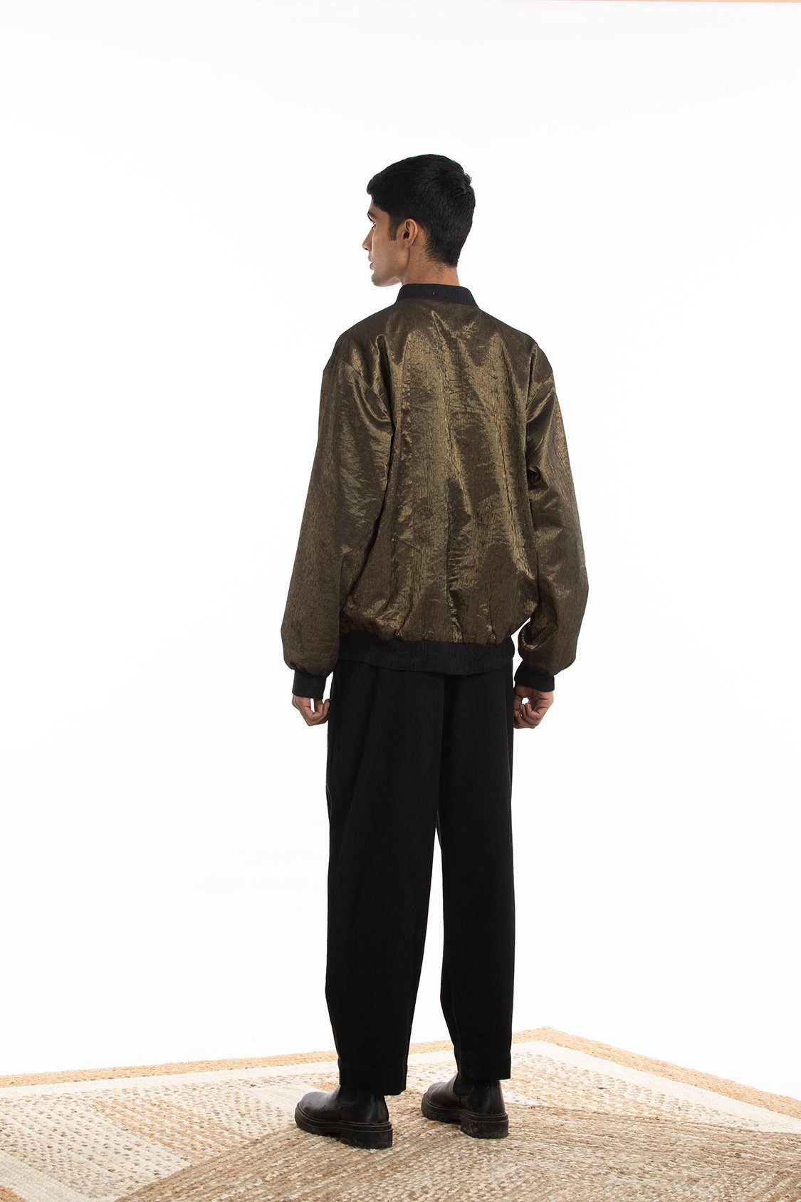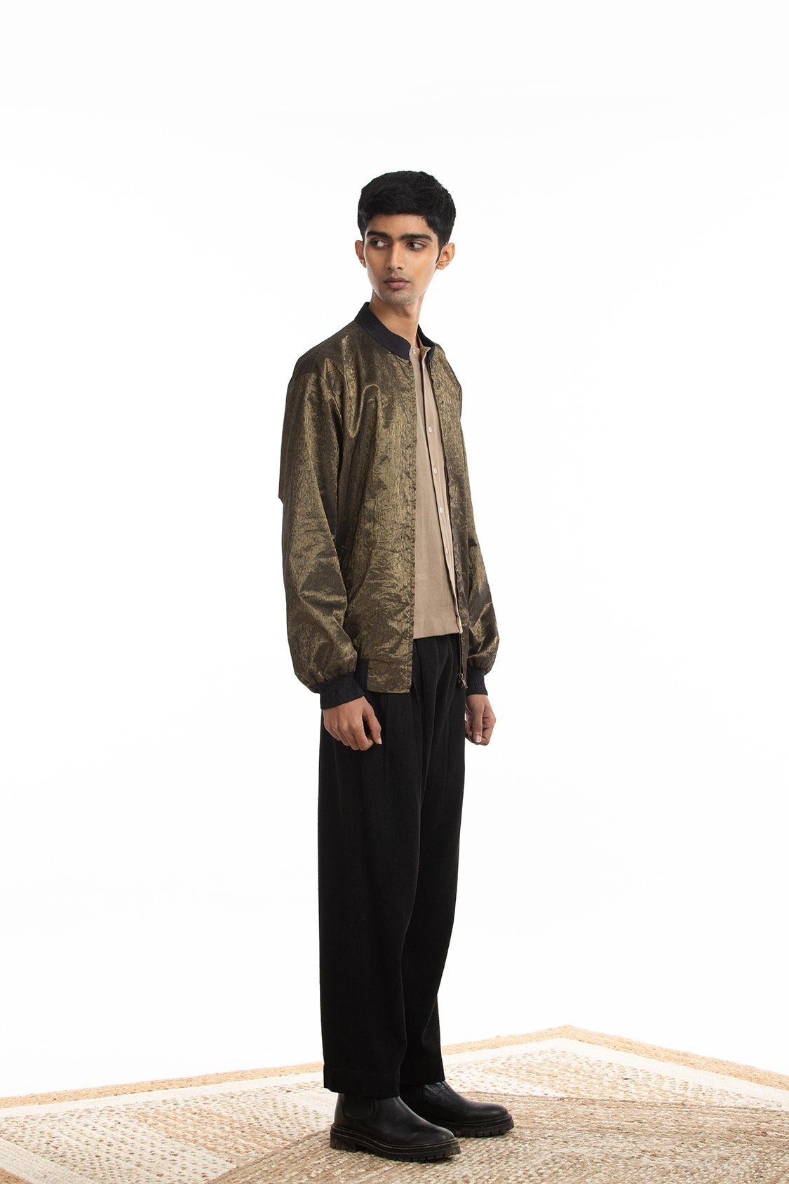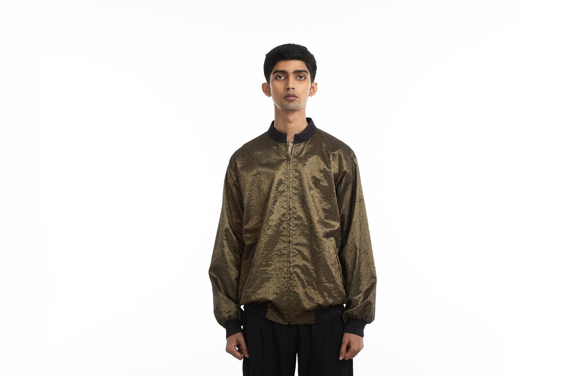 Handwoven in fine Silk,Cotton & Zari, this bomber jacket makes for luxurious