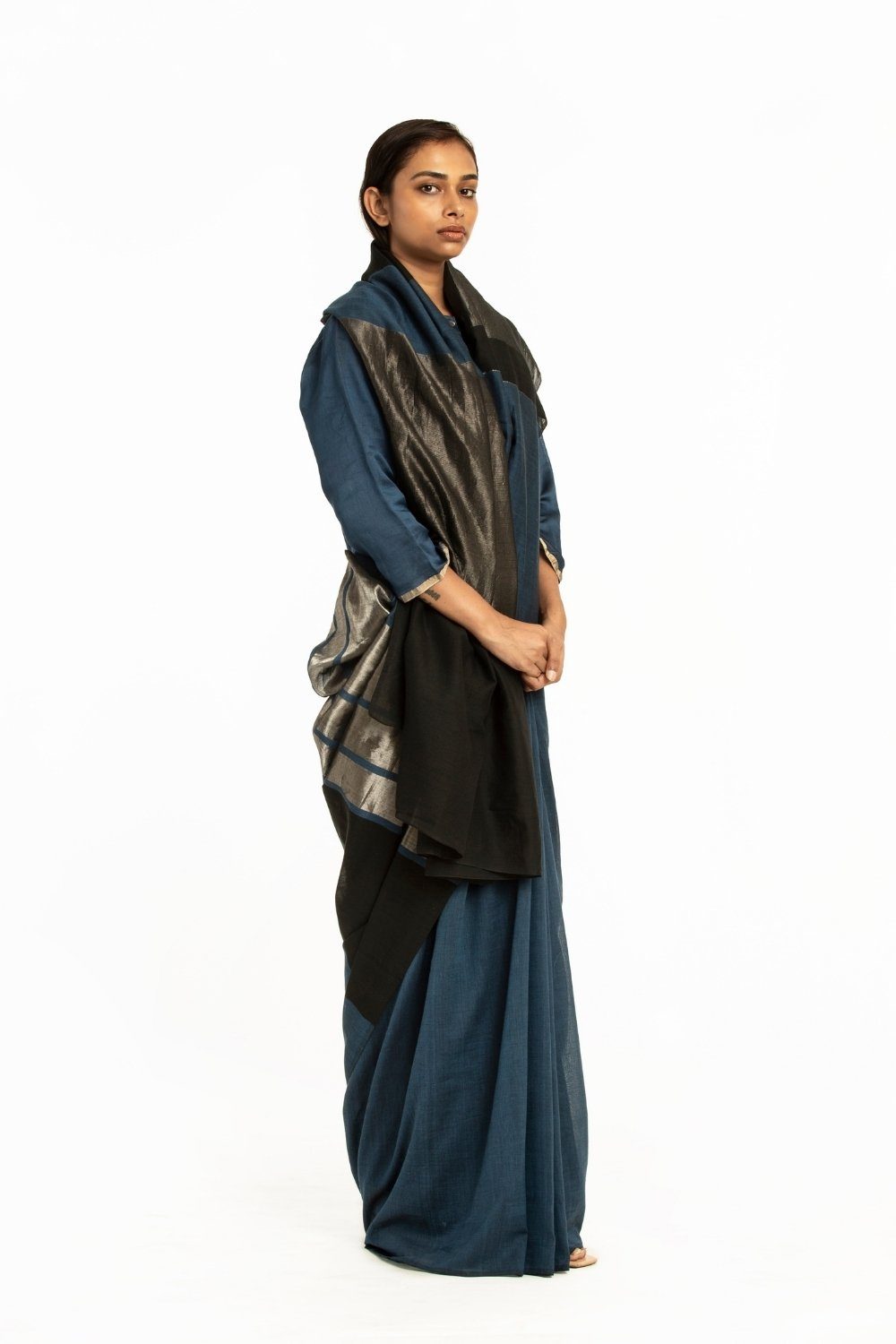 Handwoven Blue Black Engineered Cotton Saree Fashion Akaaro