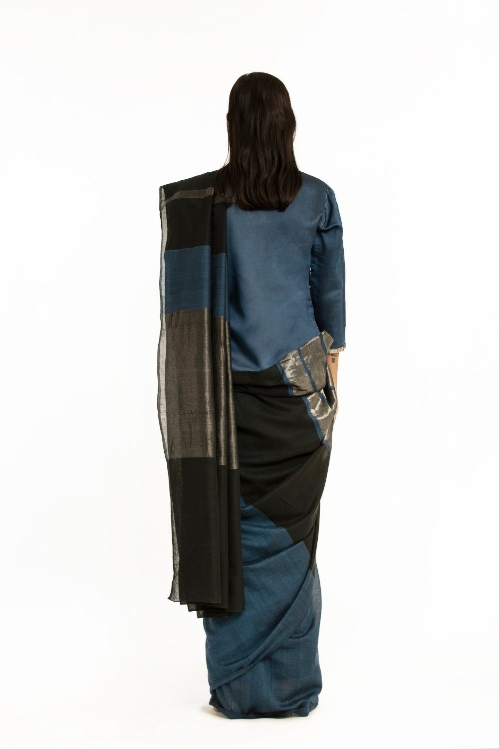 Handwoven Blue Black Engineered Cotton Saree