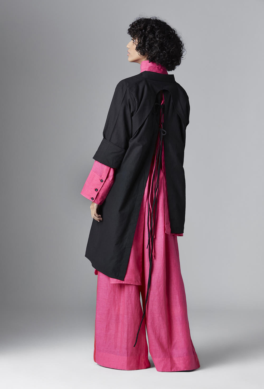 Chola’s universe begins with thoughtful materials. Recycled cottons, post-consumer fabrics, and free-cutting techniques come together in a kind of mindful choreography—one that honours form without creating waste, and prioritises movement over rigidity. This is clothing that feels lived-in yet architectural; pared-back yet quietly avant-garde.
