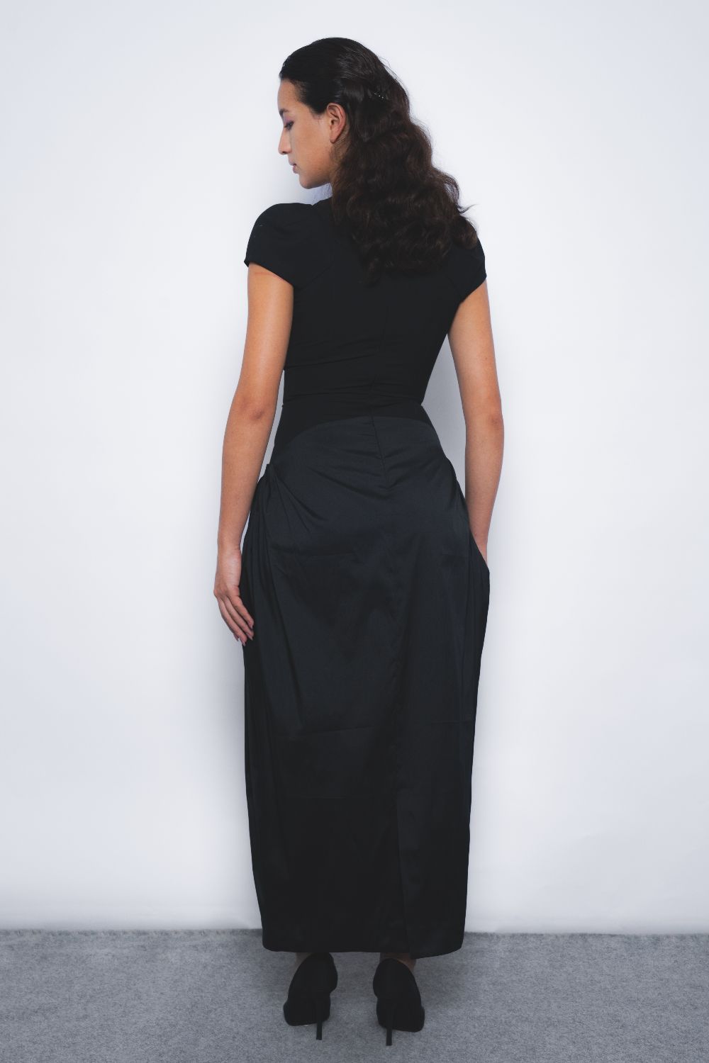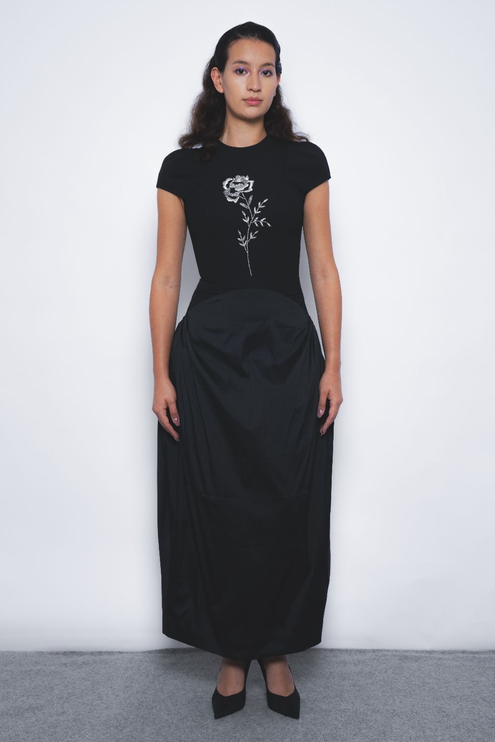 An architectural silhouette, a structured bodice sculpting the torso with a hand embroidered 'rose' with fine silver French bulion wires, finished with a capped sleeve with dart details defining the shouders. The lower half of the dress is cut in tafetta with pleats tucked at the sides creating an overall structured yet fluid garment silhouette.