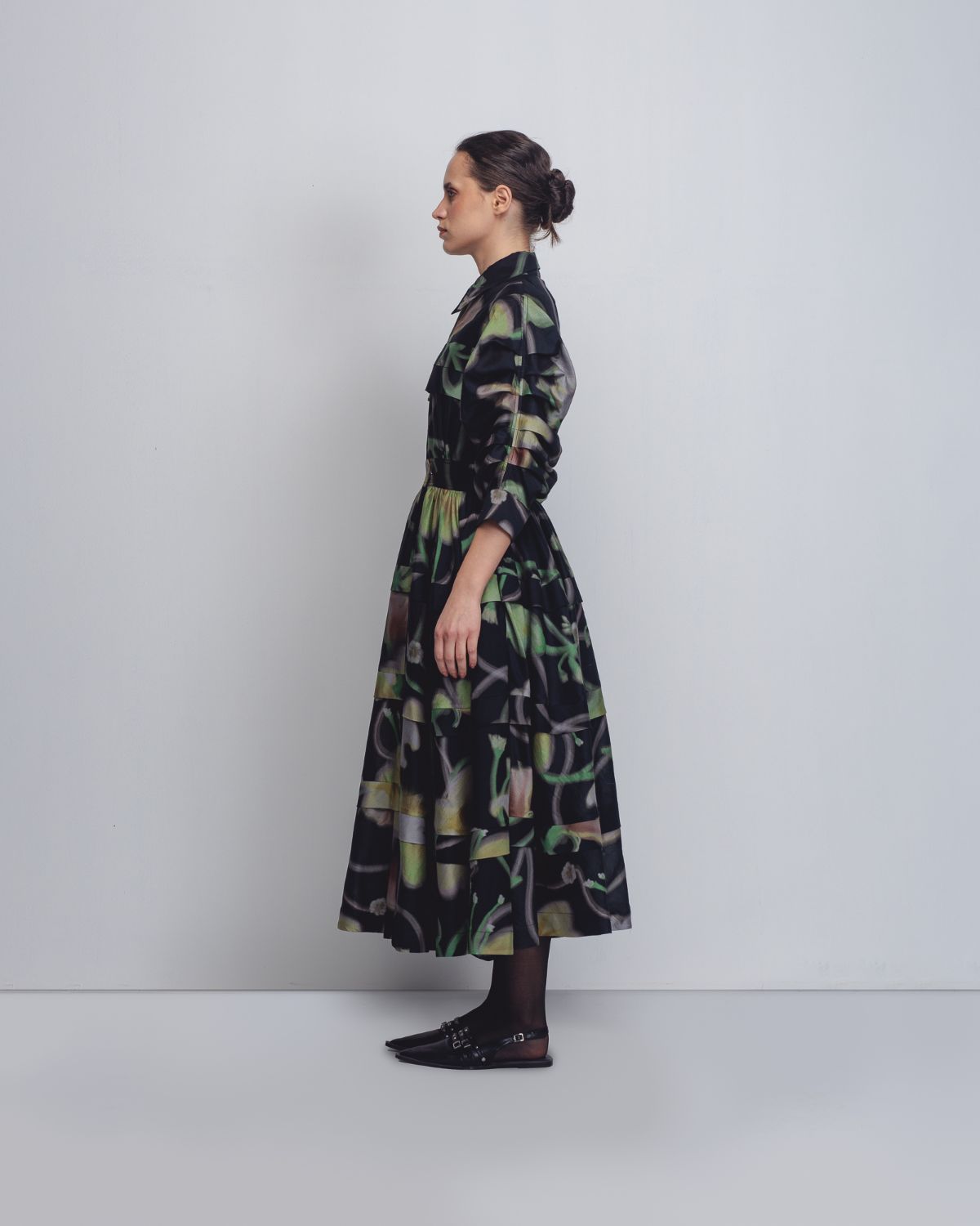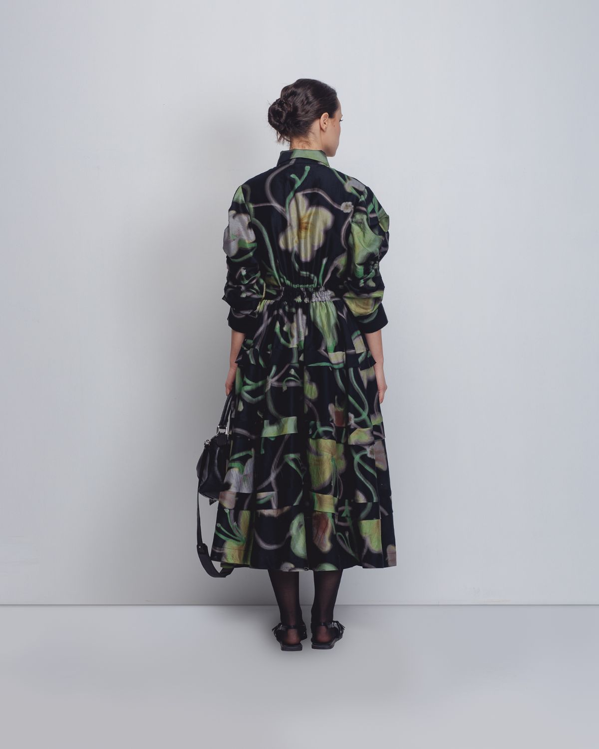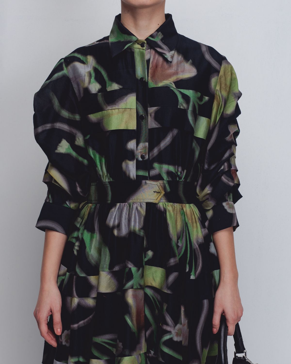 A classic feminine silhouette crafted in Chanderi, featuring in-house designed floral prints. The garment is shaped with a cinched waistline and strategically placed horizontal pleats that enhance its fall and structure. The sleeves are detailed with horizontal pleating, adding sculpted volume and a refined architectural finish. The model is 5'8, and the dress length is 50 inches.