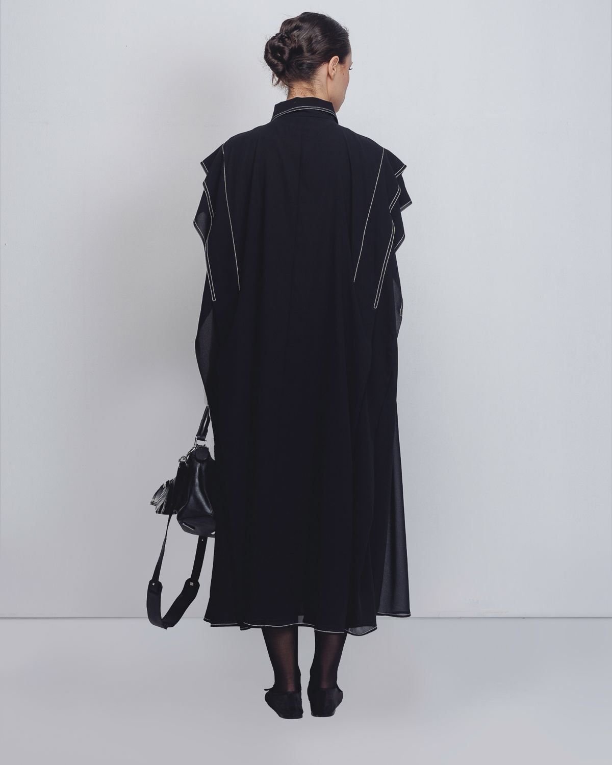 Cut in georgette, this garment features pleating at the shoulders that adds soft volume and creates a fluid, flowy silhouette. It is designed with a full front opening and finished with a collar. 50"