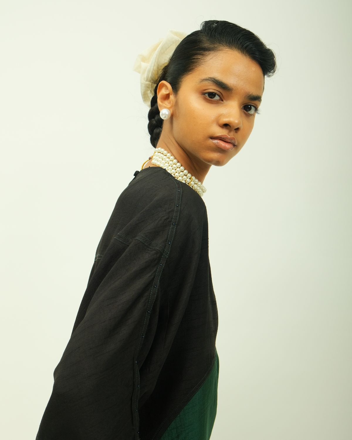 Anti fit, zero neckline, dropped shoulders with wide sleeves, perfect for layered styling & contemporary wardrobes, light weight raw silk textile. Single piece.