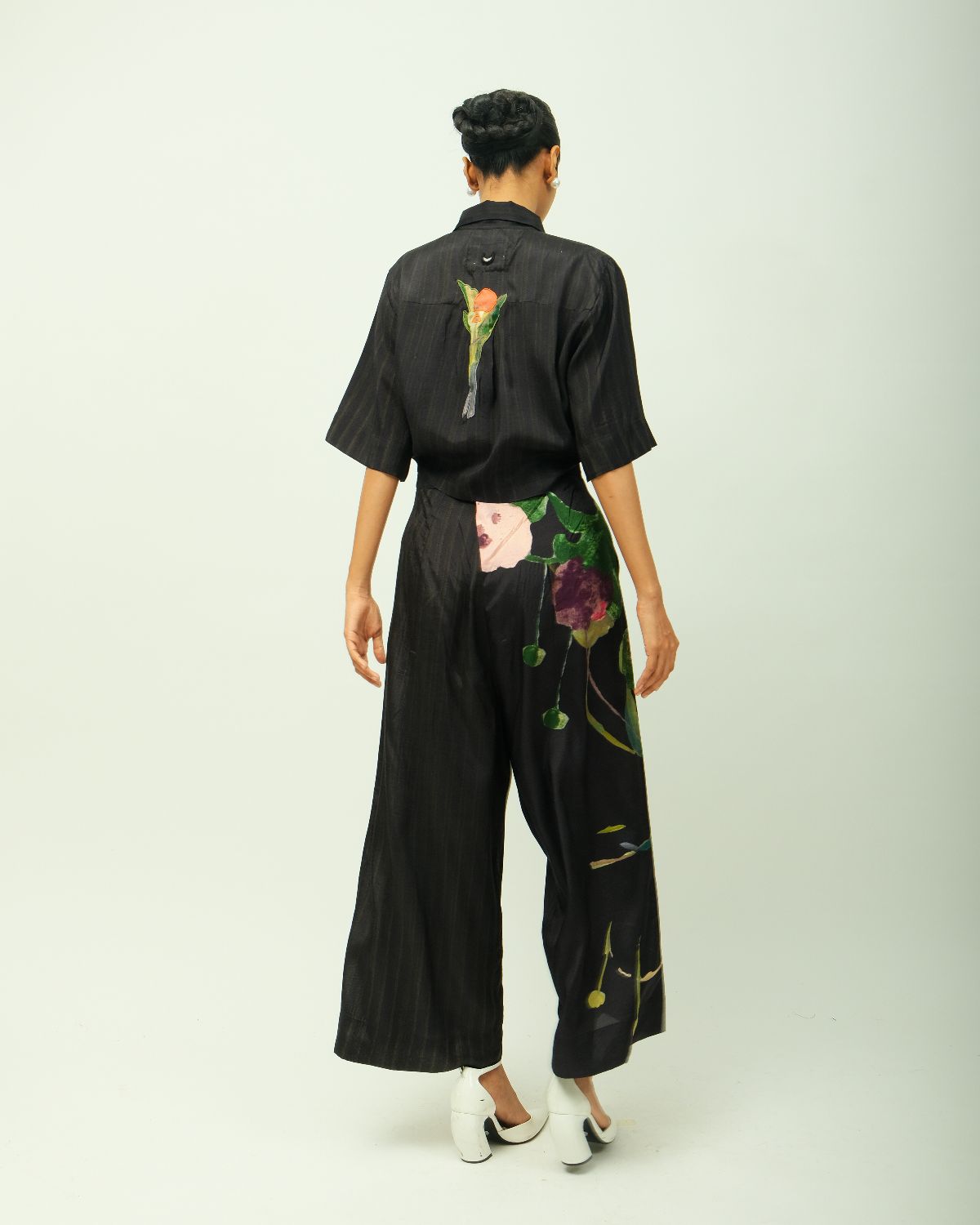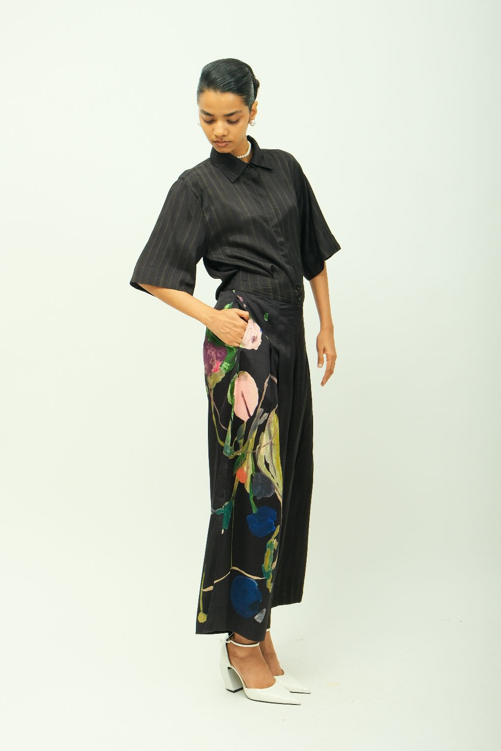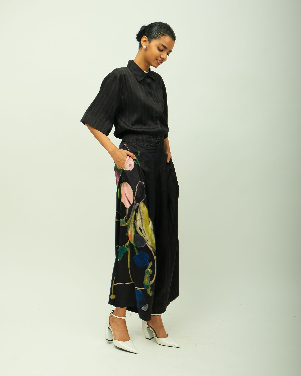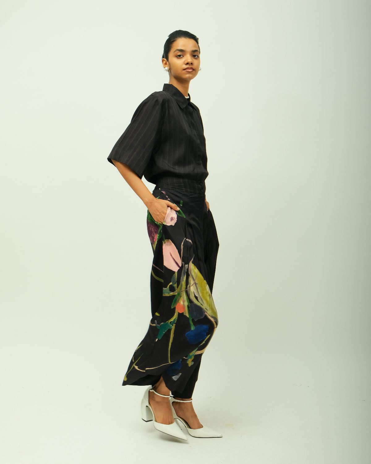 A relaxed-fit collared shirt in black with subtle vertical stripes, featuring elbow-length sleeves and full placket for a clean, structured silhouette.