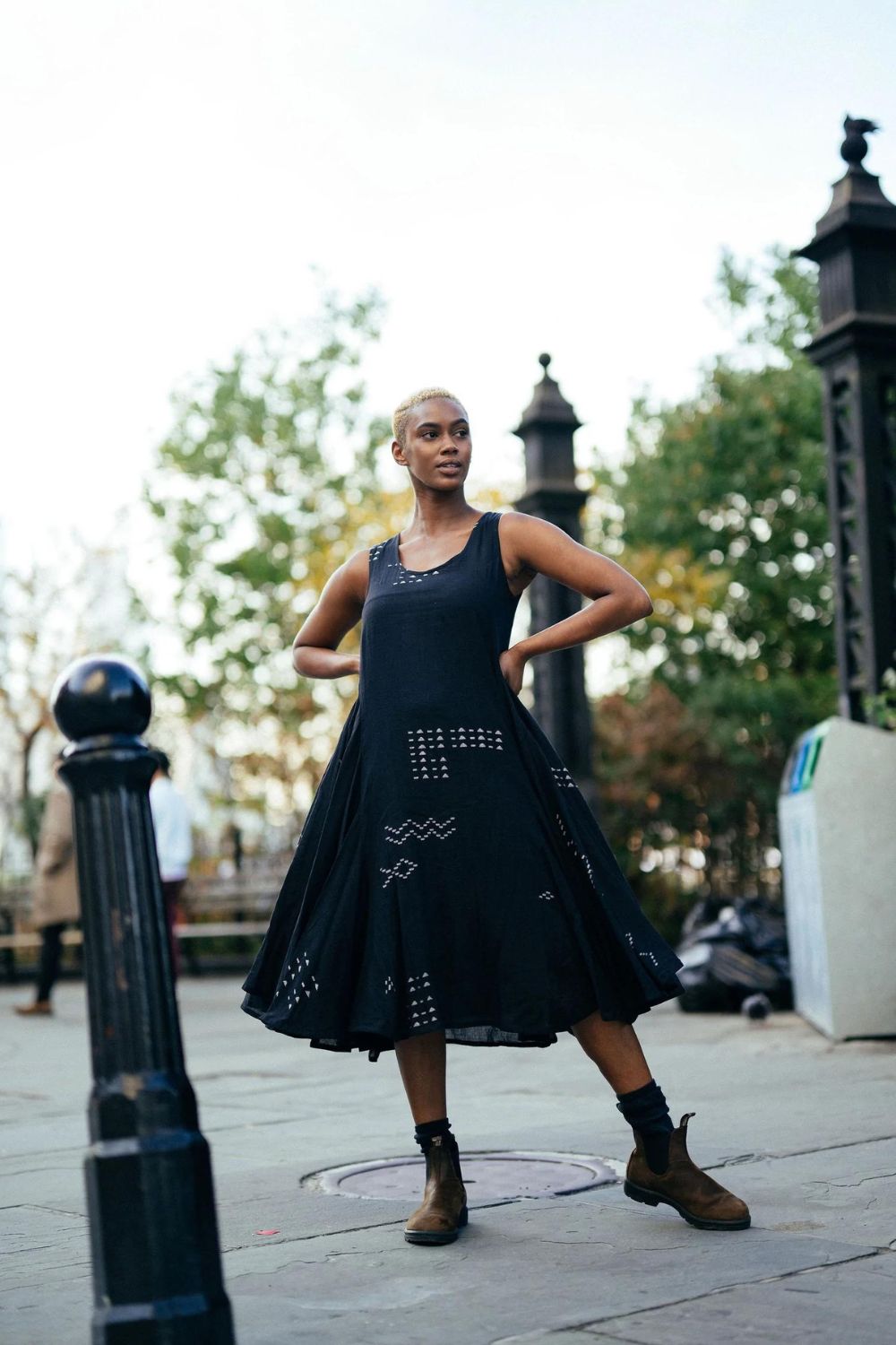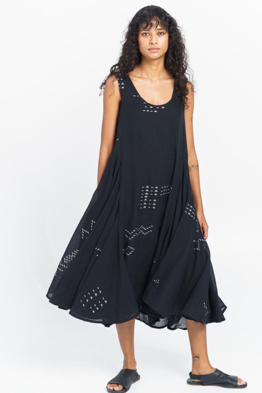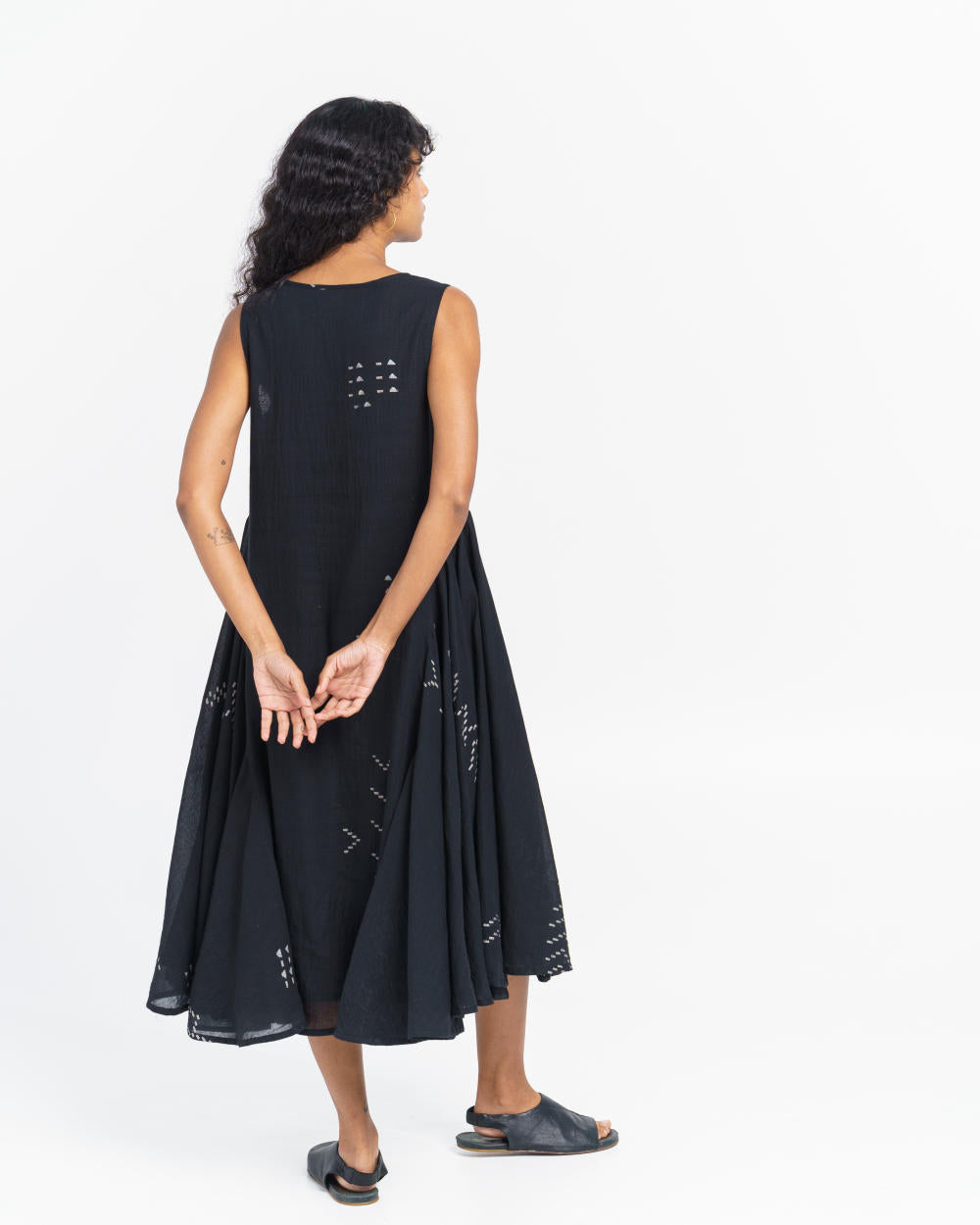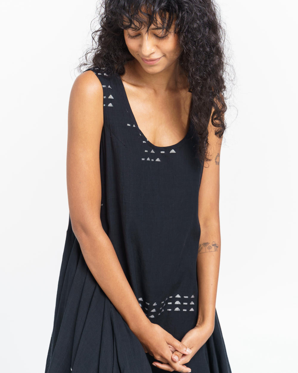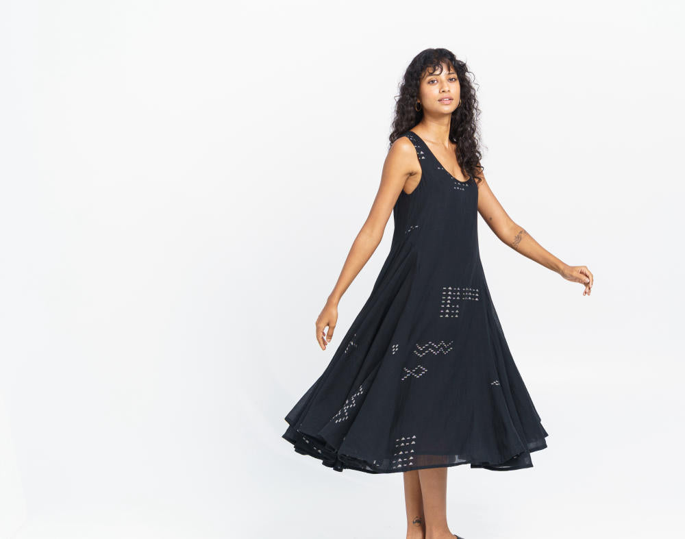 A perfect summer dress for all day comfort as well as evening outings. The monochrome palette with handwoven abstract motifs adds character to the flowy silhouette of the dress. Gently gathered on the sides to create volume, detailed with scoop neckline and roomy side pockets, designed for enhanced movement. It is tailored from handwoven jamdani fabric made by extremely talented weavers of East India.