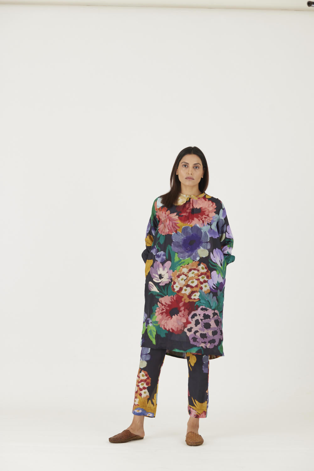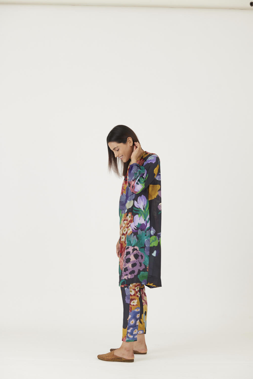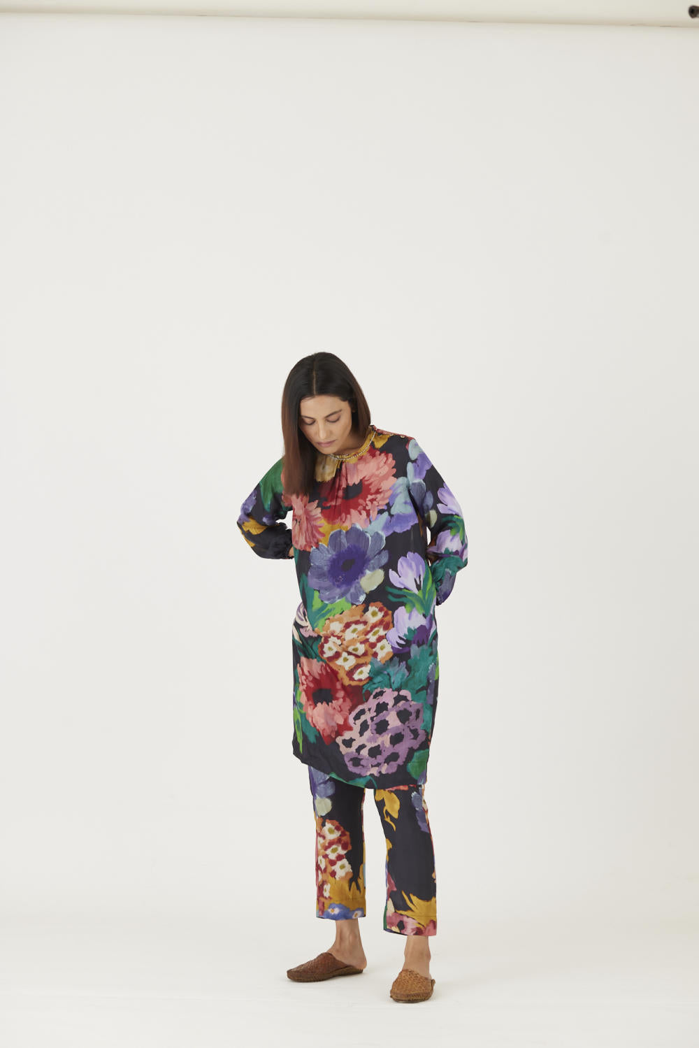 The set is crafted in the Farah print carefully printed on Pure silk featuring white pearls on the neck.