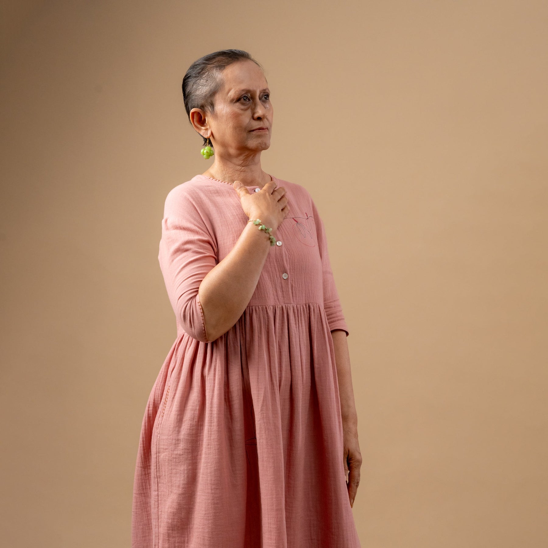 Description: Oversized organic cotton dress with gathers, button details, randomely placed doodle embroideries and side pockets