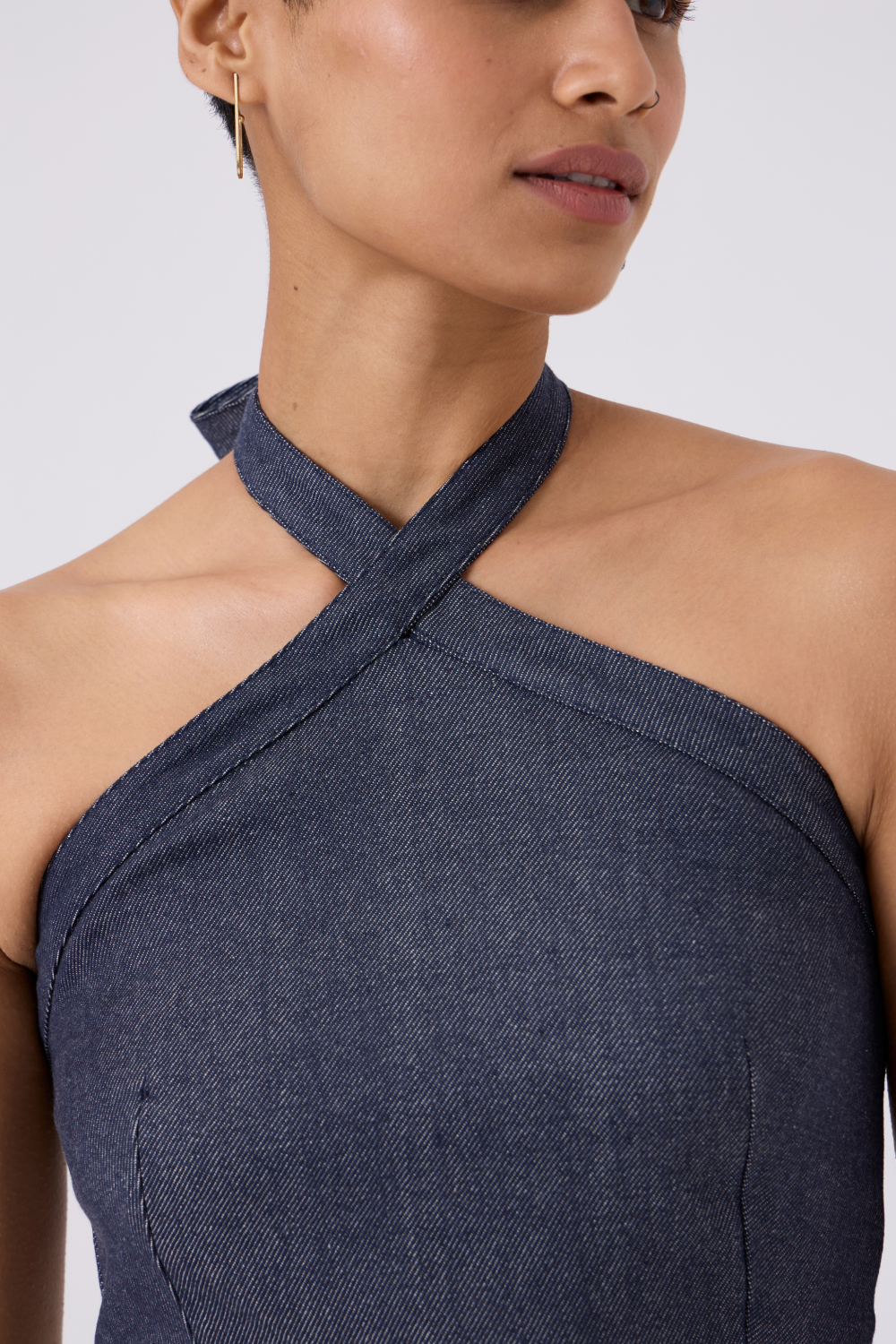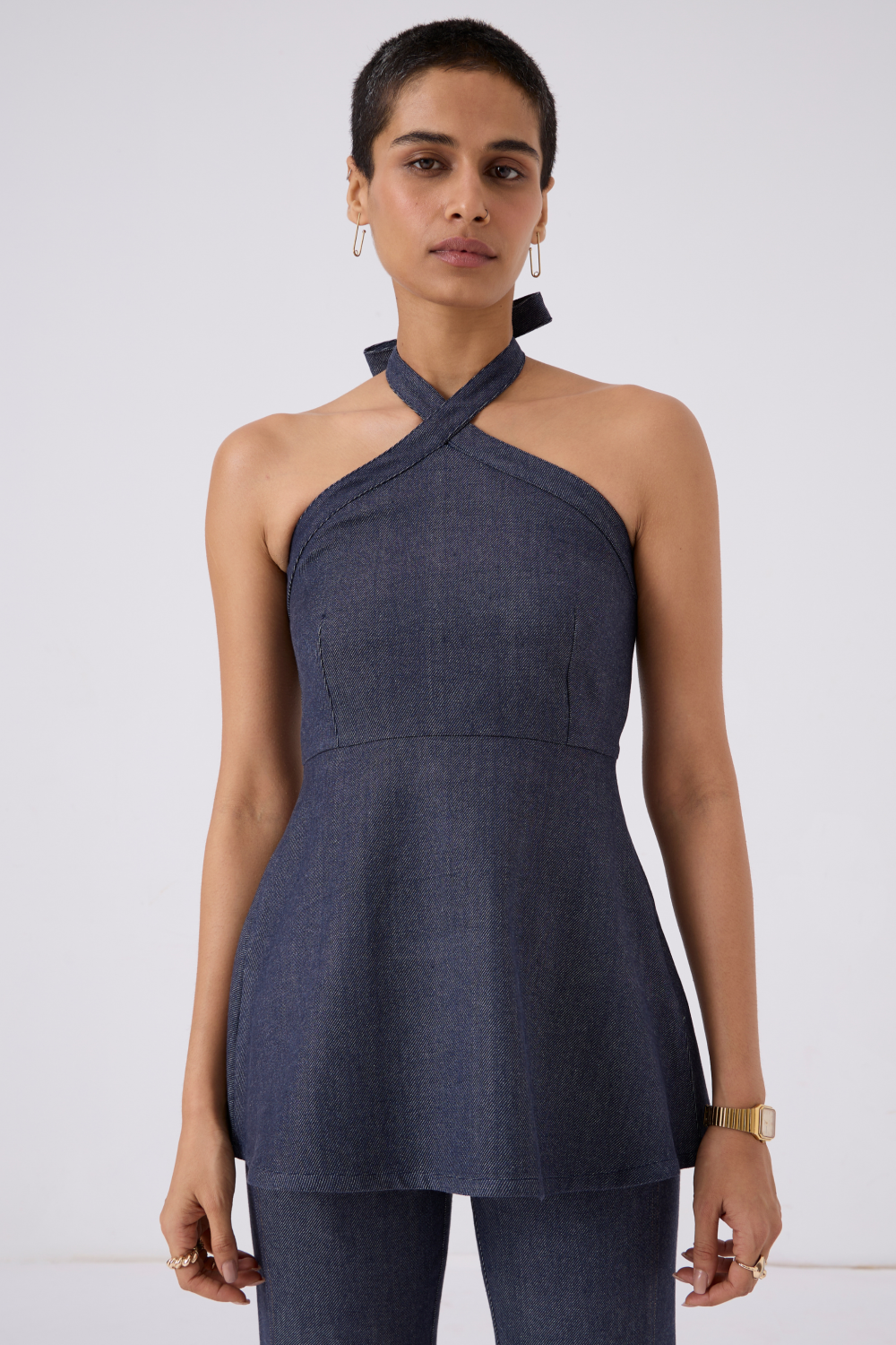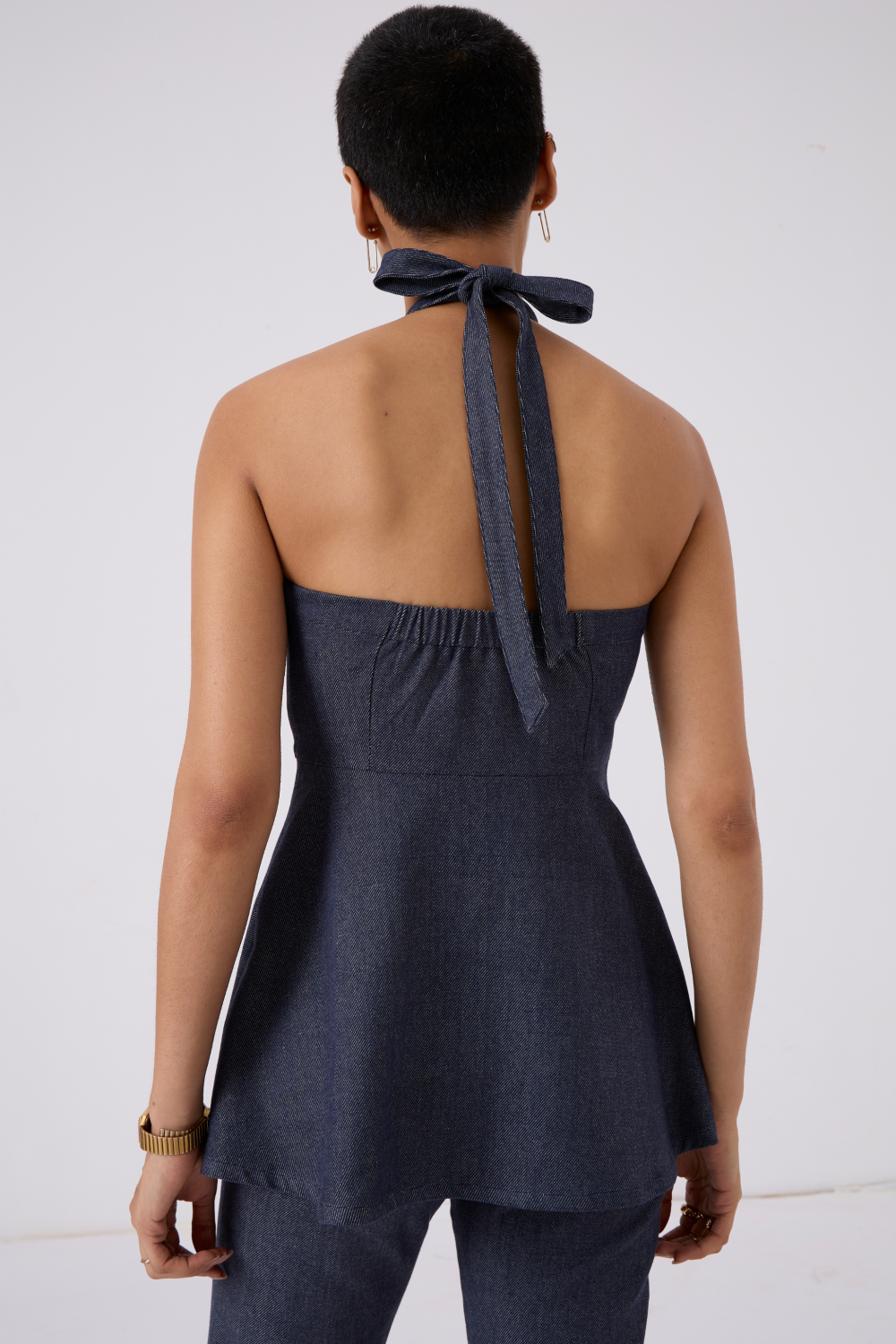 A halter neck top with adjustable tie and elasticated back for tailored fit.