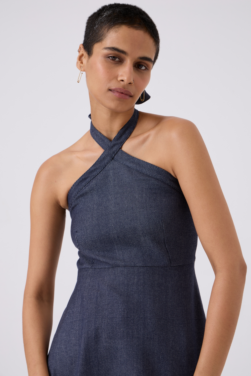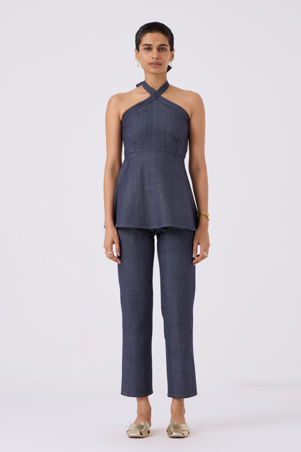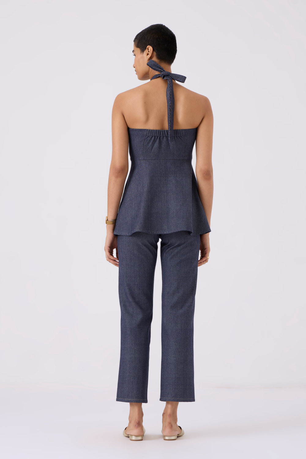 A halter neck top with adjustable tie and elasticated back for tailored fit.