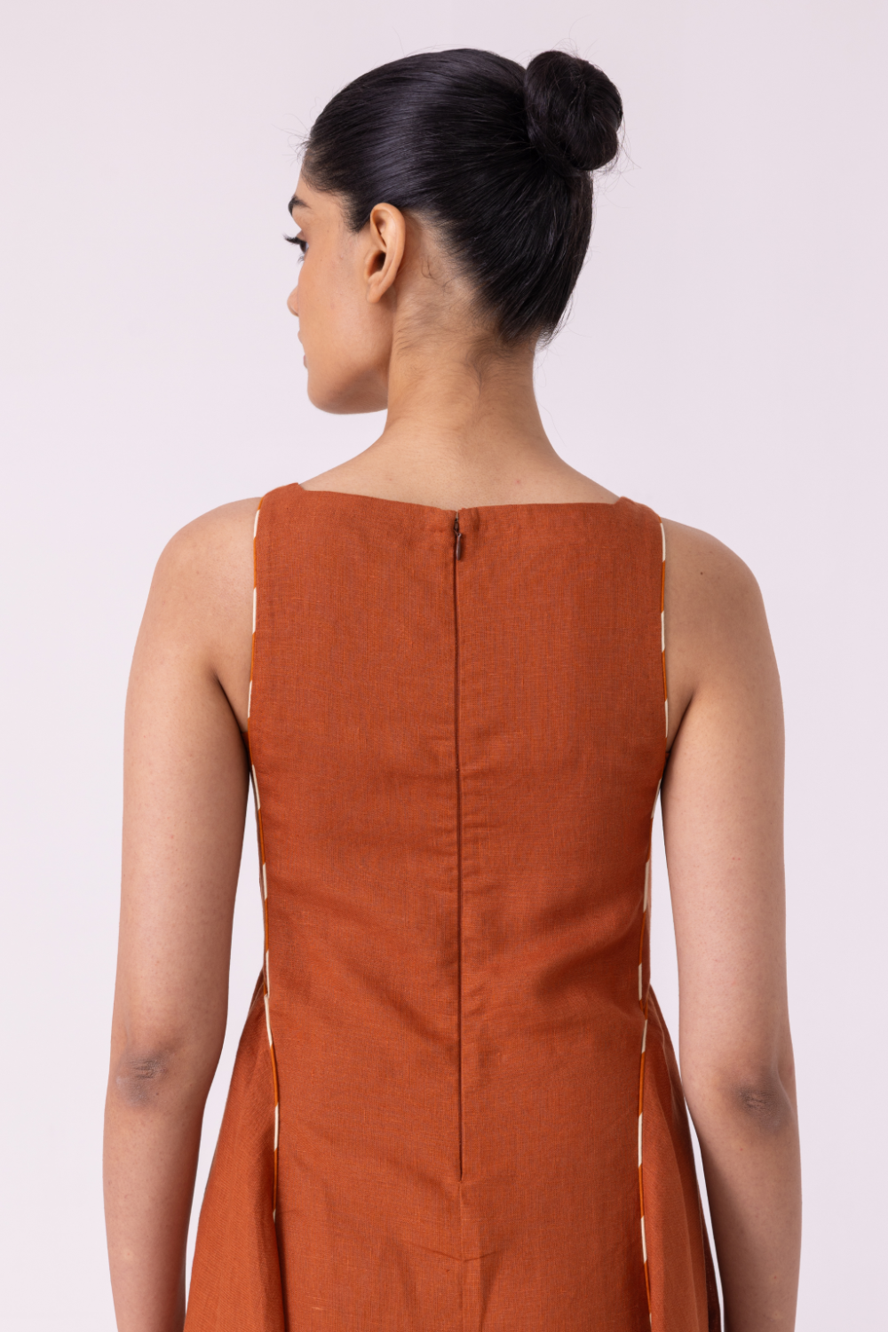 The square neckline sits the same front and back - a small architectural decision that changes the whole conversation. Corded piping traces the panels with a precision that reveals itself slowly. Fit and flare, but with something to say.
