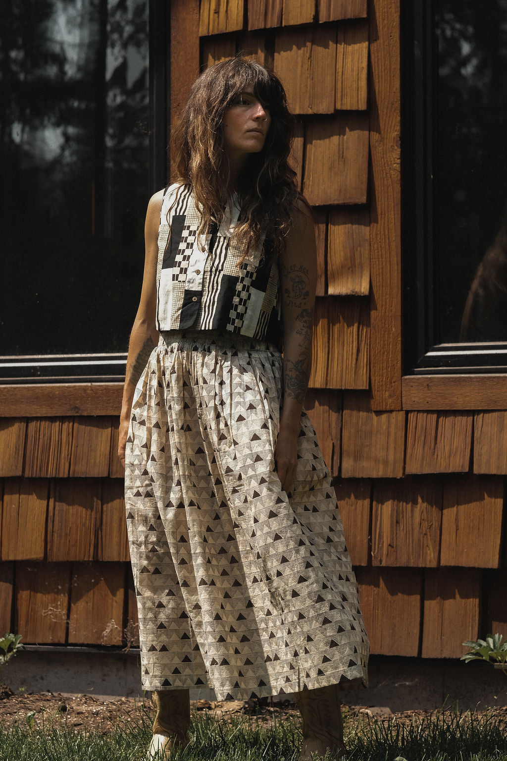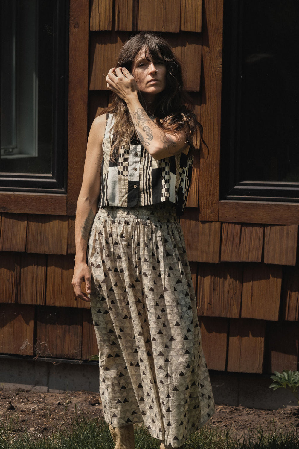 This eye-catching sleeveless top features a unique patchwork design in a sophisticated palette of black,white,and tan designed in collaboration with World of Crow and Erica and Dee Dee.The various rectangular panels showcase a mix of patterns, including solid blocks, subtle stripes, and small checks, creating a dynamic and artistic aesthetic. It has a rounded neckline and a relaxed fit, making it a versatile piece perfect for adding a touch of contemporary flair to any outfit.