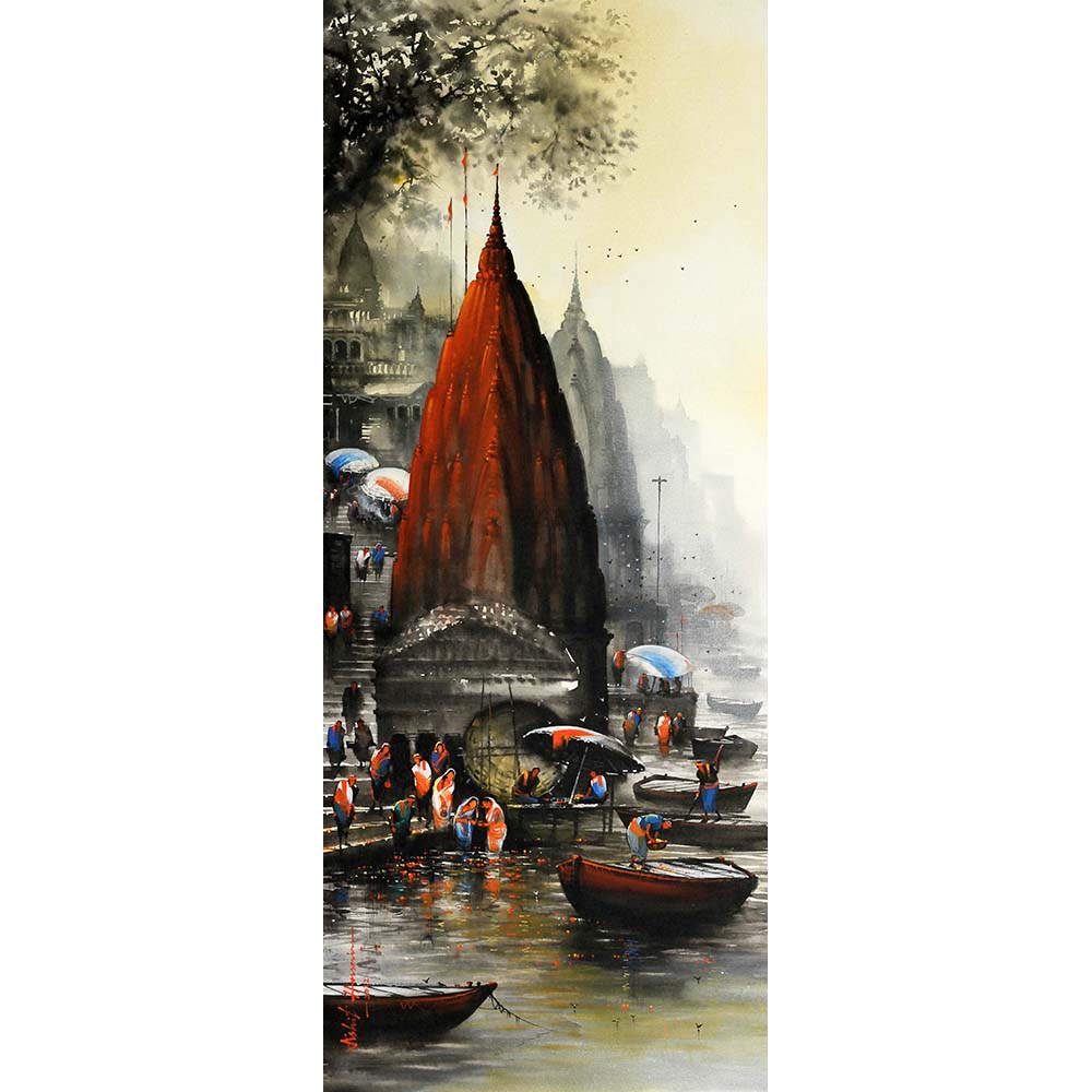 Indian culture, its vibrant colours and the idea of secularism inspire the artist and the same is reflected in his artworks. The metropolitan cities of India stimulate his creative thought process and a lot his paintings depict this. Contrasting the modern with the past, inspiration is picked up from the everyday life around us – the infrastructure, the people and the busy chaotic lives of the cities. His works depict his thoughts on life and it’s past. His current muse is the Eternal City of Benares – one of the holiest cities in India, where pilgrims flock to the place to take a dip in the holy Ganges River, which is believed to absolve one from all sins.