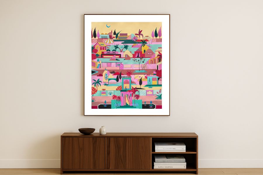 Each piece begins with a study of shape and hue — colours borrowed from mango skies and twilight hours — before she layers in the imaginary: architecture, flora, figures, and symbolic objects that appear to belong to another time. The result is an immersive visual language that oscillates between the real and the fantastical, evoking both nostalgia and curiosity.