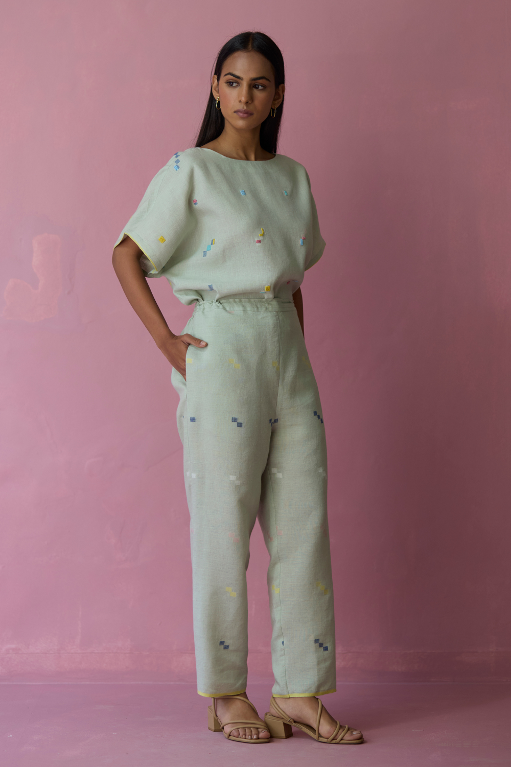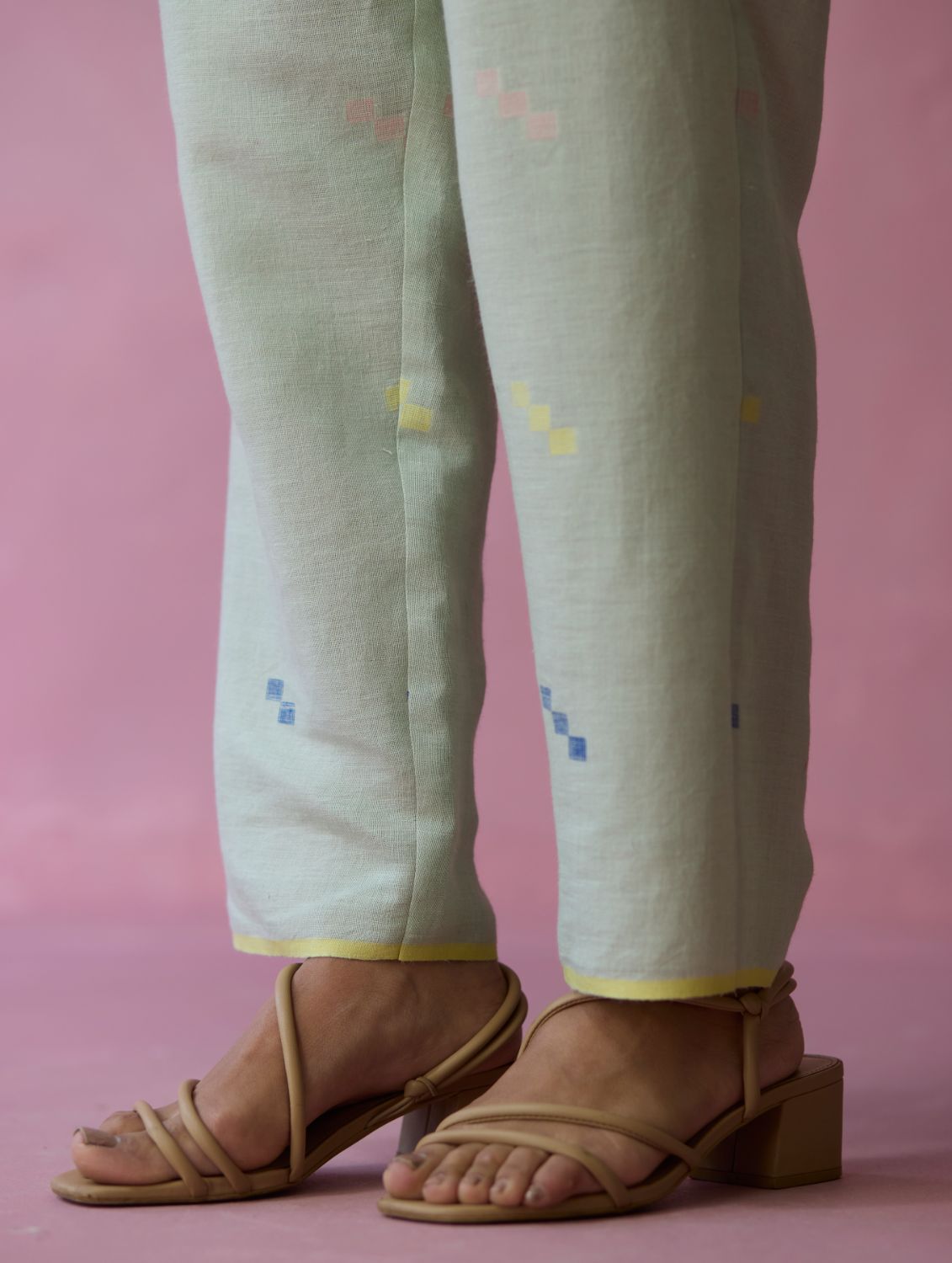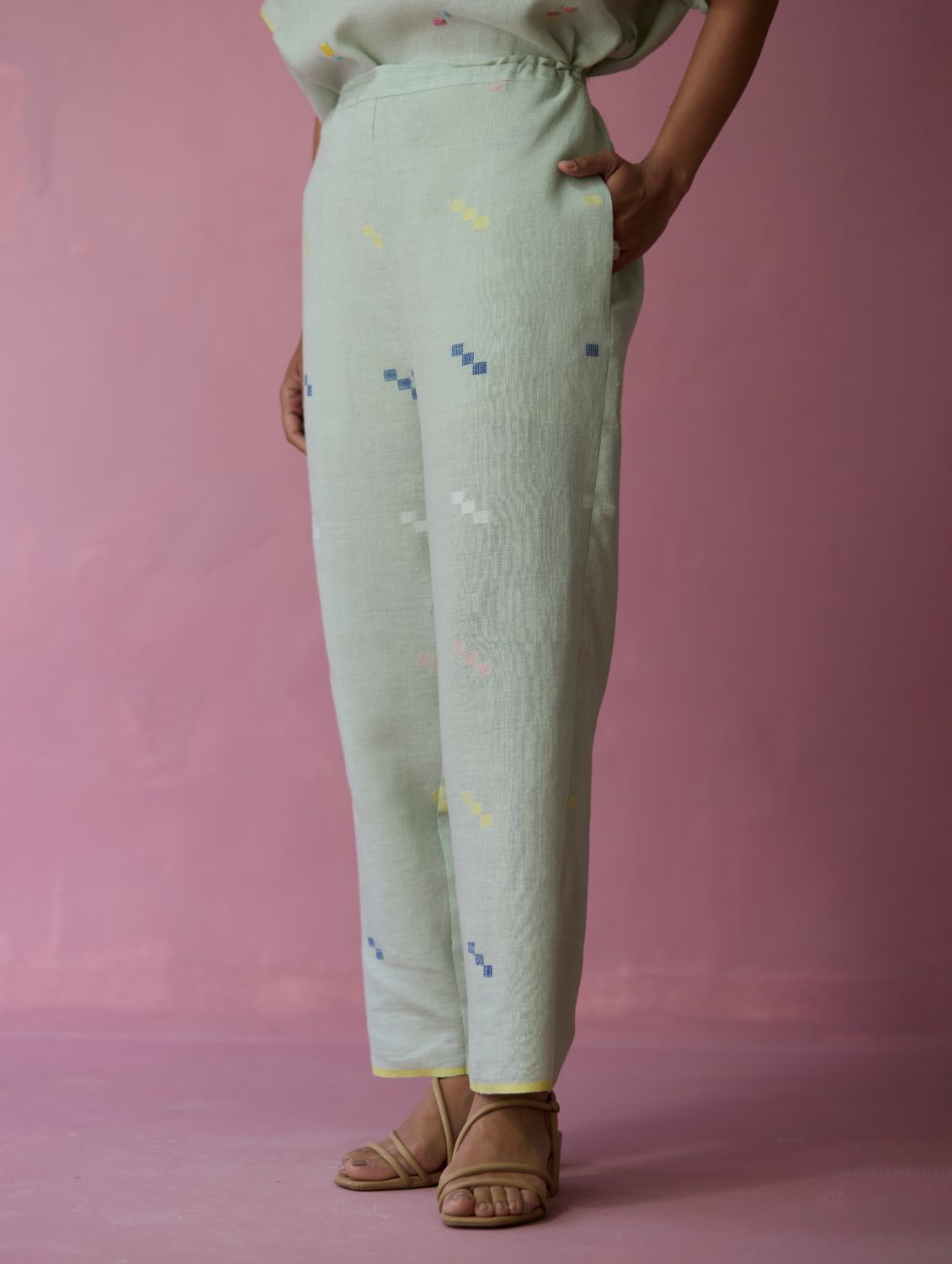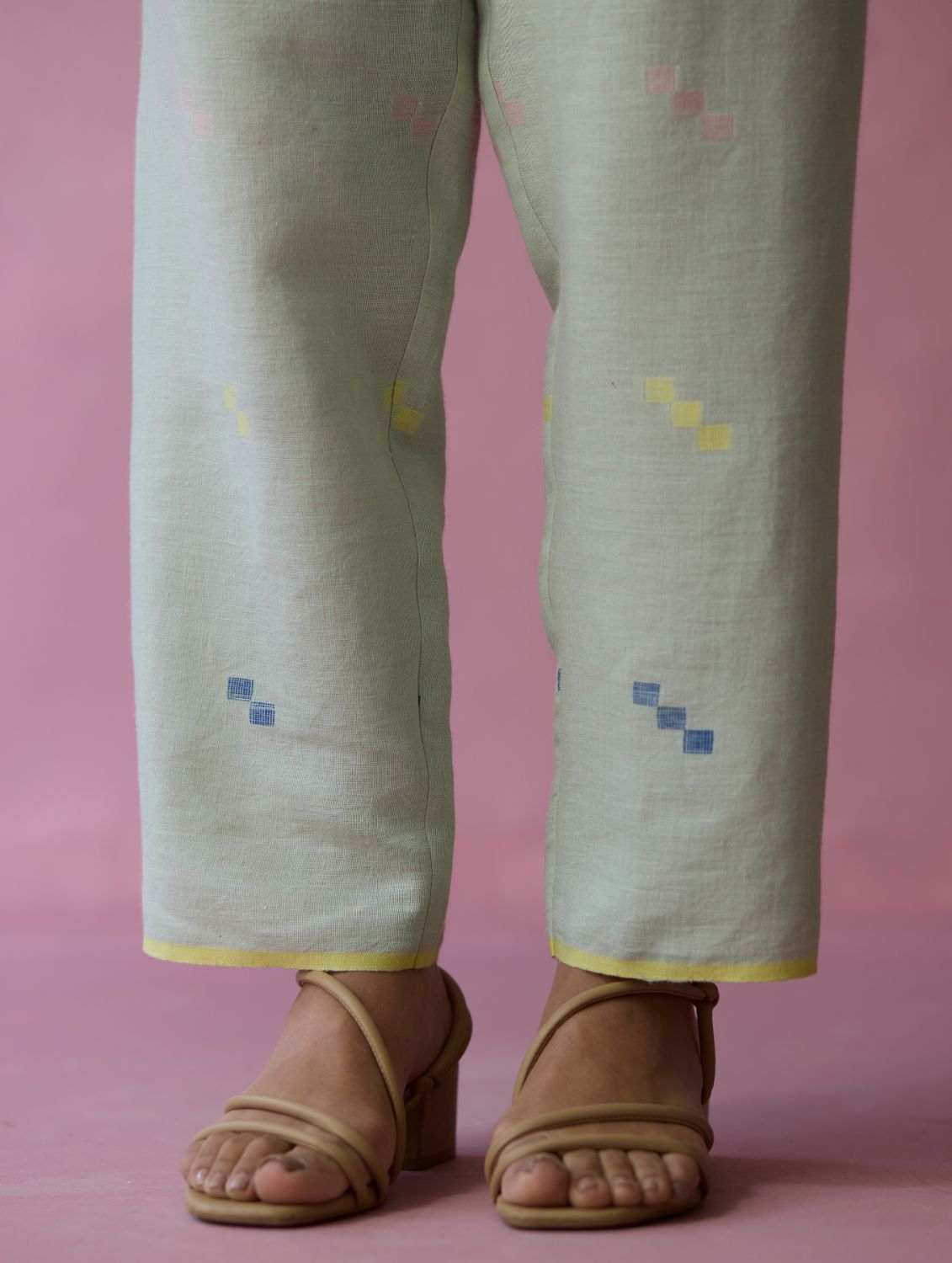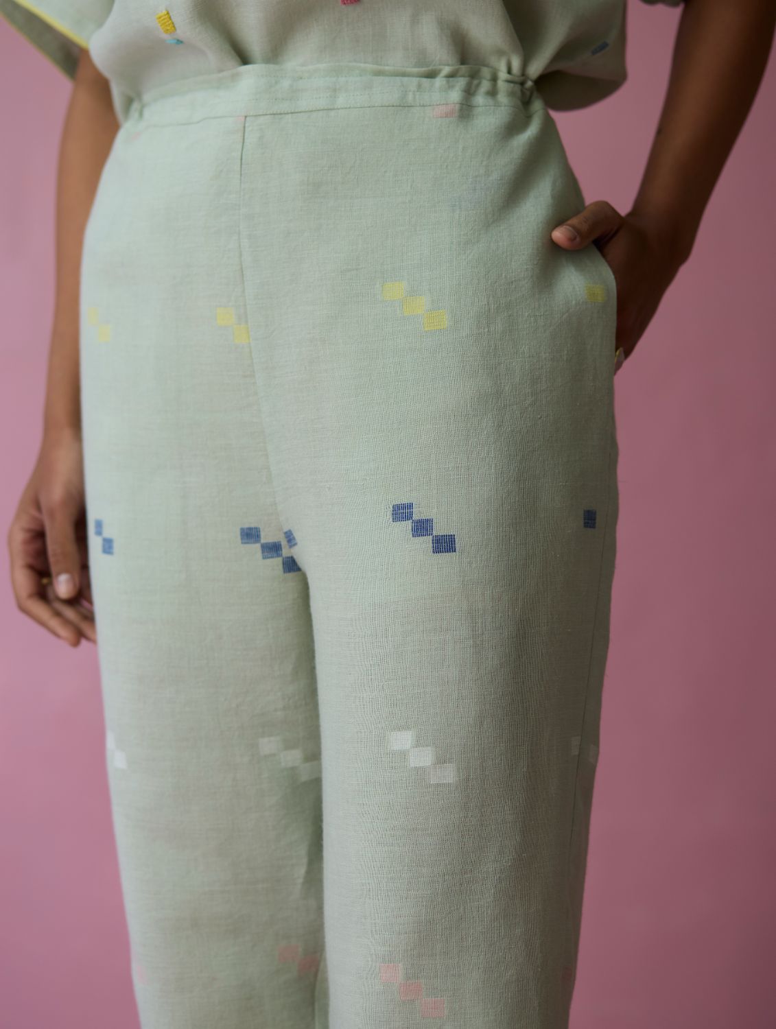 Our signature tapered pants handcrafted in our soft custom jamdani linen with a distinct varying 4 colour square motif weave. Thoughtfully designed with a slightly relaxed silhouette, side pockets, and an elasticated back waistband with a drawstring for a adjustable fit. Finished with a contrast-colored woven selvedge at the bottom hem.