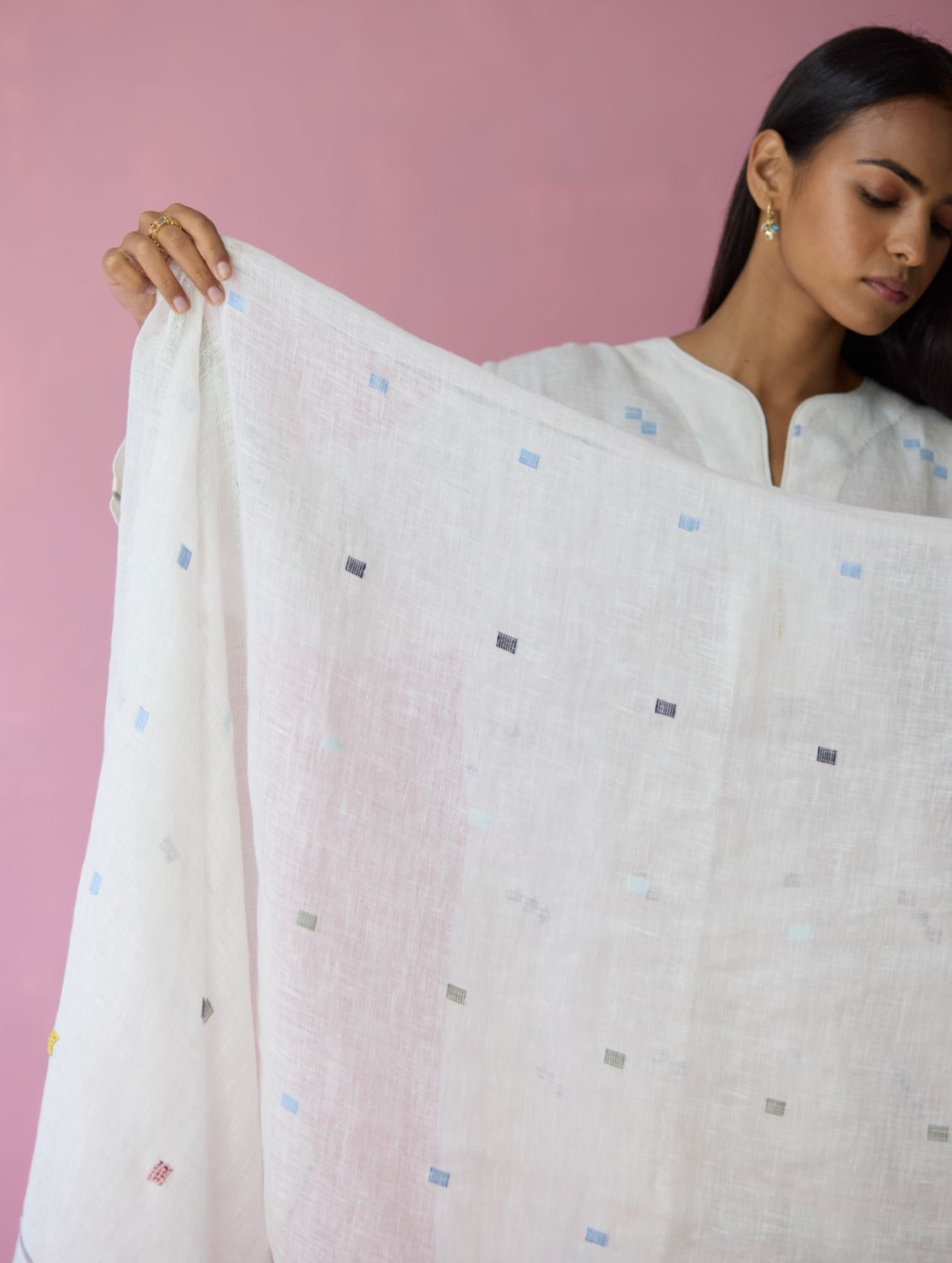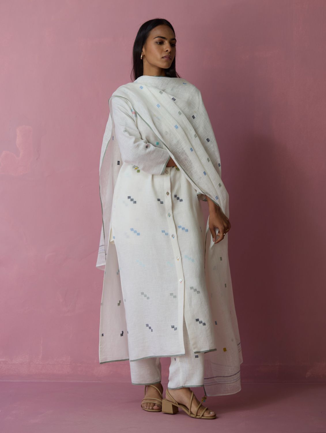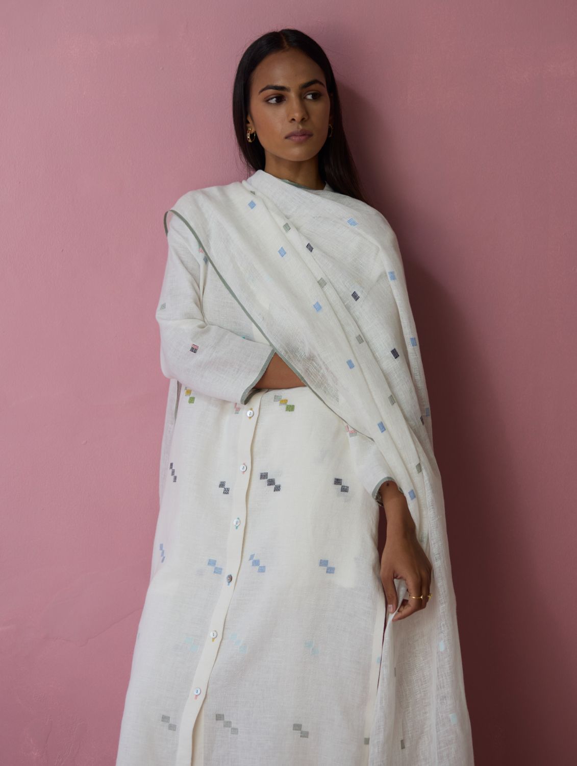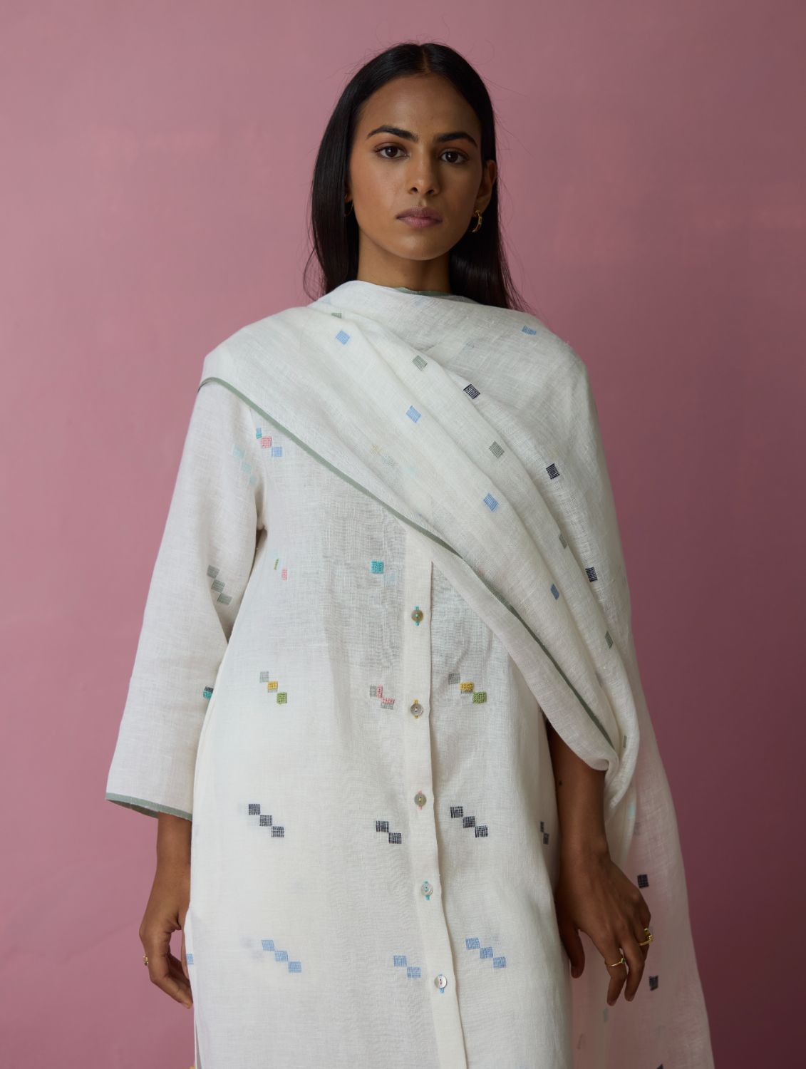 This soft lightweight dupatta is handwoven in our soft pure jamdani linen with an intricate 4 colour motif weave in repeated 1-2-3 squares with multi-coloured stripe along the two edges and a contrast woven selvedge detail. Detailed with intricate hand-embroidered french knots on the motifs and finished with colourful tassels at the edges - the Mila dupatta is our favourite to pair with our kurta sets or dresses.