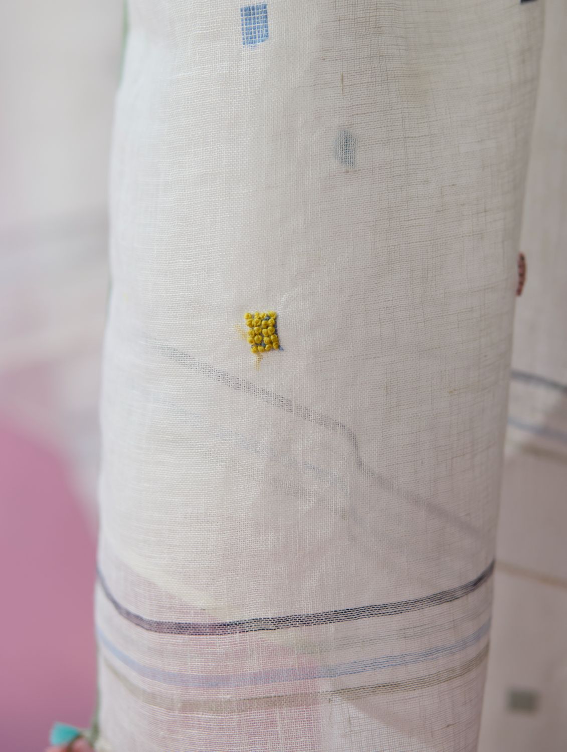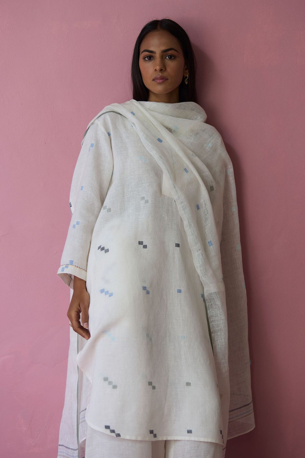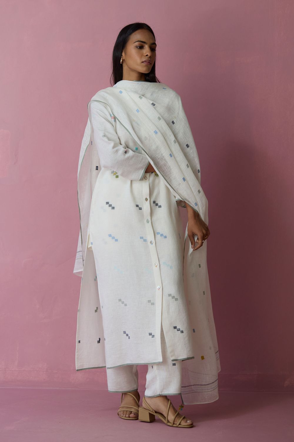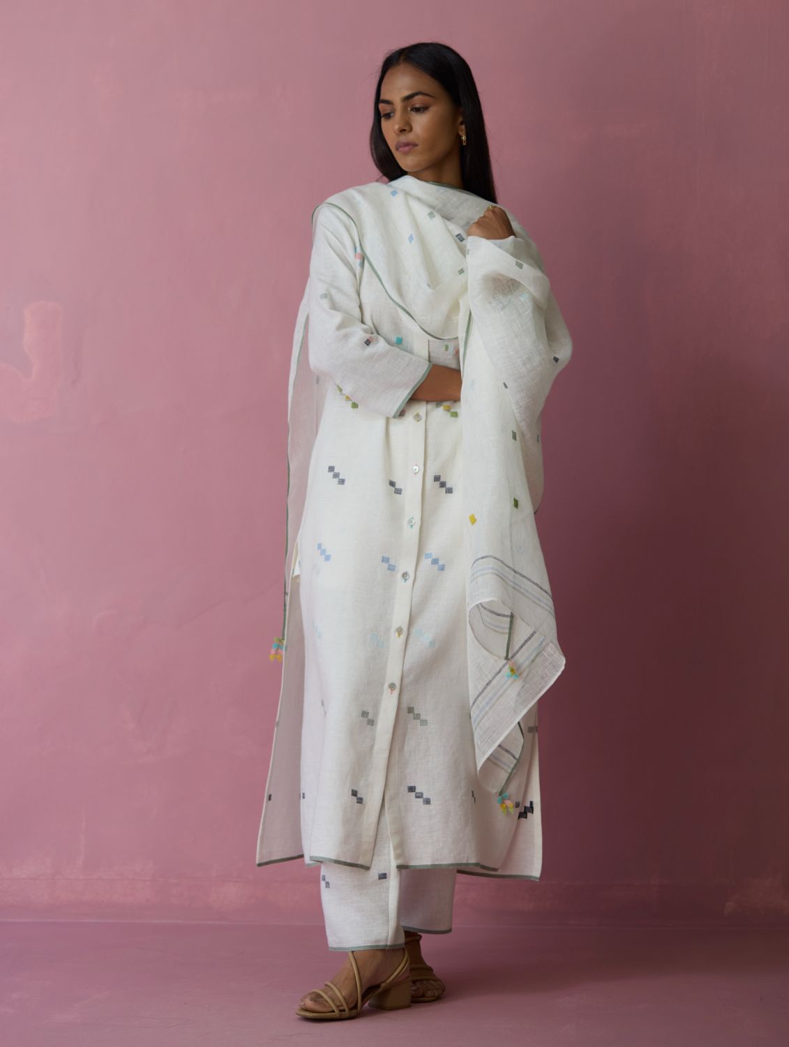 This soft lightweight dupatta is handwoven in our soft pure jamdani linen with an intricate 4 colour motif weave in repeated 1-2-3 squares with multi-coloured stripe along the two edges and a contrast woven selvedge detail. Detailed with intricate hand-embroidered french knots on the motifs and finished with colourful tassels at the edges - the Mila dupatta is our favourite to pair with our kurta sets or dresses.