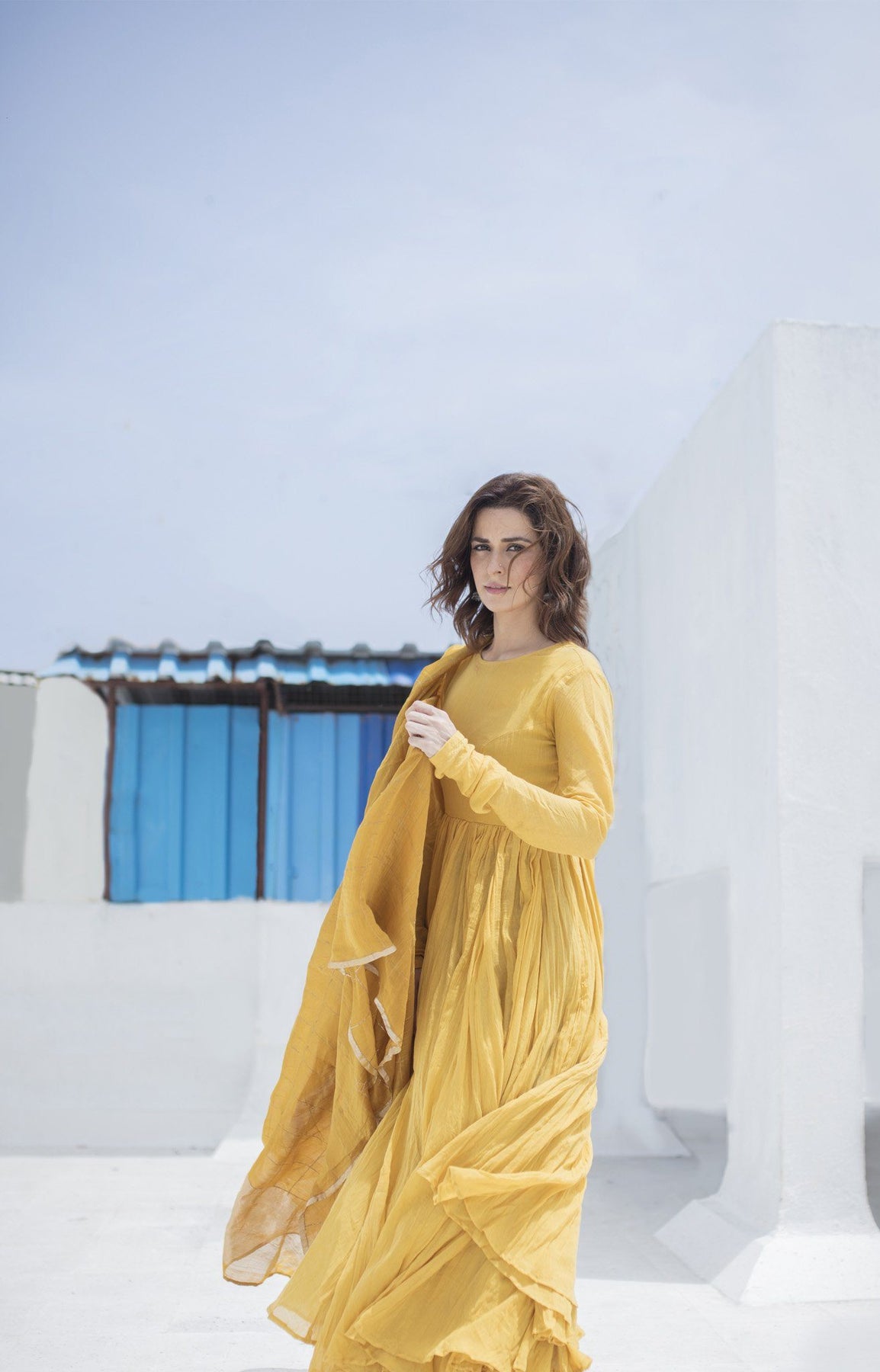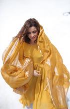 A beautiful pattern of kurta with gathered fabric at the waist with an elongated full sleeve. It is made with 100% soft cotton fabric paired with chokor hand-embroidered pitta dupatta in chanderi.