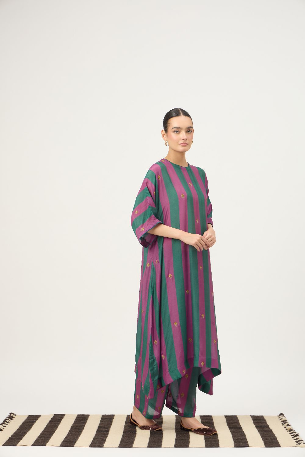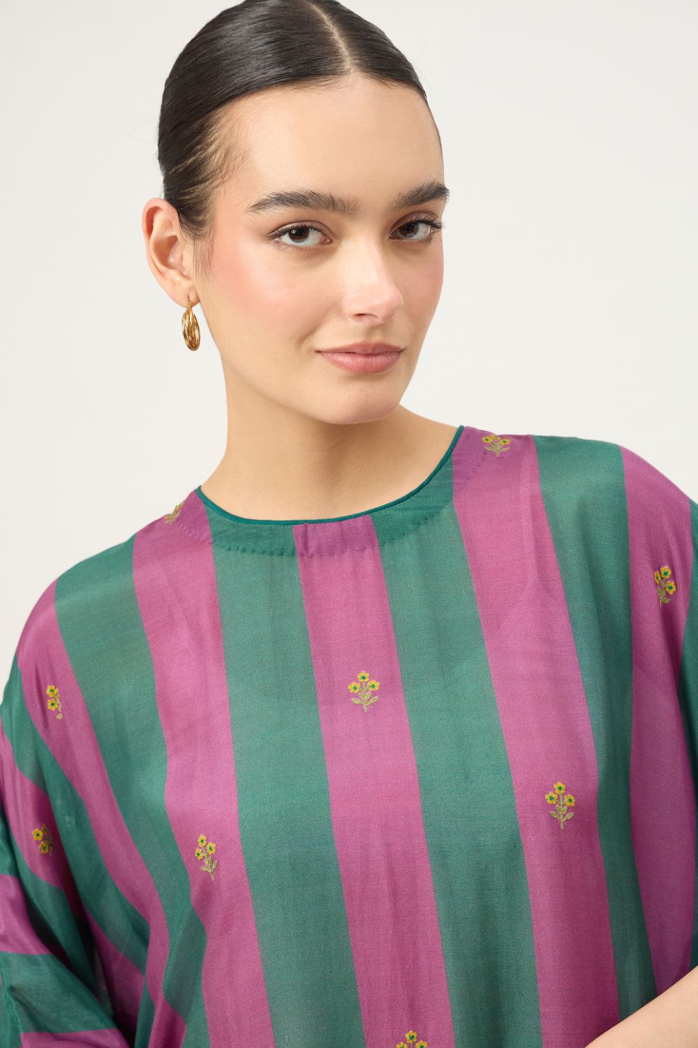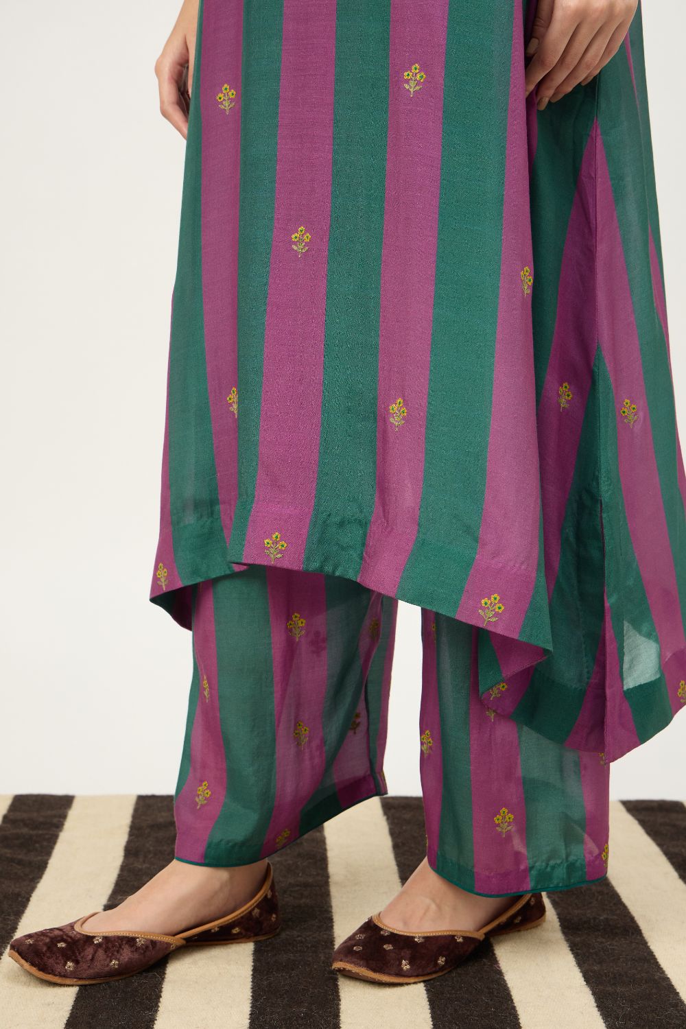 Made from a soft cotton silk blend, the fabric features a gentle sheen and fluid drape, making it ideal for all-day wear. The bold vertical stripes in rich, contrasting hues lend a contemporary edge, while delicate machine embroidery motifs add subtle artisanal charm.