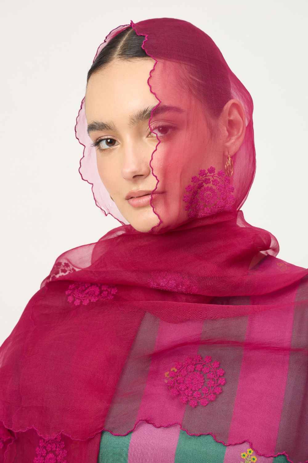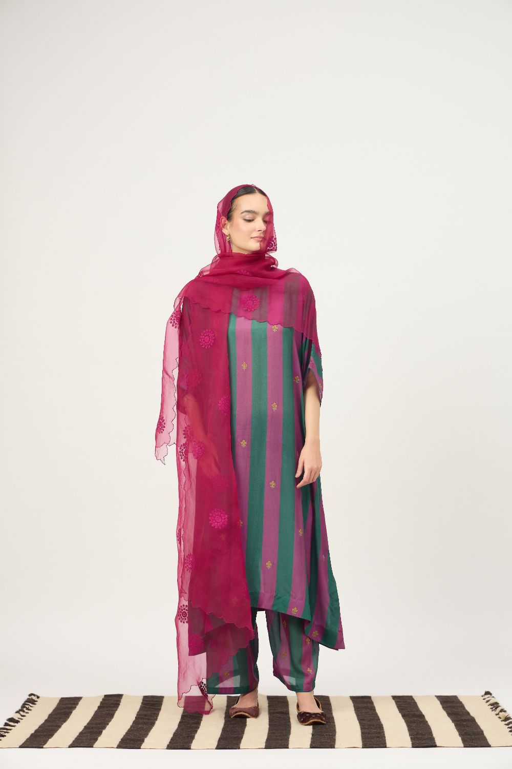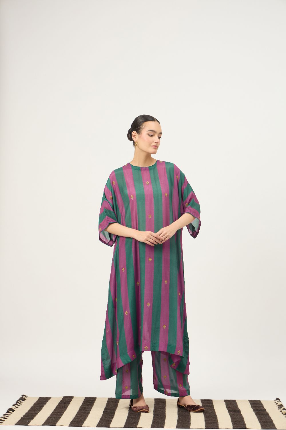 Made from a soft cotton silk blend, the fabric features a gentle sheen and fluid drape, making it ideal for all-day wear. The bold vertical stripes in rich, contrasting hues lend a contemporary edge, while delicate machine embroidery motifs add subtle artisanal charm.