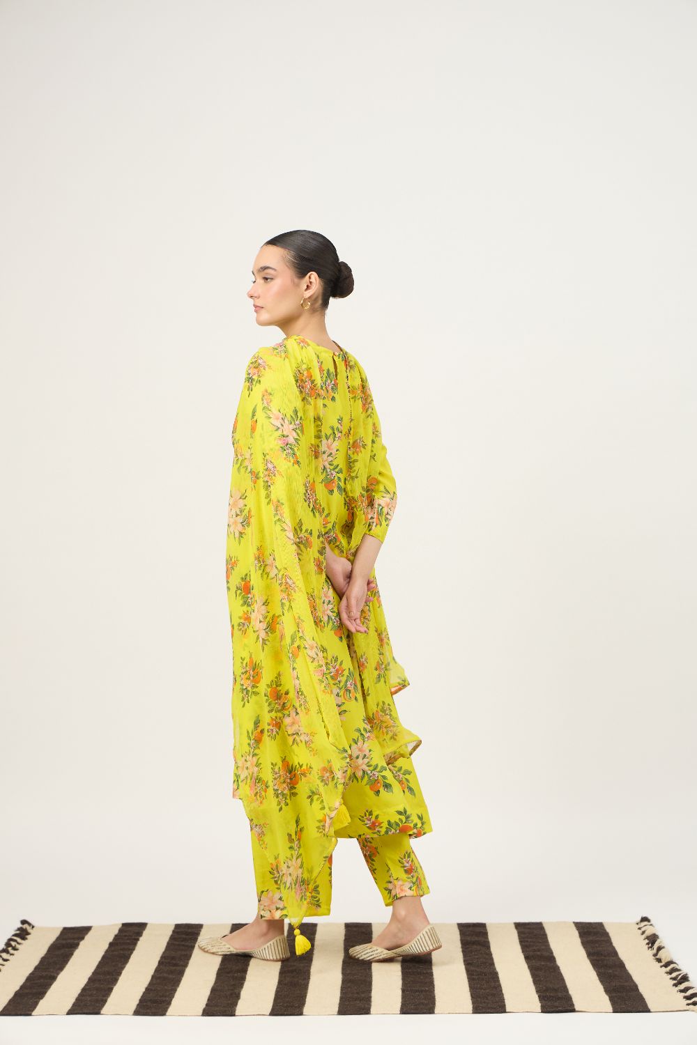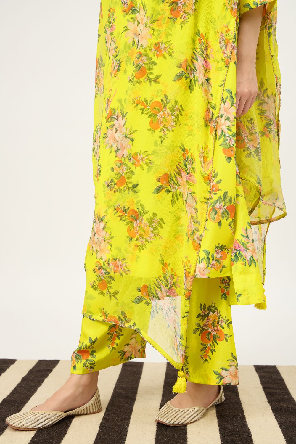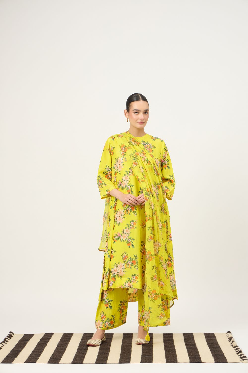 Brighten your festive wardrobe with this lime yellow floral kurta set, crafted in luxurious Habutai silk that offers a smooth texture, lightweight feel, and an elegant natural sheen. The kurta features a soft, relaxed silhouette with three-quarter sleeves, allowing the fabric to drape fluidly while ensuring all-day comfort. Adorned with delicate floral prints in soft peach and green tones, the design brings a fresh and feminine charm.