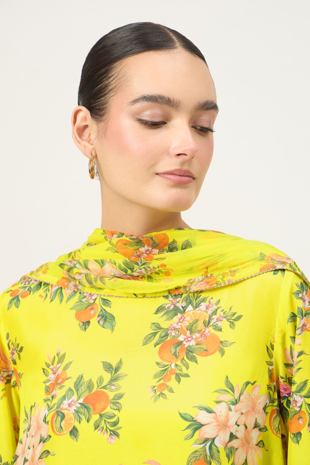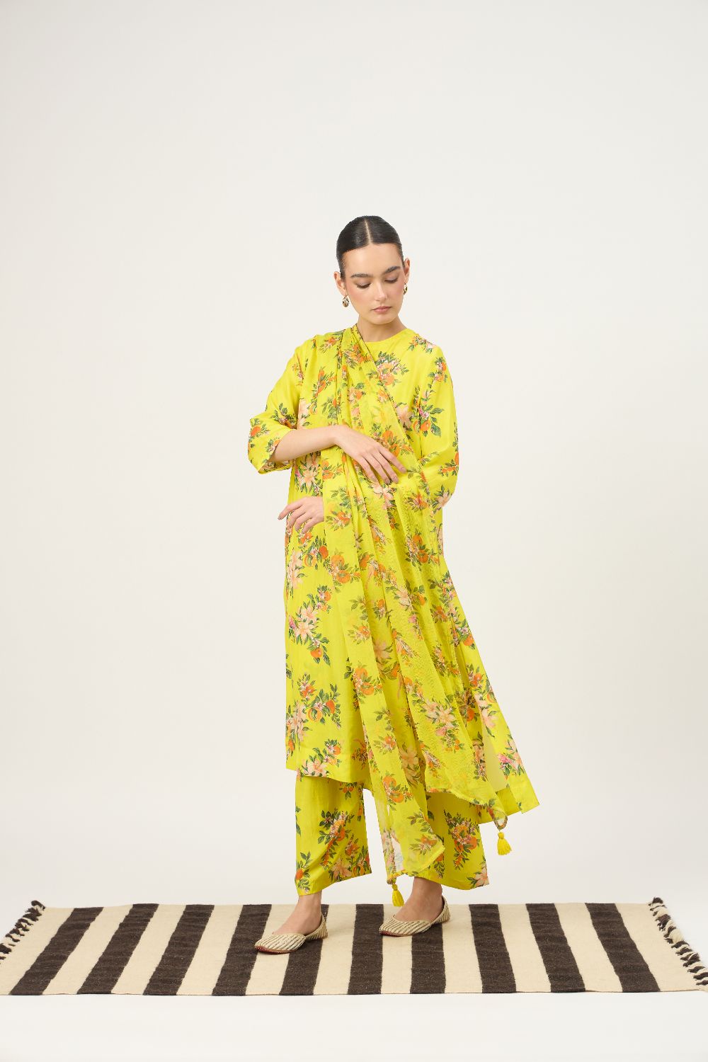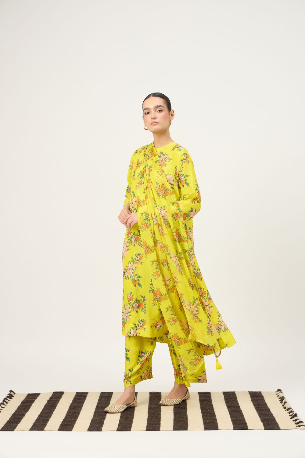 Brighten your festive wardrobe with this lime yellow floral kurta set, crafted in luxurious Habutai silk that offers a smooth texture, lightweight feel, and an elegant natural sheen. The kurta features a soft, relaxed silhouette with three-quarter sleeves, allowing the fabric to drape fluidly while ensuring all-day comfort. Adorned with delicate floral prints in soft peach and green tones, the design brings a fresh and feminine charm.