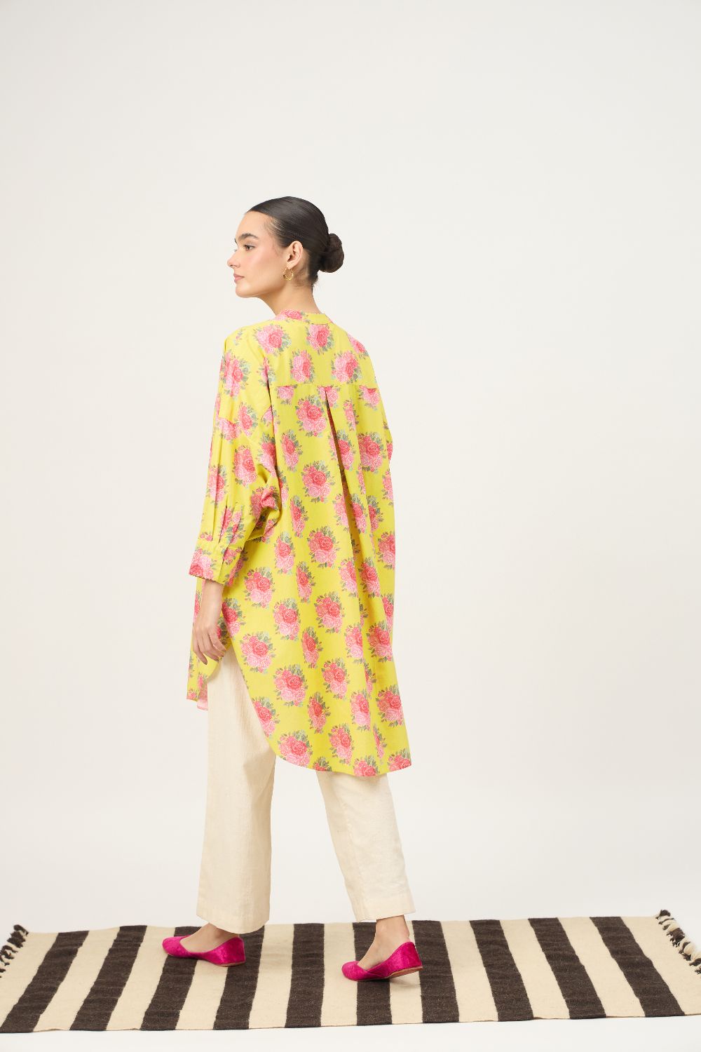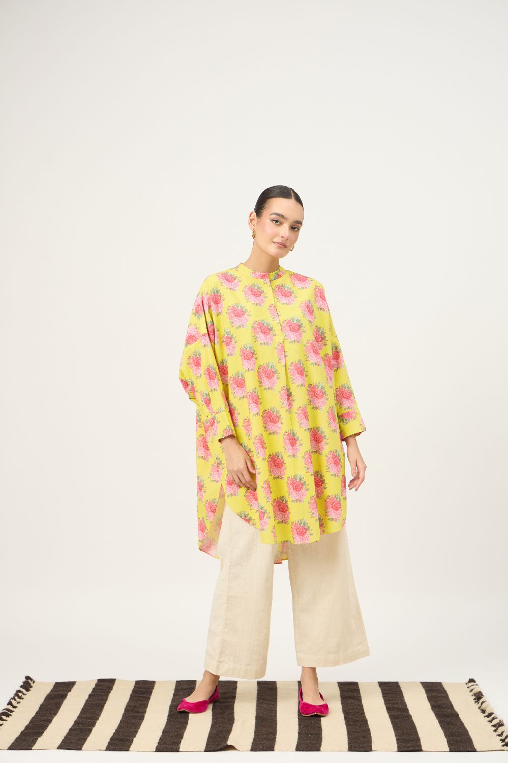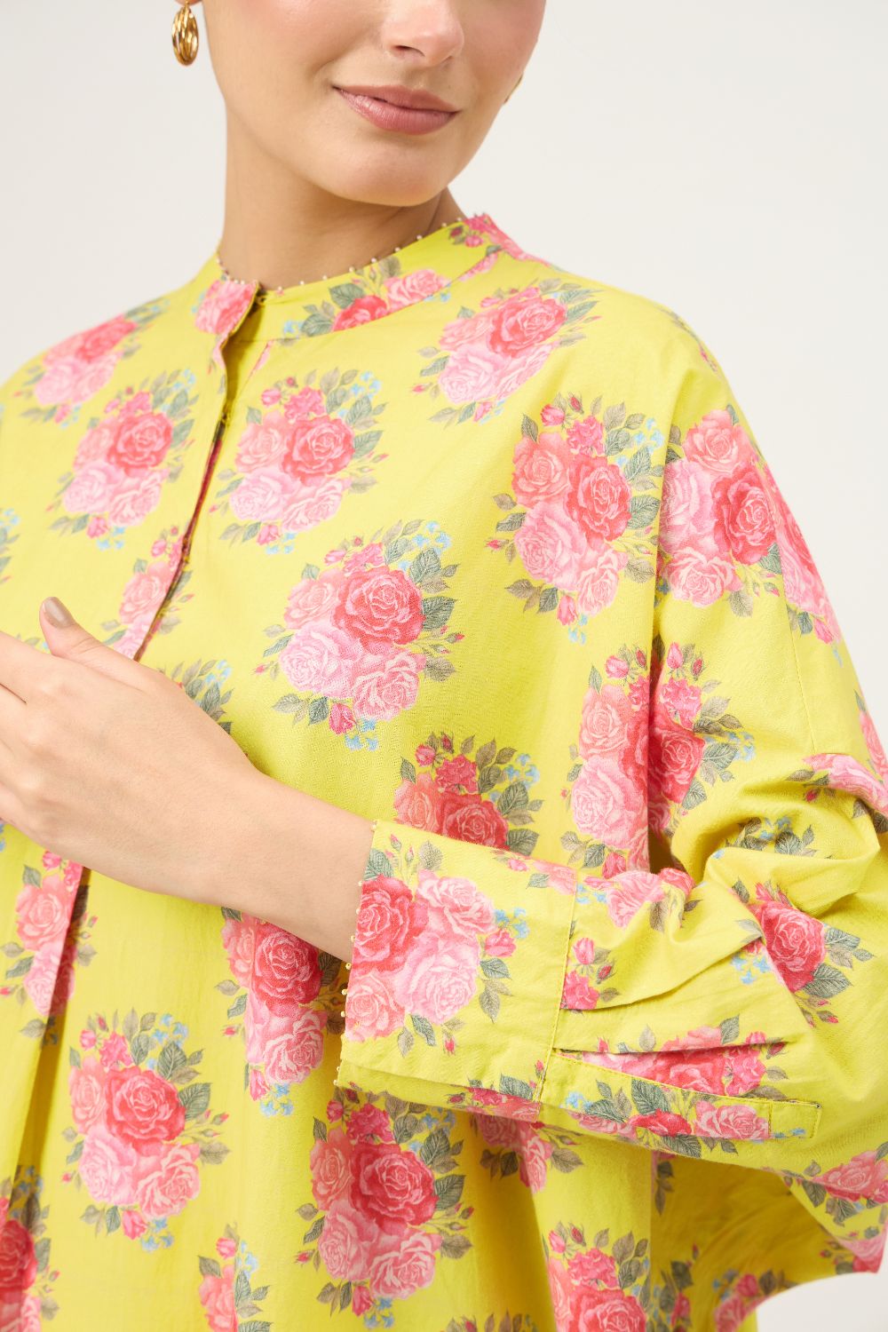 This ensemble features a Yellow Cotton Floral crafted in a lightweight, Pure Cotton, adorned with romantic rose Bunch. The kurta has a relaxed, short kurta with flowy three-quarter sleeves. Paired with it is a cream Pants, tailored in a breathable cotton that adds graceful movement and balance to the look.