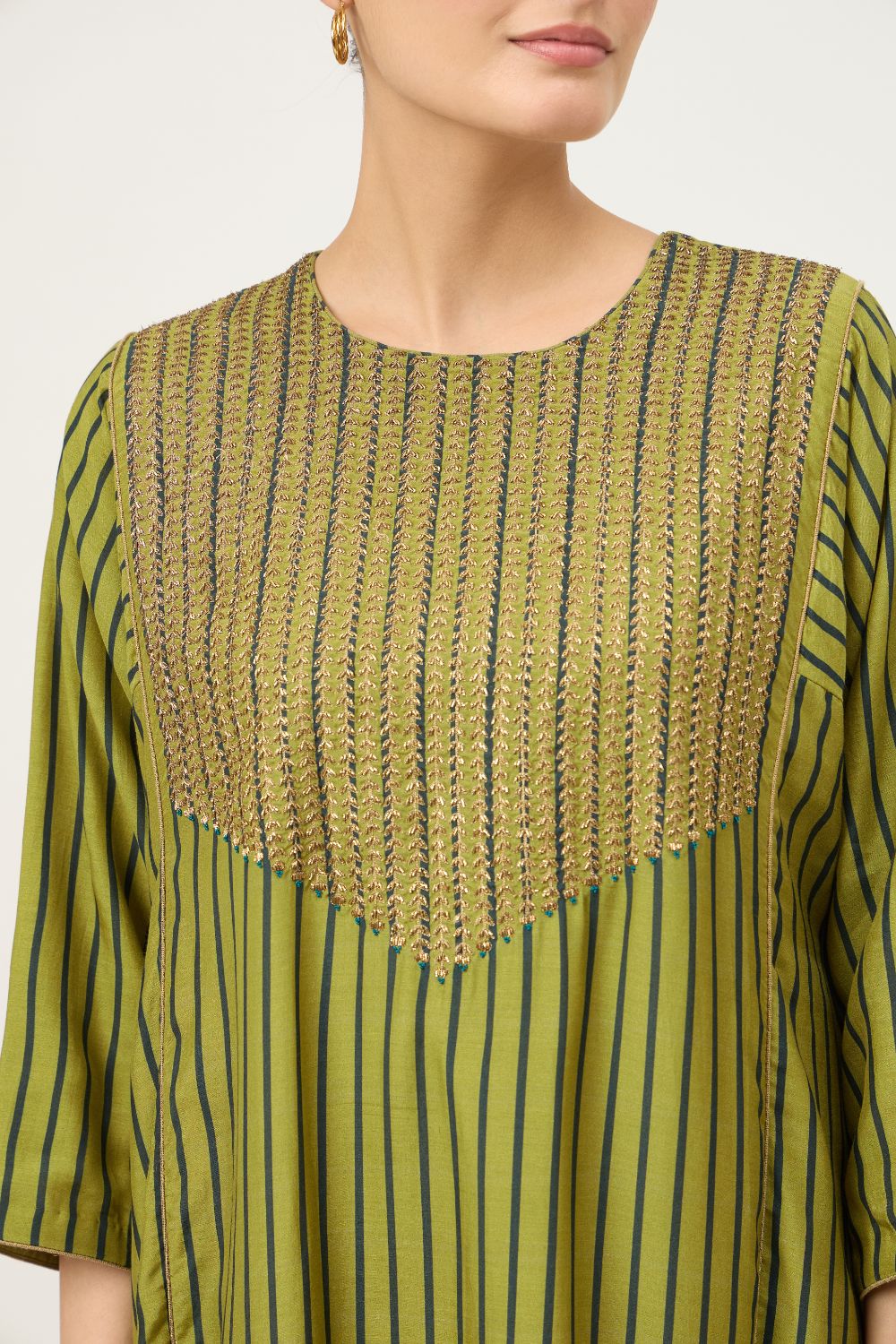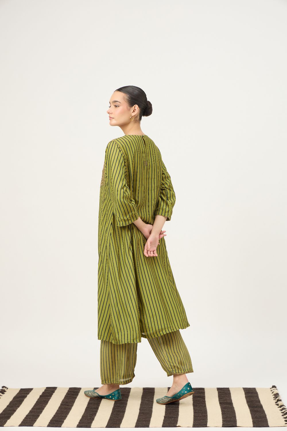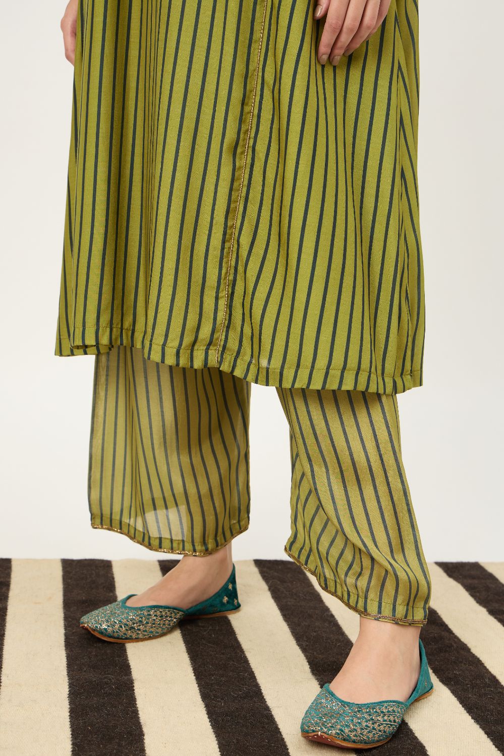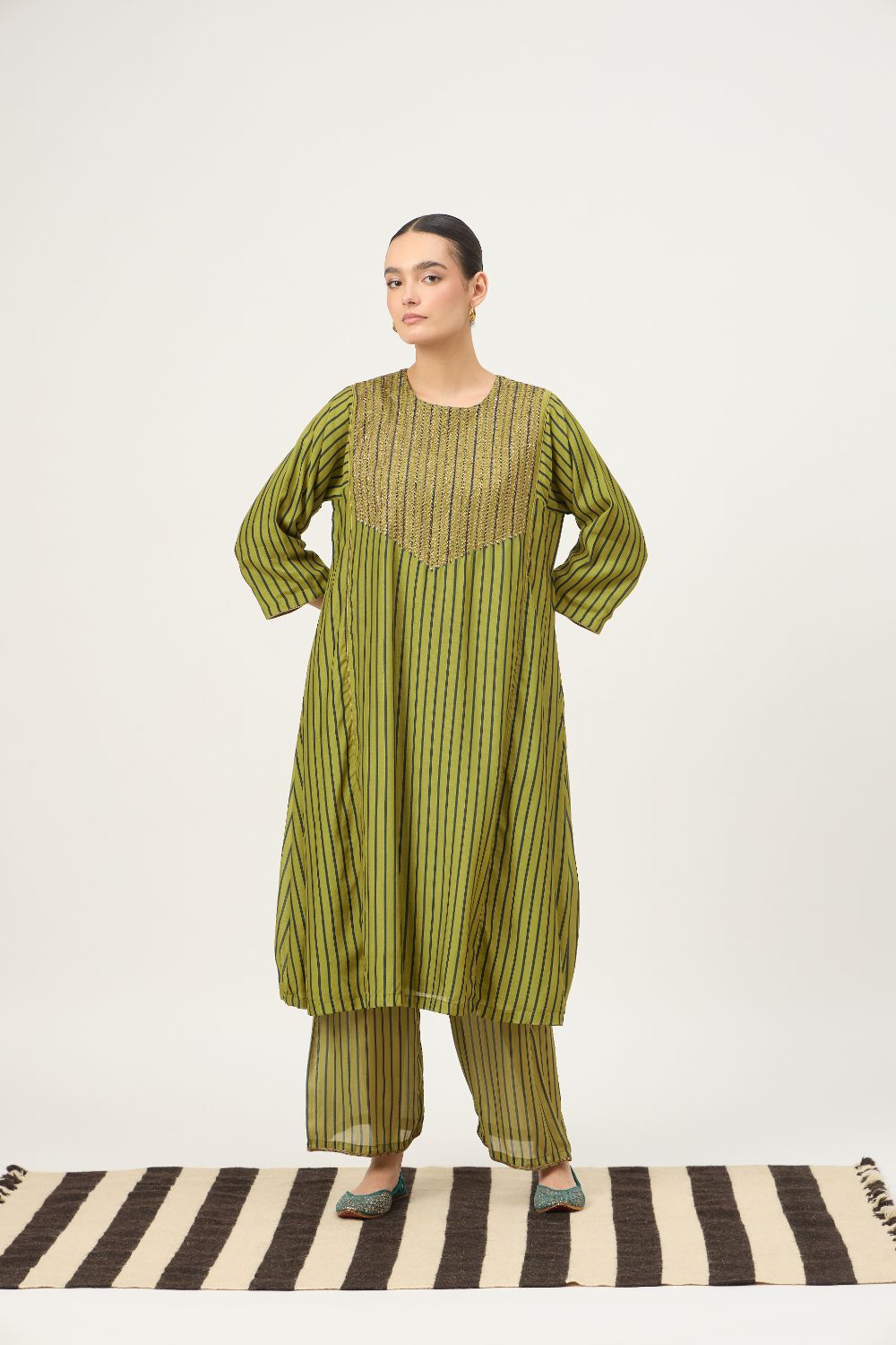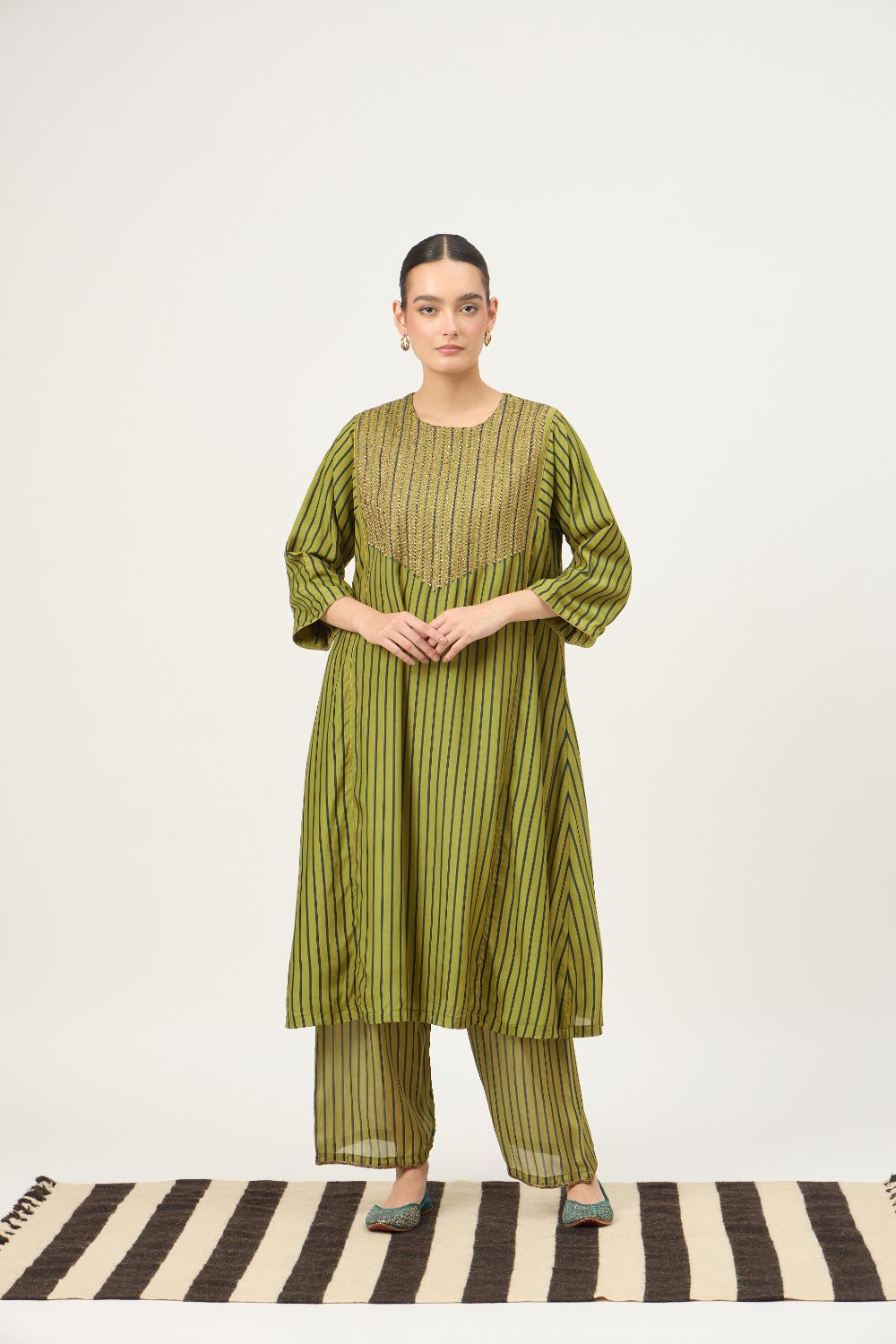 This beautiful Kurta Set with an intricate naqshi hand-work is a must have for the festive season, striped base in the kurta adds to the beauty of this festive Piece