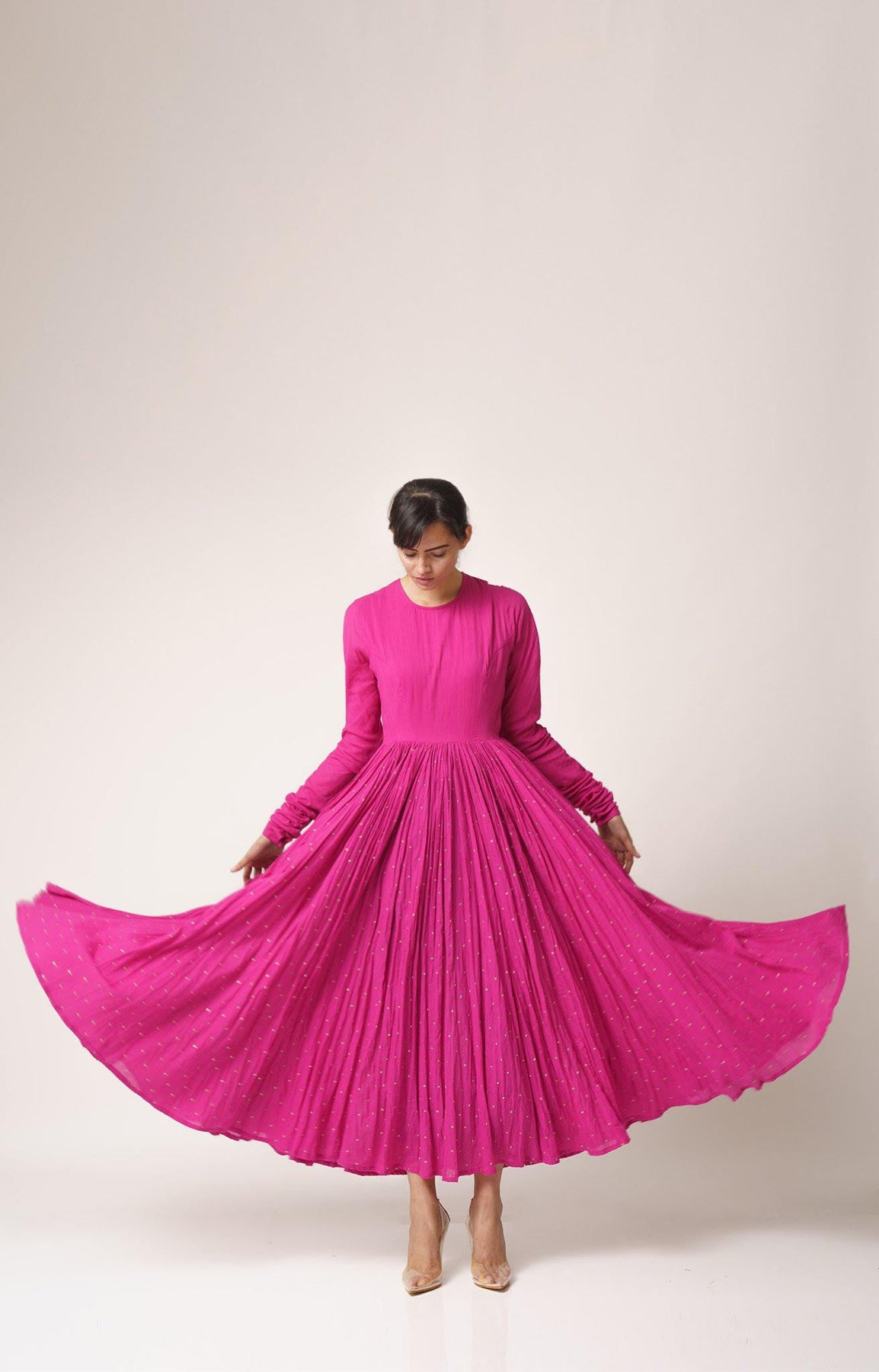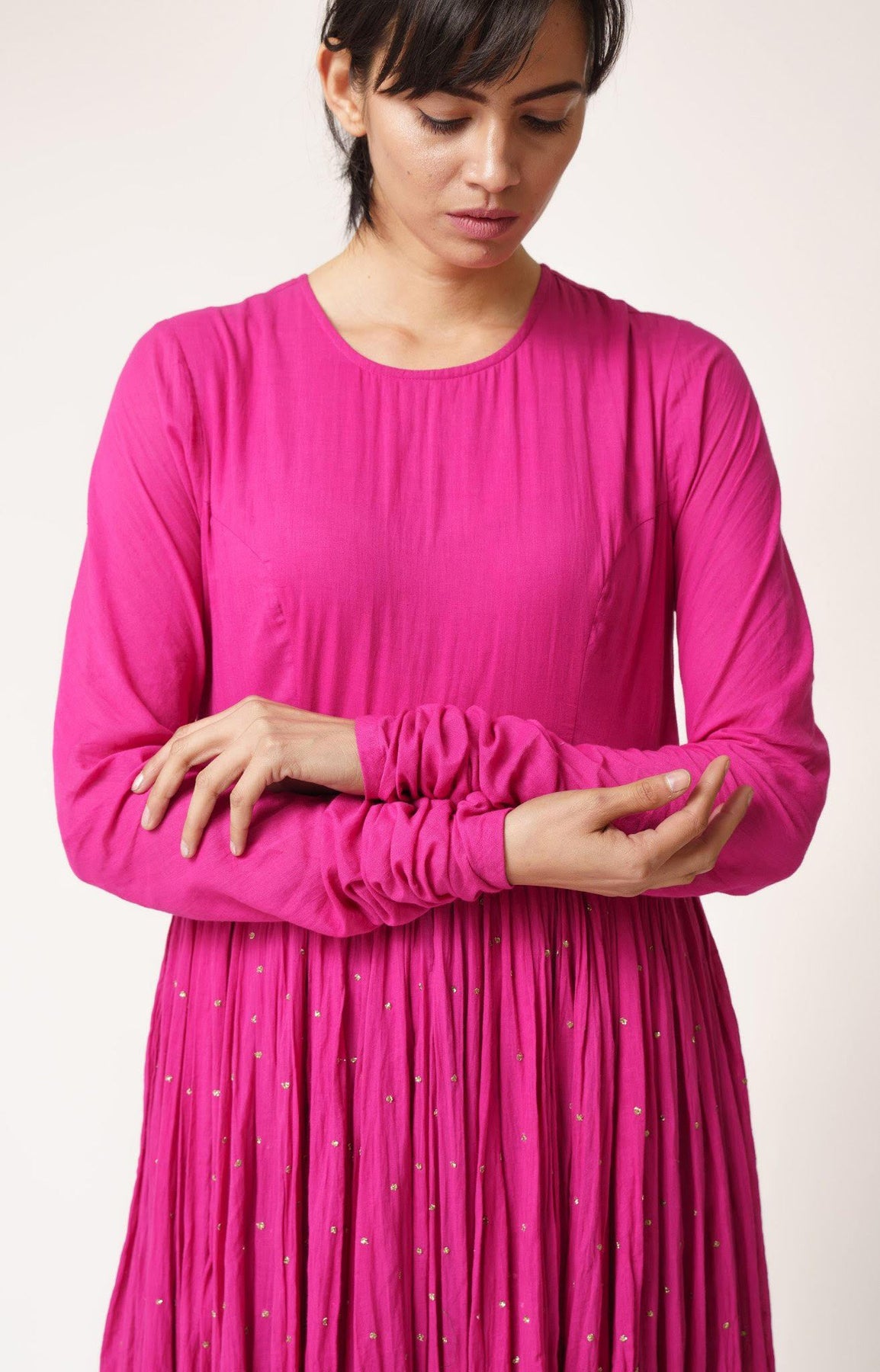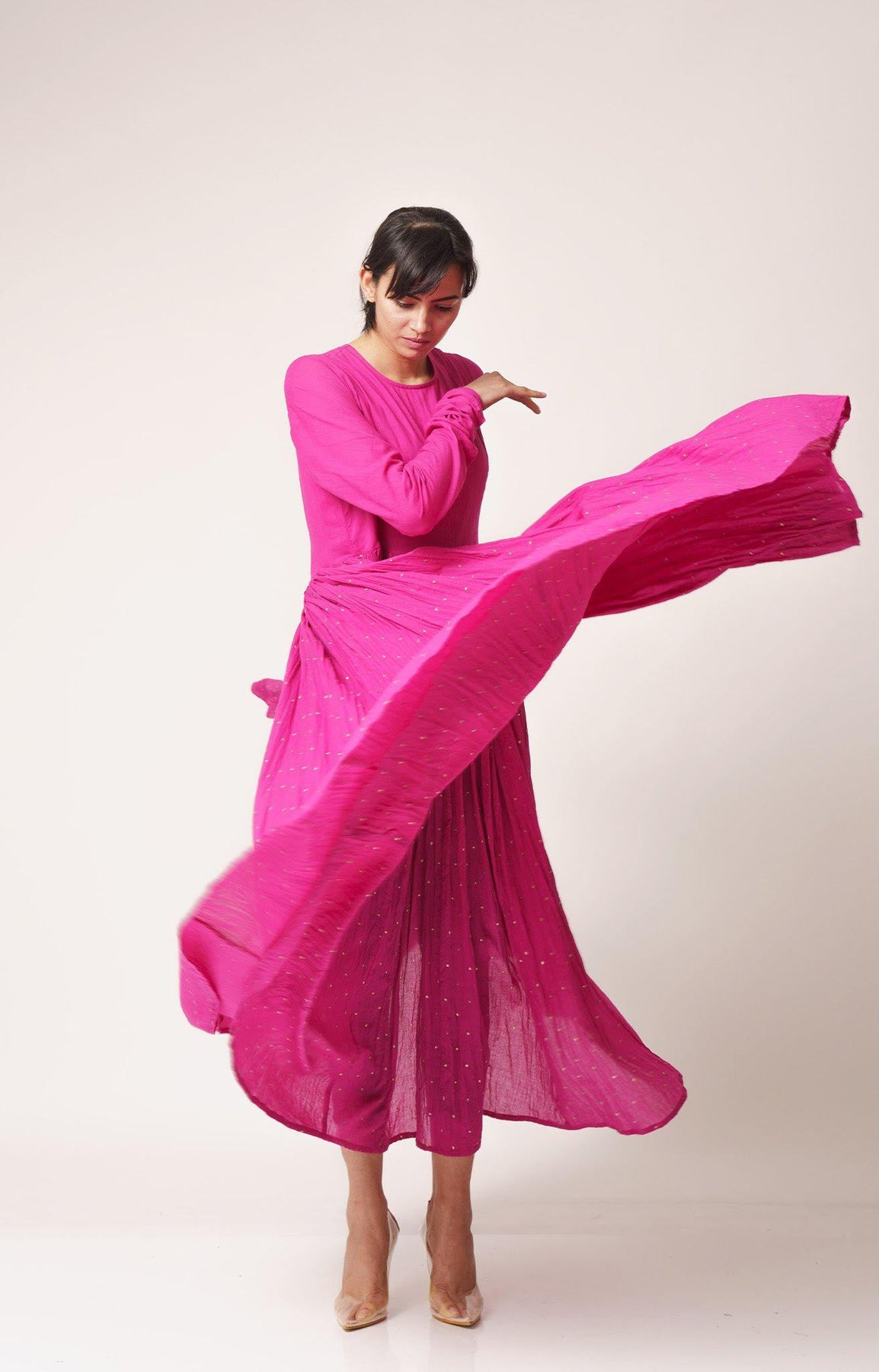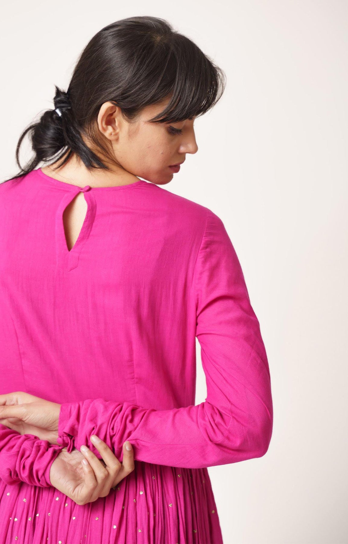 A beautiful embroidered pattern of kurta with gathered fabric at the waist with an elongated full sleeve. It is made with 100% soft cotton fabric, carefully hand-dyed in eclectic shades. This piece is made to order, it will take 15-20 days to reach you.