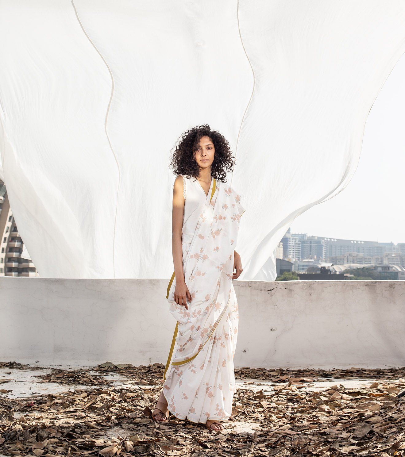 Ivory mulmul saree with an overall screen print of purple rose motifs. Styled with our 'sprouting' crop top.