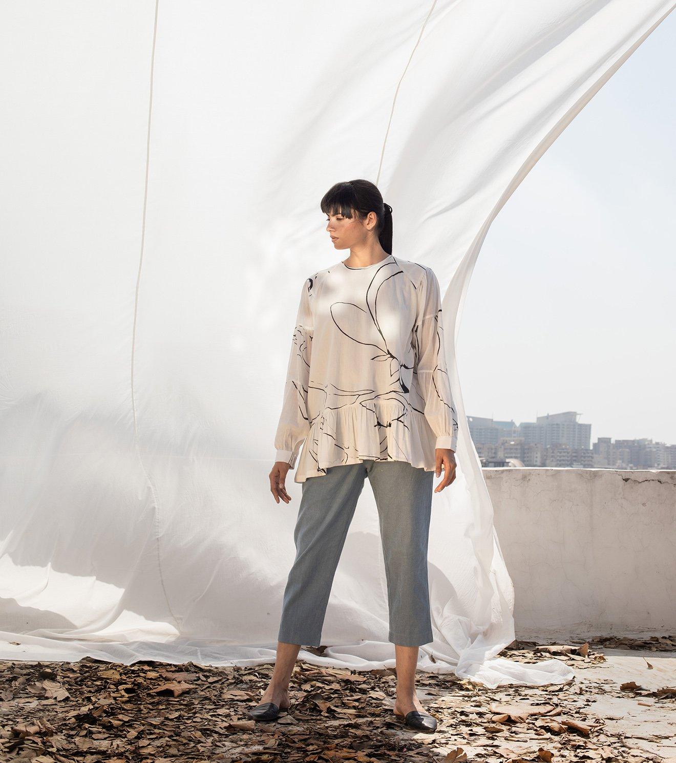 Ivory screen printed mulmul anti-fit top with a round neck, gathered hem and full sleeves.