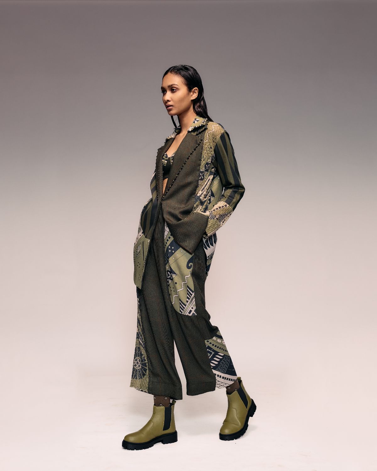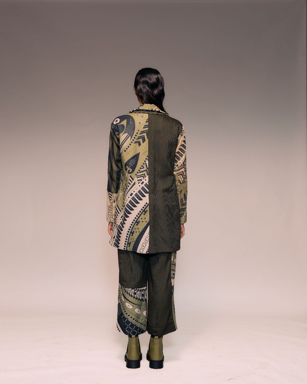 The Olive Patch Trouser combines contrasting fabrics houndstooth, printed cotton net, and olive printed cotton — into a cohesive, artistic patchwork. Its tailored straight-fit silhouette flatters all body types while maintaining comfort and fluidity. Each seam is precisely stitched for premium finish and structure. Pair with the matching Olive Patch Blazer or minimalist tops for a polished, creative statement. Perfect for fall, festive occasions, or sophisticated daywear.