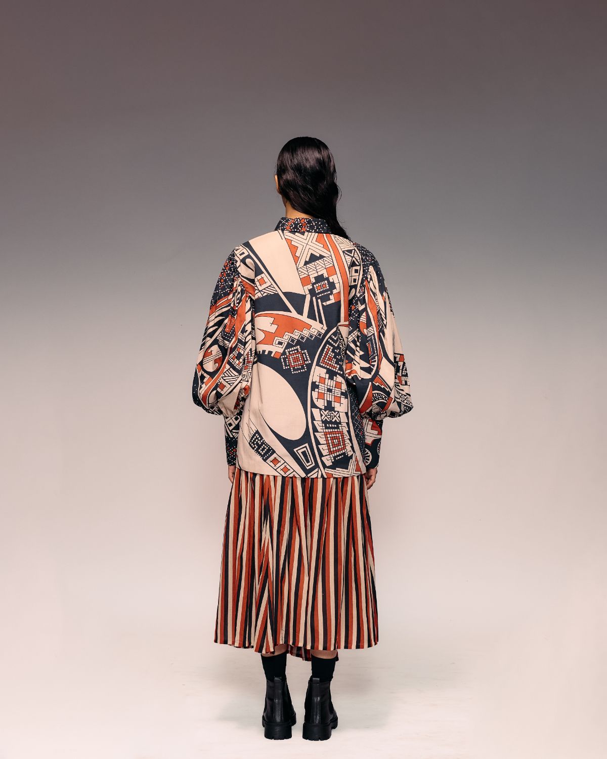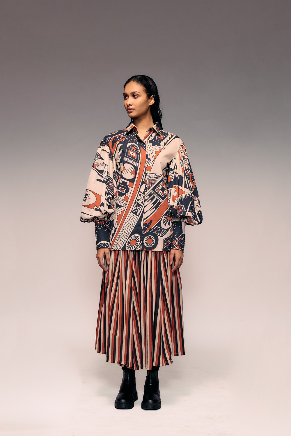 The print showcases stripes in rust, black and beige arranged in a rhythmic linear pattern that creates a striking visual flow. Made from fine cotton, the fabric is known for its feather-light softness and breathable comfort. Its naturally airy weave lends the skirt a graceful drape and flow. This skirt pairs beautifully with the Rust Print Linen Shirt Dress worn as an open layer or with a crisp white or black blouse tucked in. For a more statement look, style it with a crop top or the Rust Print Linen Blazer for a tailored contrast. Add heeled mules or ankle boots and minimal accessories for a refined statement look.