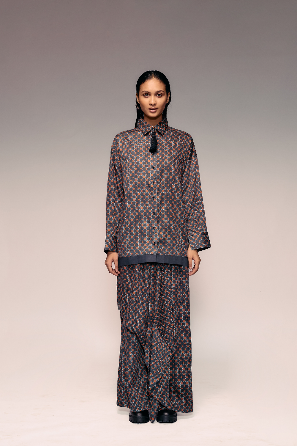 The Rust Black Check Trouser Drape brings together structure and movement merging the crispness of tailored trousers with the softness of draped fabric. The silhouette is designed with a defined waistband and a fluid overlay that creates the illusion of a wrap skirt while maintaining trouser comfort. The high-quality tailoring ensures sharp lines and clean structure — from reinforced seams to perfectly aligned checks. It’s a modern fusion design smart yet sensuous. Ideal for creative workspaces, resort travel, or festive soirées dressing with statement accessories.