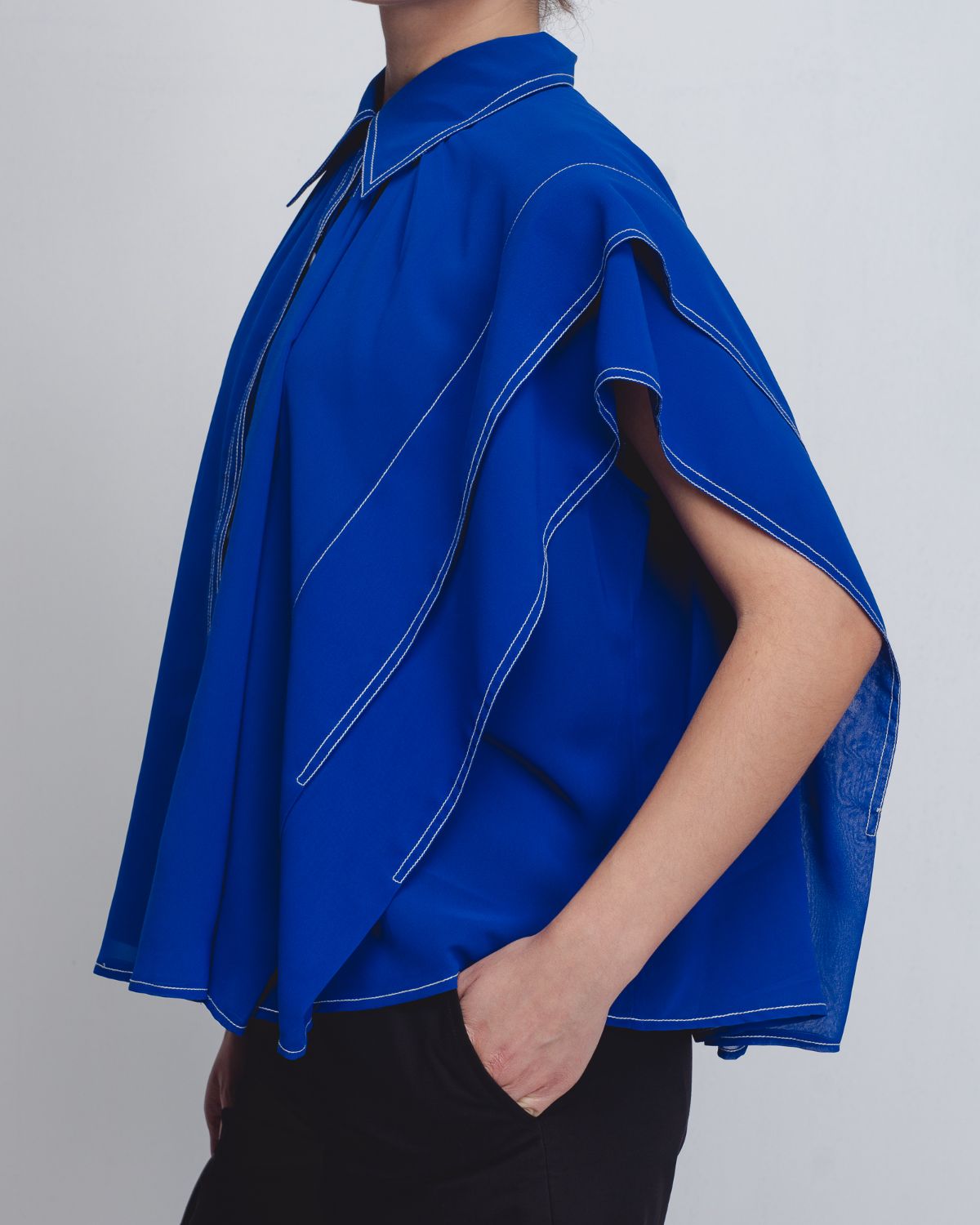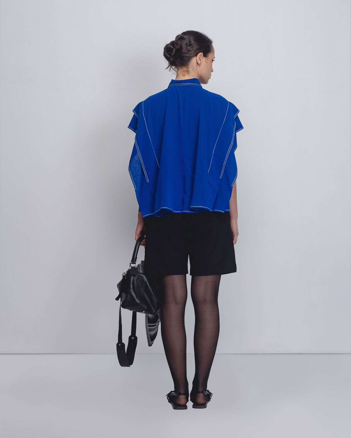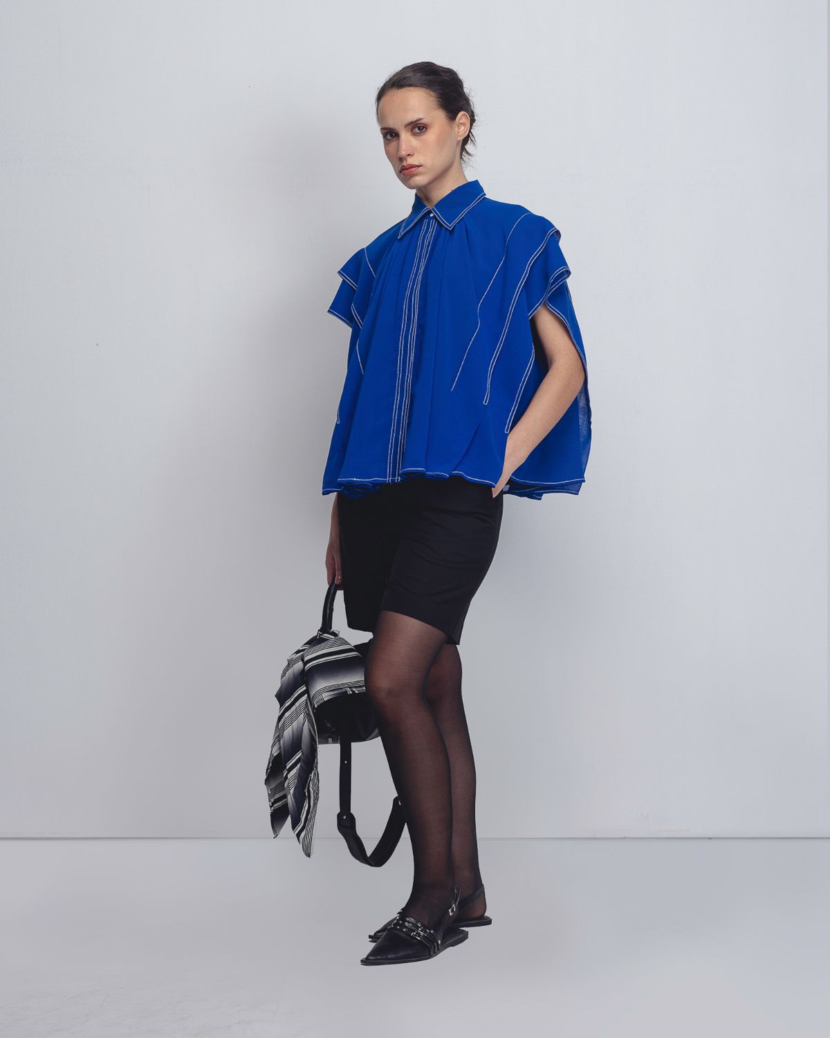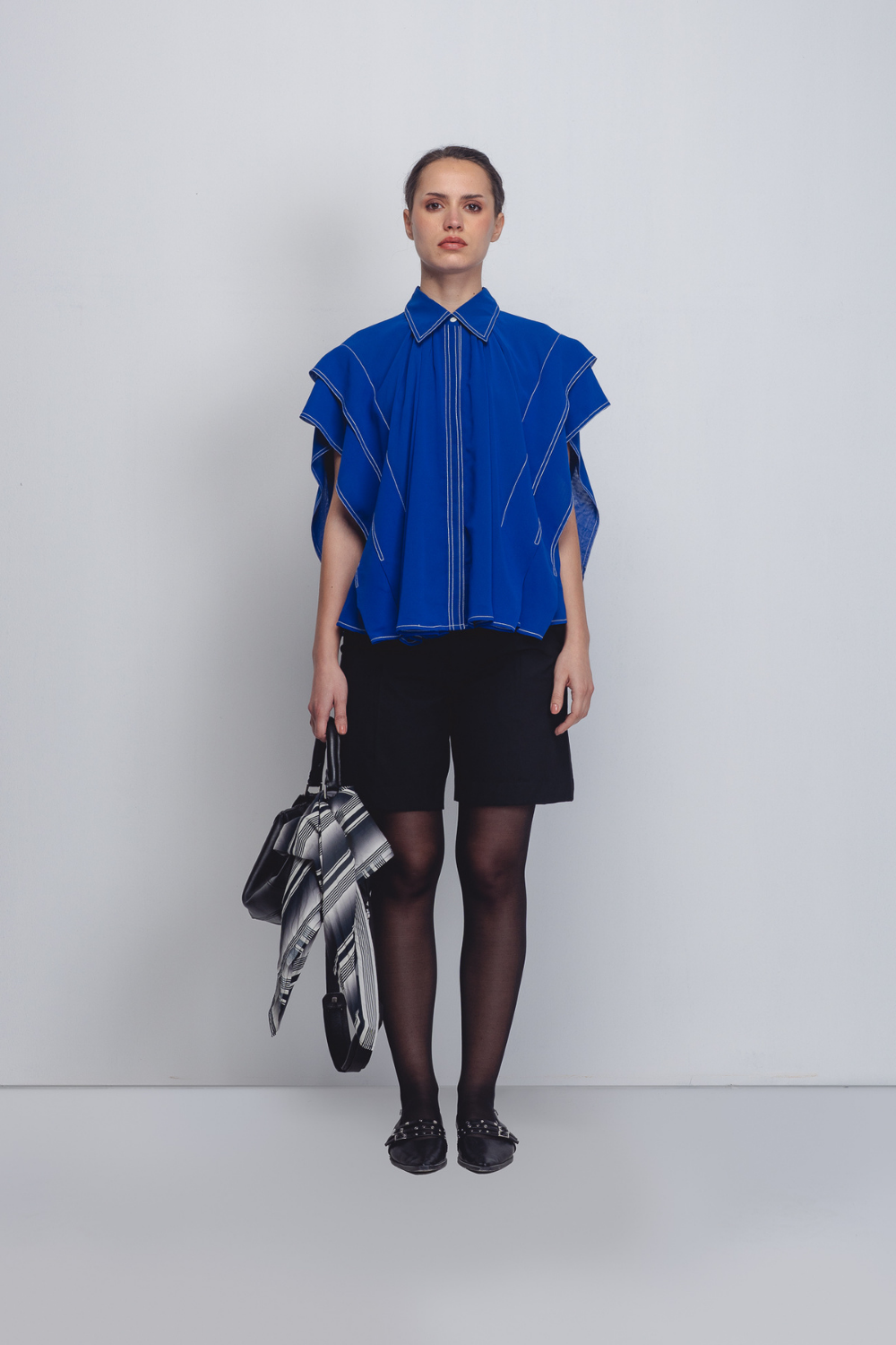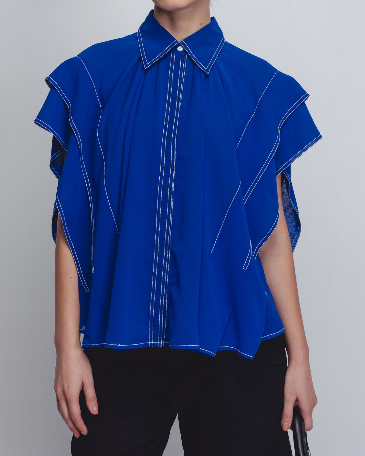 Cut in georgette, this garment features pleating at the shoulders that lends soft volume and creates a fluid, flowy silhouette. It is designed with a full front opening and finished with a collar, bringing subtle structure to the airy drape. The model is 5ft 8 inches and the garment length 25 inches.