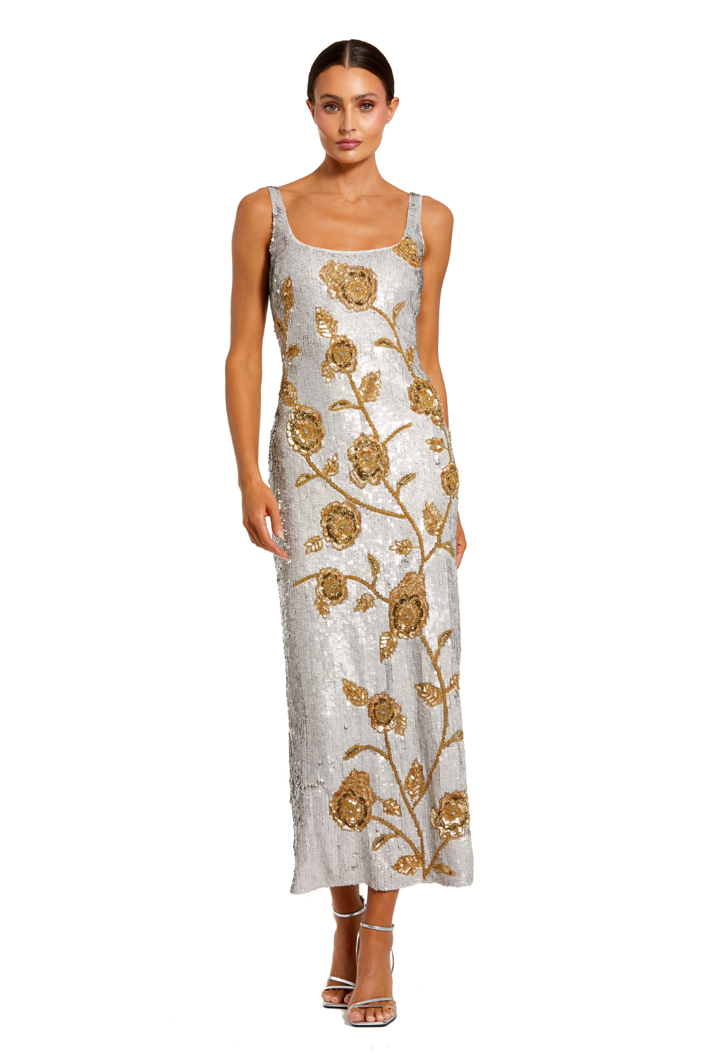 10119 - Silver Sleeveless Sequin Dress With Gold Floral Detail