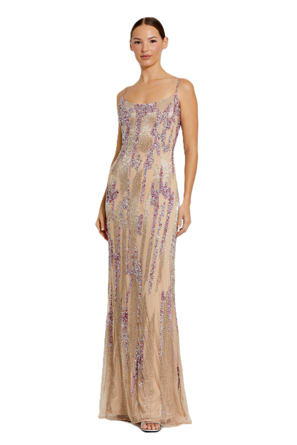 6150 - Beige Spaghetti Strap Beaded Column Gown