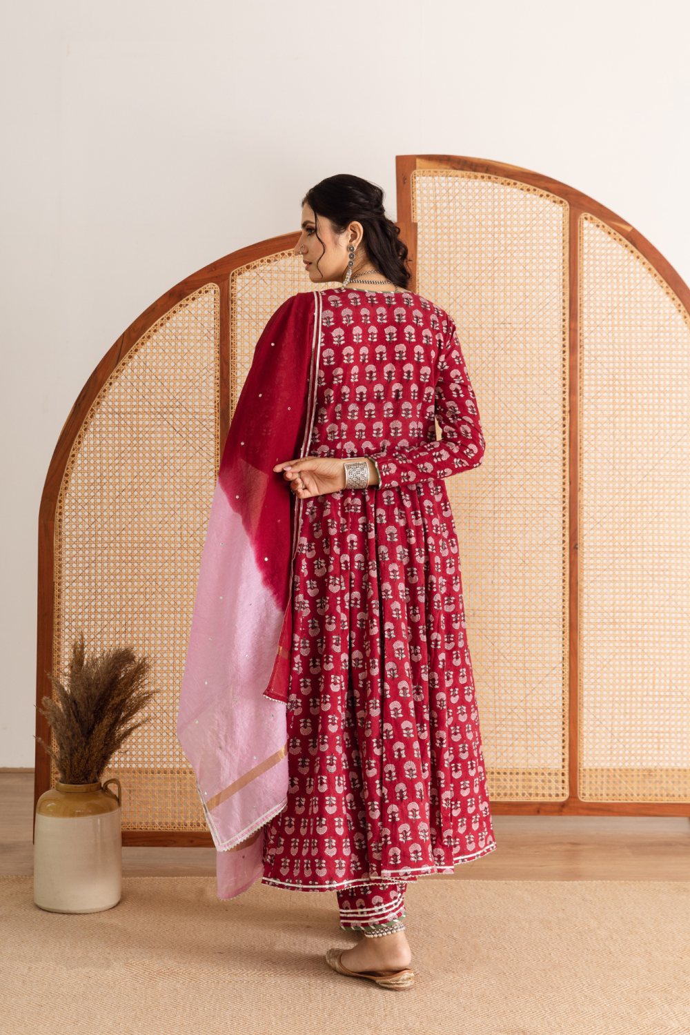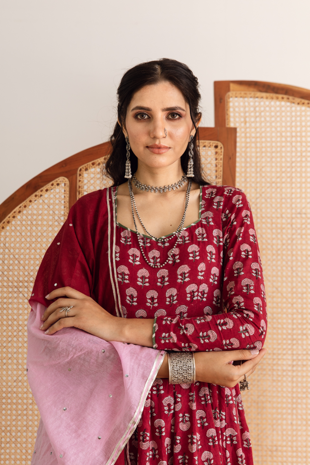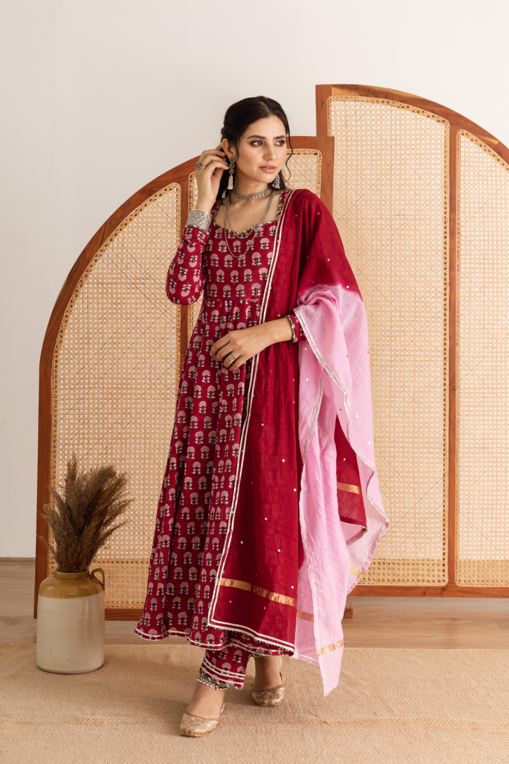 Kurta - ghera kalidar with printed marigold flowers in pink, finished with magzi and gota detailing