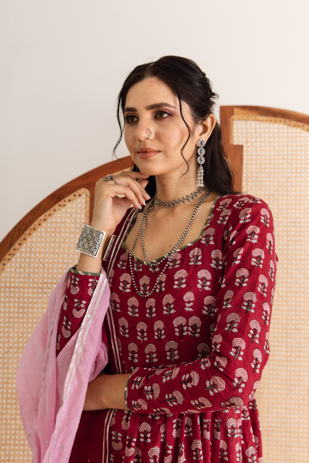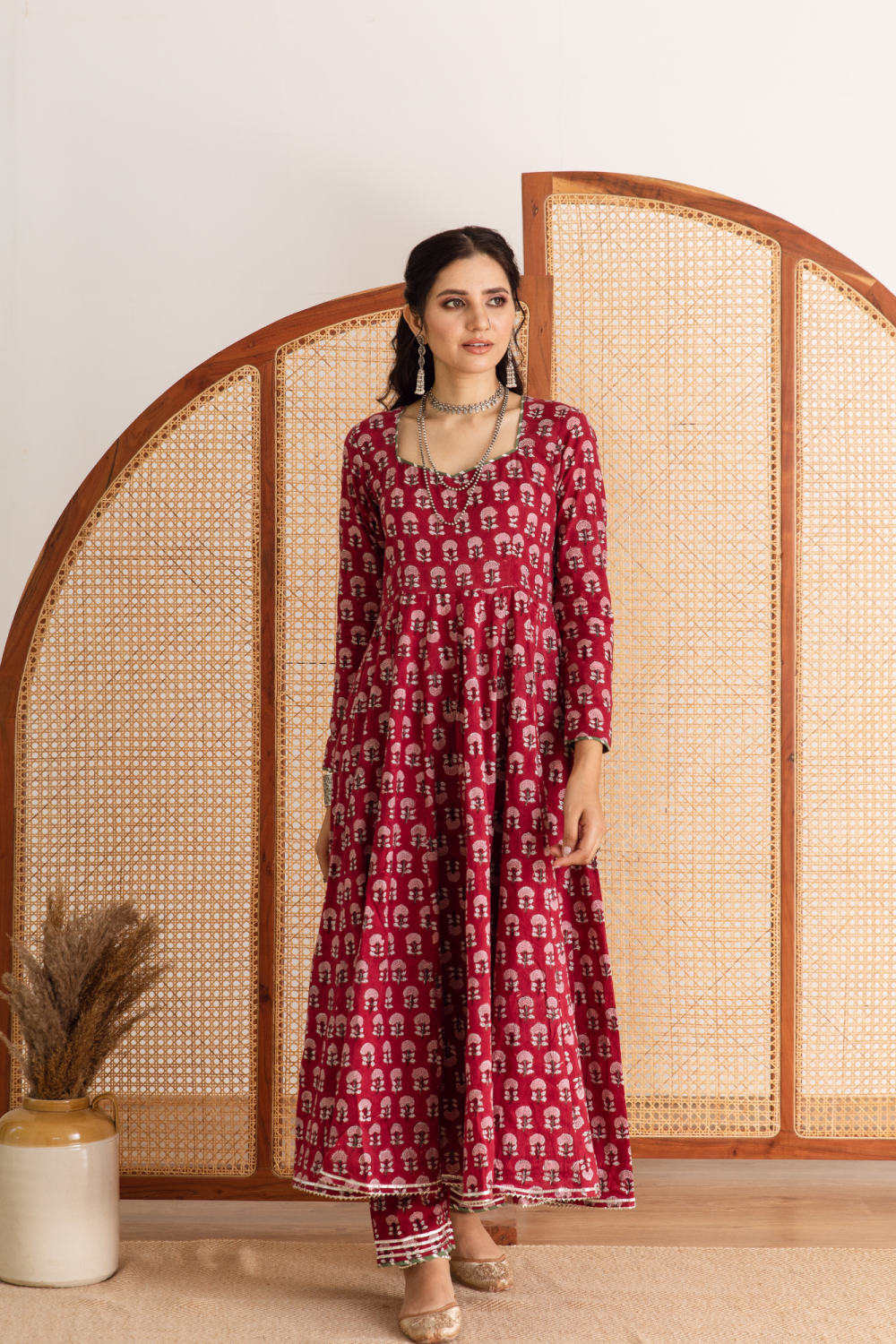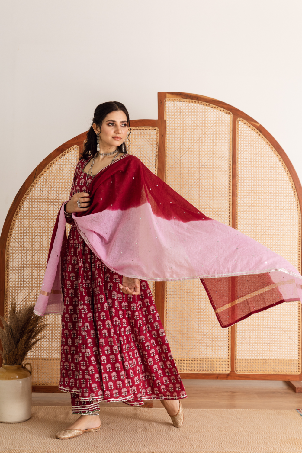 Kurta - ghera kalidar with printed marigold flowers in pink, finished with magzi and gota detailing