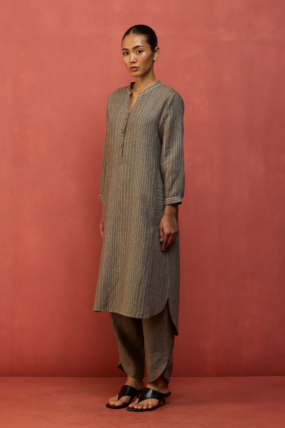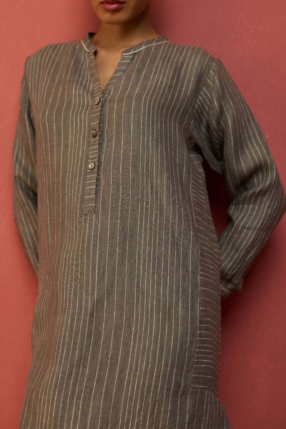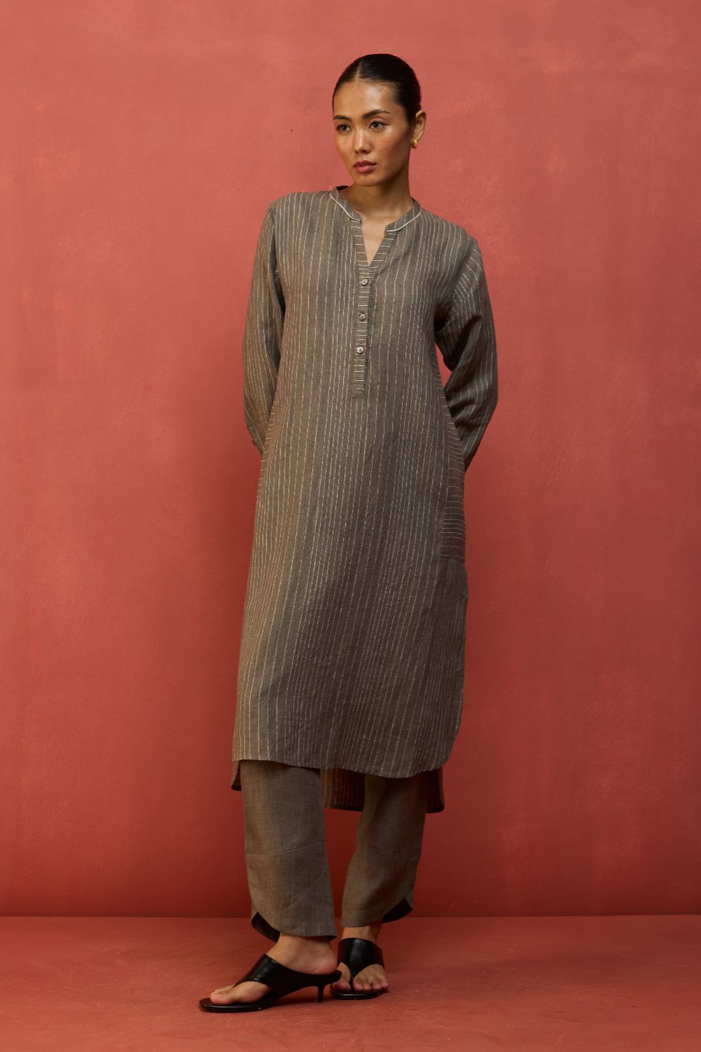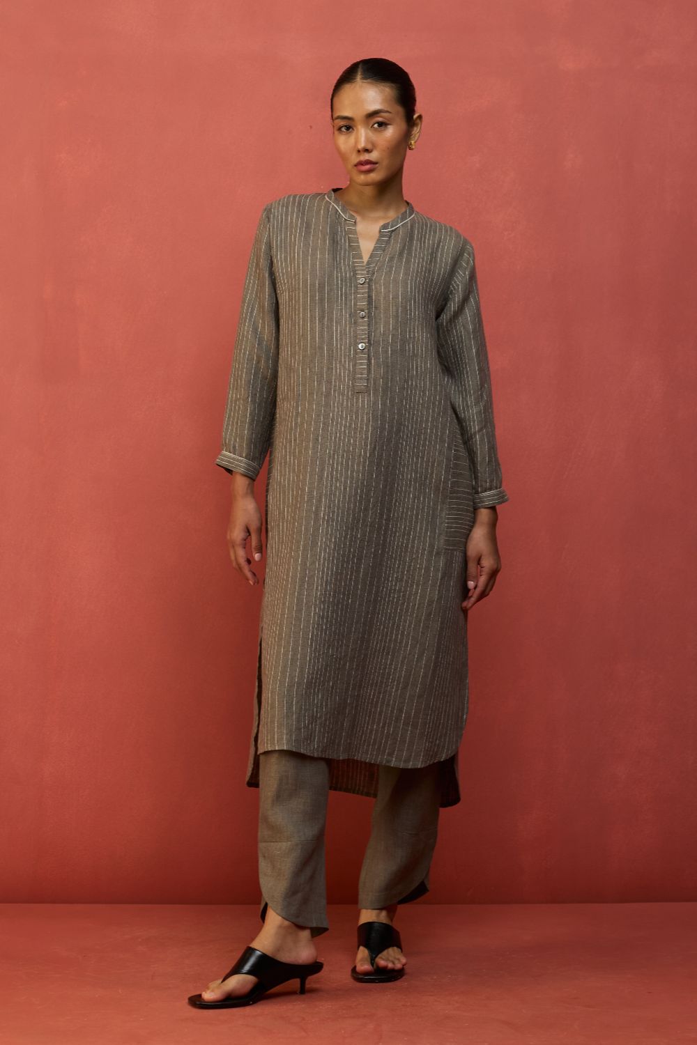 Kurta - A contemporary pathani kurta crafted in our soft yarn-dyed stripe linen with horizontal and vertical stripe linen patchwork. Designed with a classic mandarin collar, mother-of-pearl buttoned placket, three-quarter sleeve, woven selvedge edging on the neckline and sleeve, this kurta combines comfort with refined detailing. The easy fit and side slits make it perfect for layering or pairing with matching trousers for an effortlessly elegant everyday look.