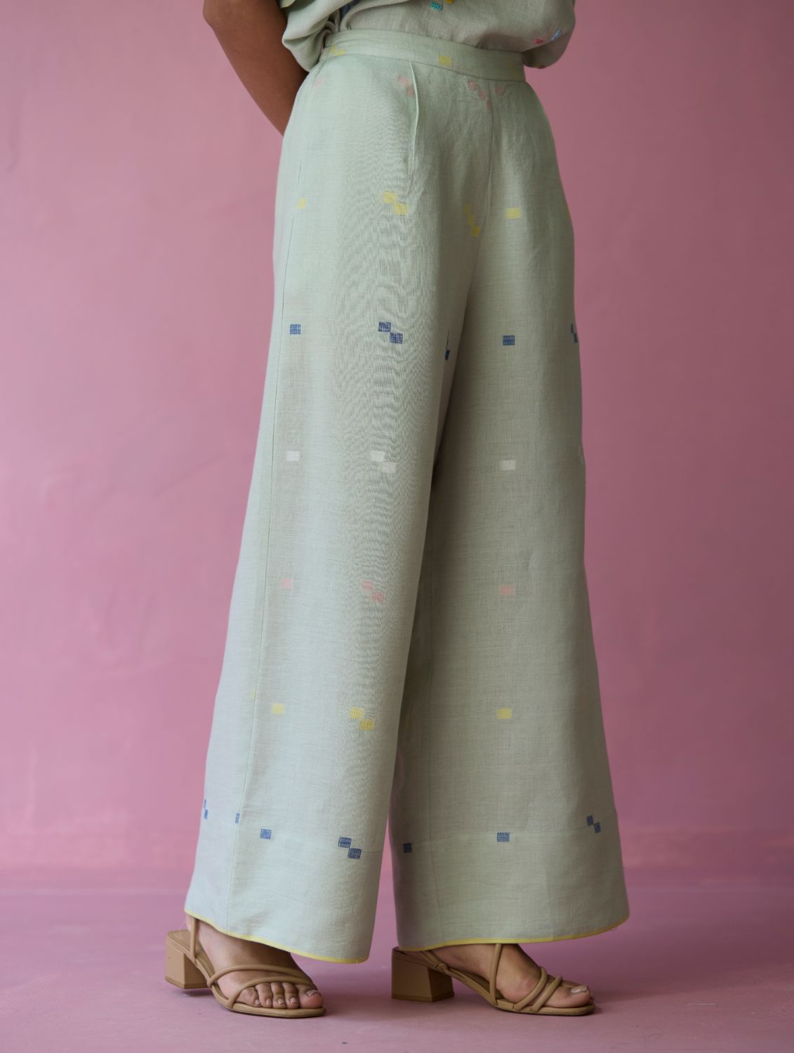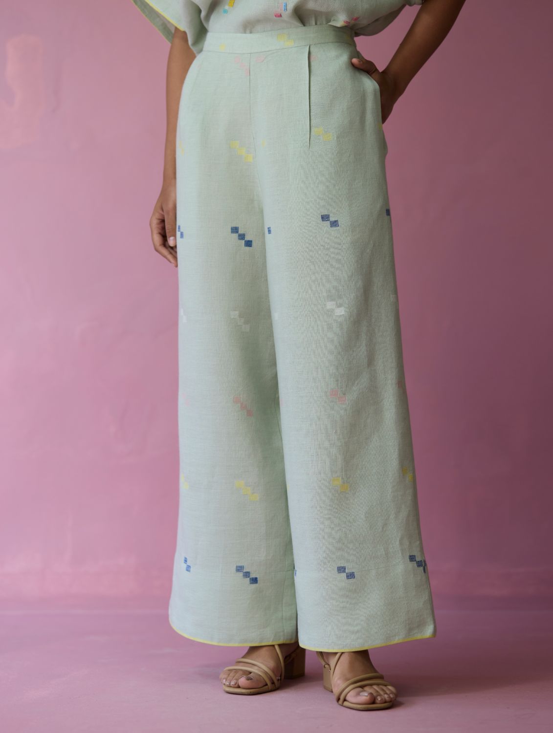 Timeless wide-leg, broad hem culottes with pleats at the waistband, comfortable pockets and a soft elasticated back waistband crafted in our bespoke soft handloom jamdani linen with a distinct varying 4 colour square motif weave. The Umami pairs easily with your favourite tops, shirts and kurtas.