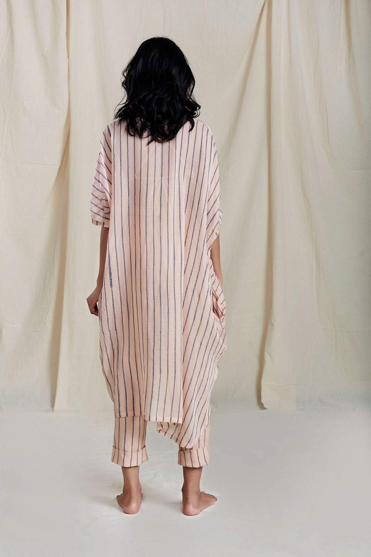 Yet another draped cowl silhouette !! the stripe on mal giving it a soothing and nautical feel !! A perfect pick for your resort and cruise holidays this summer !! complete this stunning drape with a bralette and matching pants from this collection.