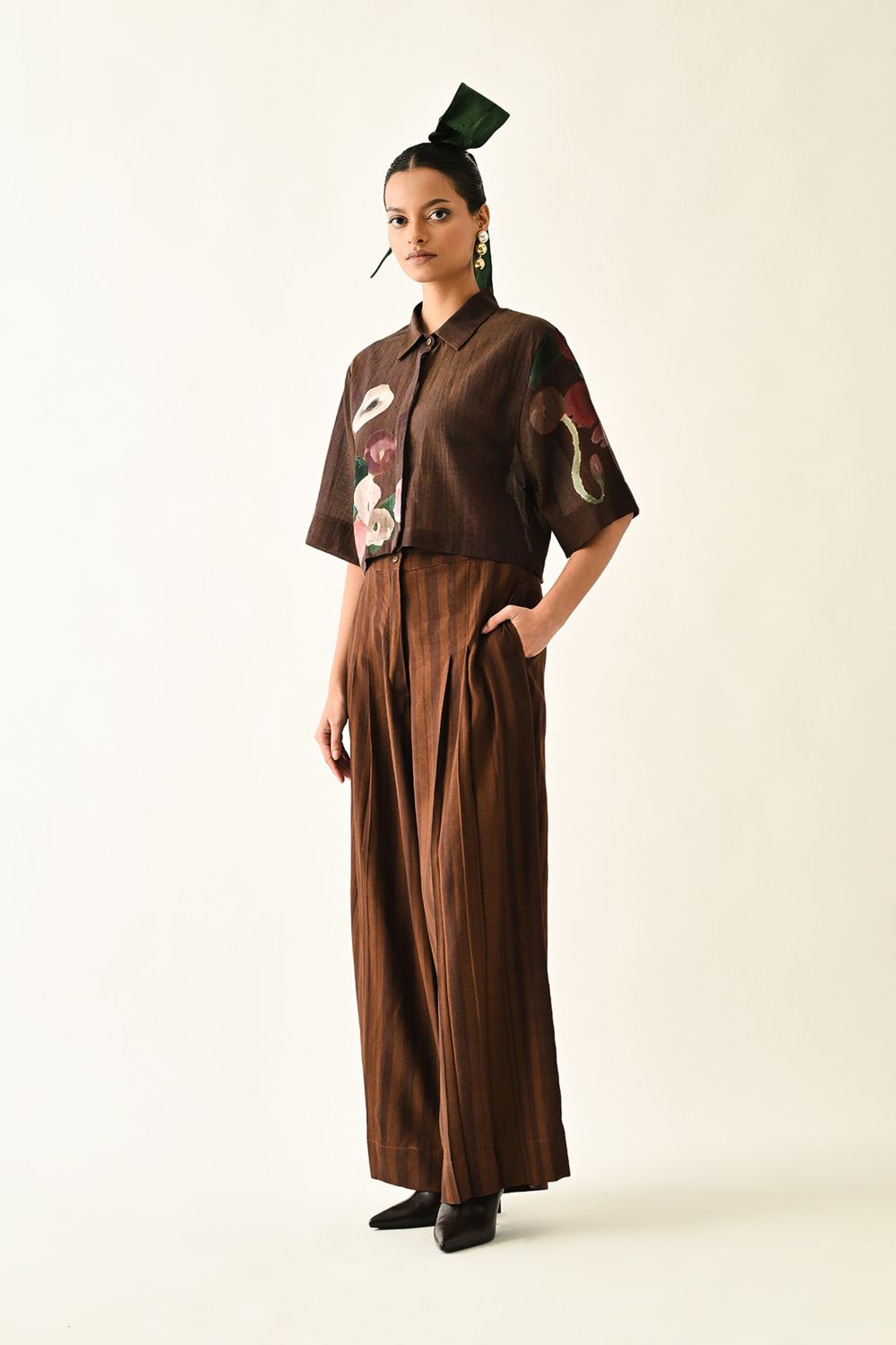 Top: Anti-Fit cropped shirt, hand-painted abstract expressionist digitally transferred print, with back yoke and box pleat. Print placements will vary—single Piece. Model is wearing - XS/S