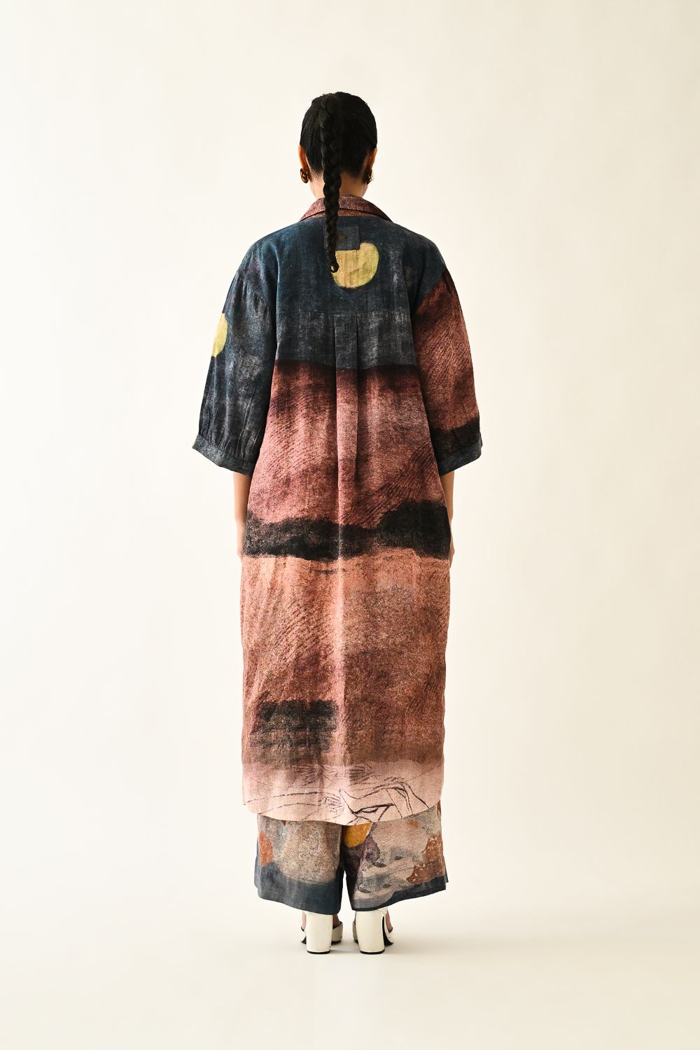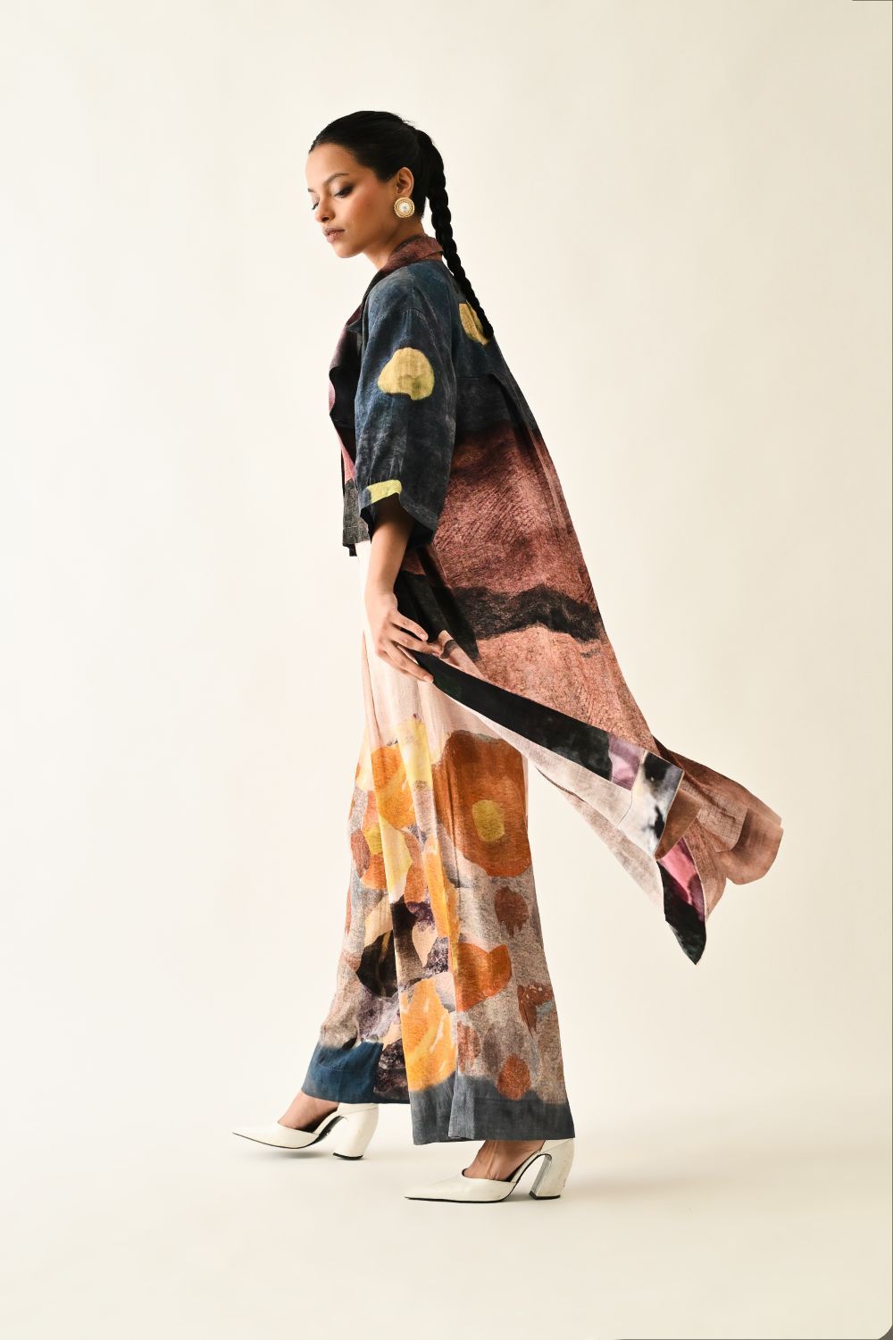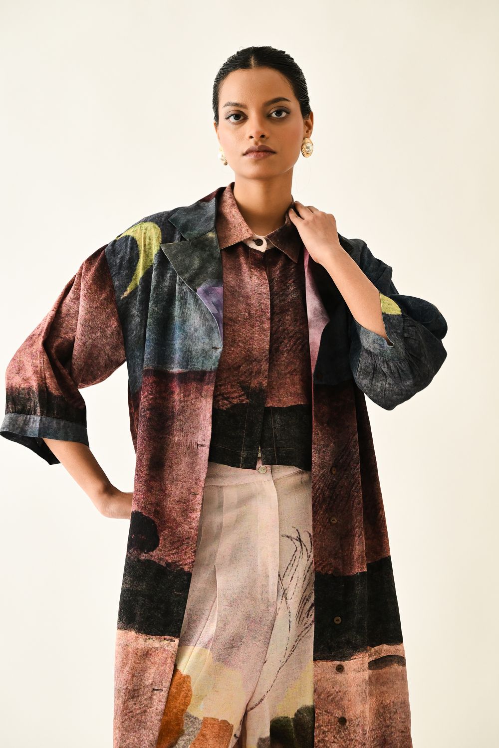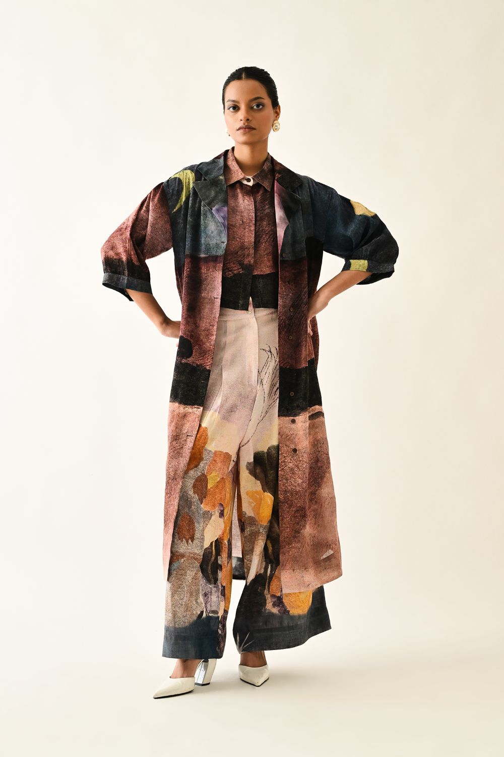 Dress: An Anti fit trench with Hand-painted abstract expressionist digitally transferred print, gathered sleeves, back yoke, box pleat at the back. Print placement will vary - single piece. Model is wearing - XS/S