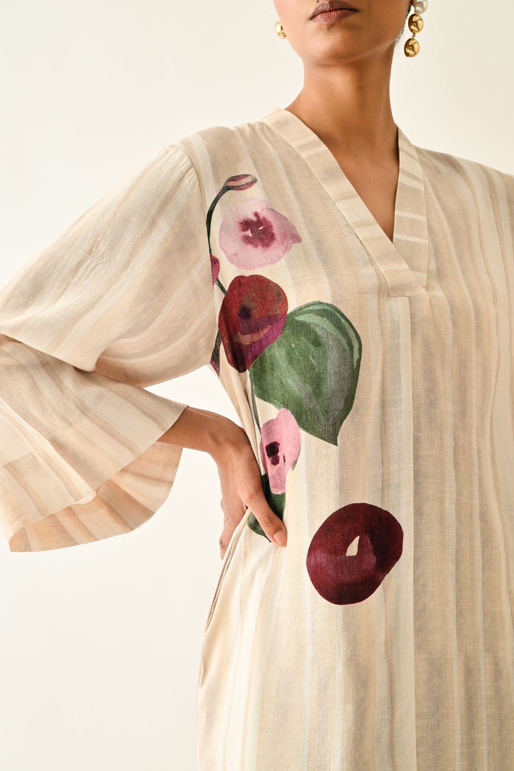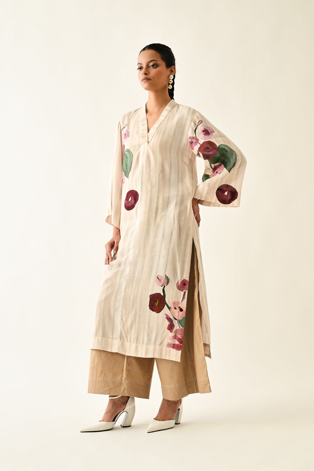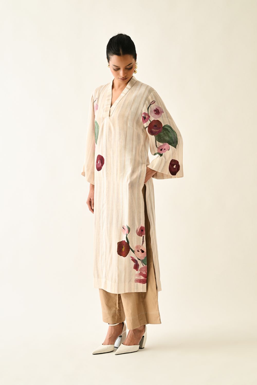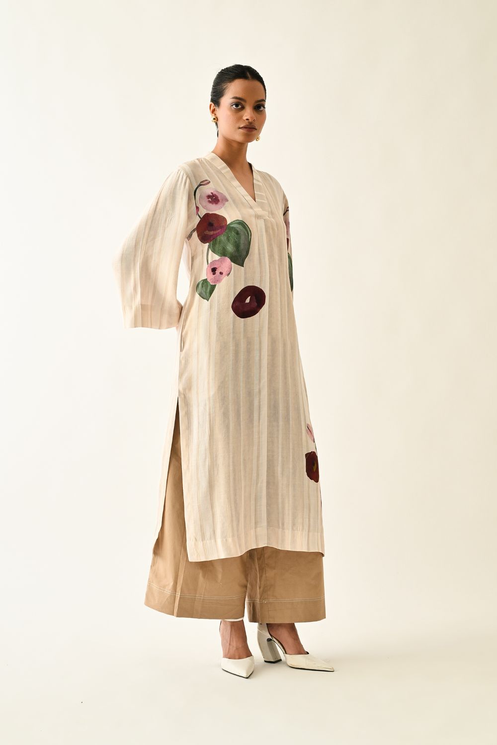 Kurta: Anti-Fit, Hand-painted abstract expressionist digitally transferred print, V-neck kurta, Side pockets. Print placements will vary—single Piece. Model is wearing XS/S