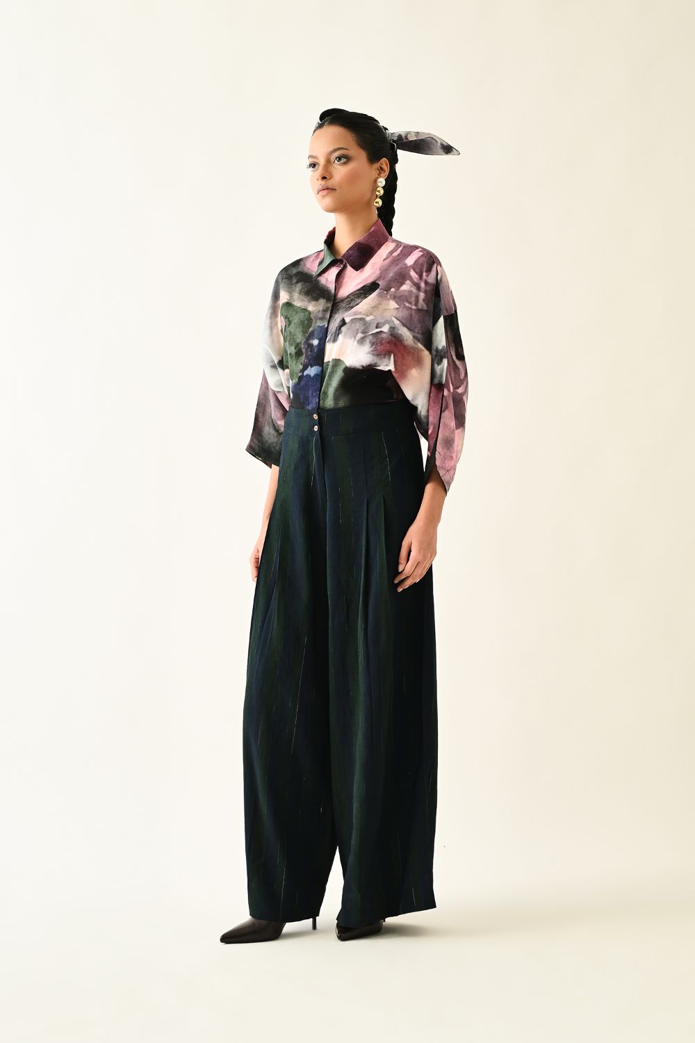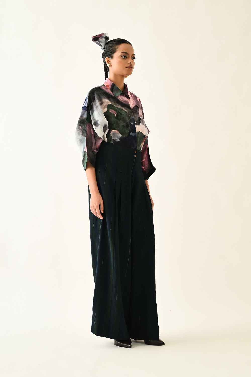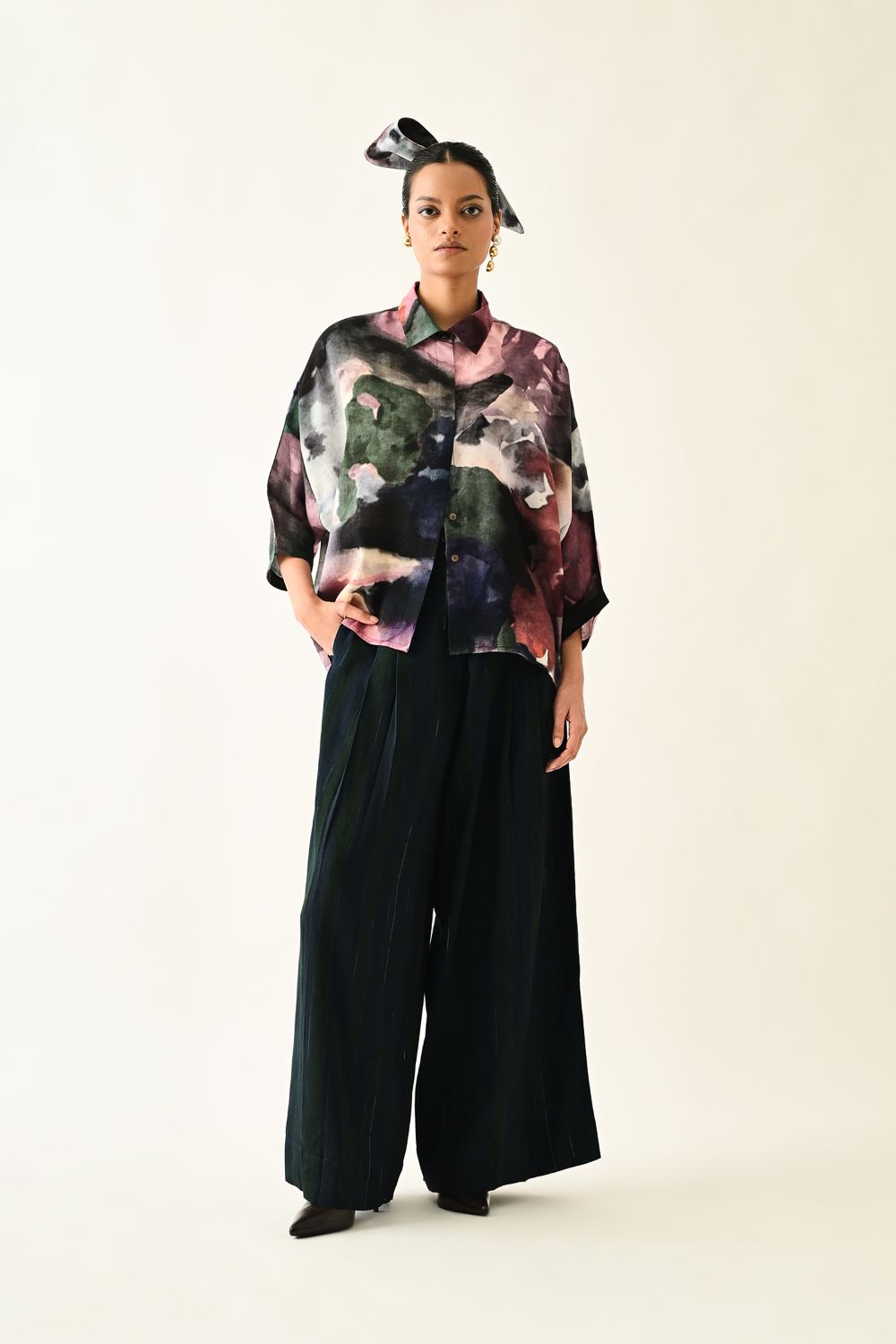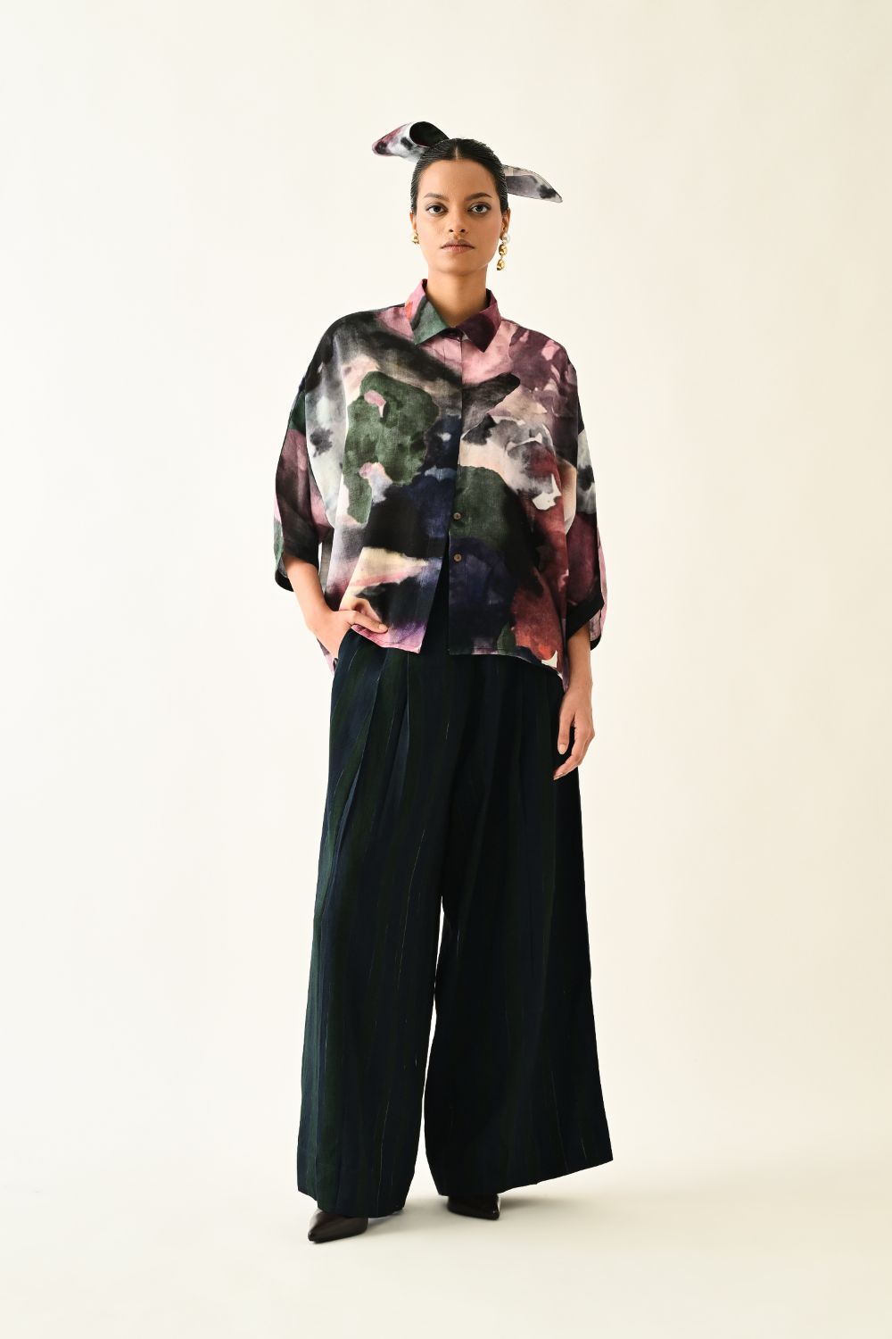 Top: Anti fit Shirt featuring a hand-painted abstract expressionist print, digitally transferred. Designed with a shirt collar, front hidden placket. The back yoke is finished and coding insert. Print placements will vary—single Piece. Model is wearing size XS/S.