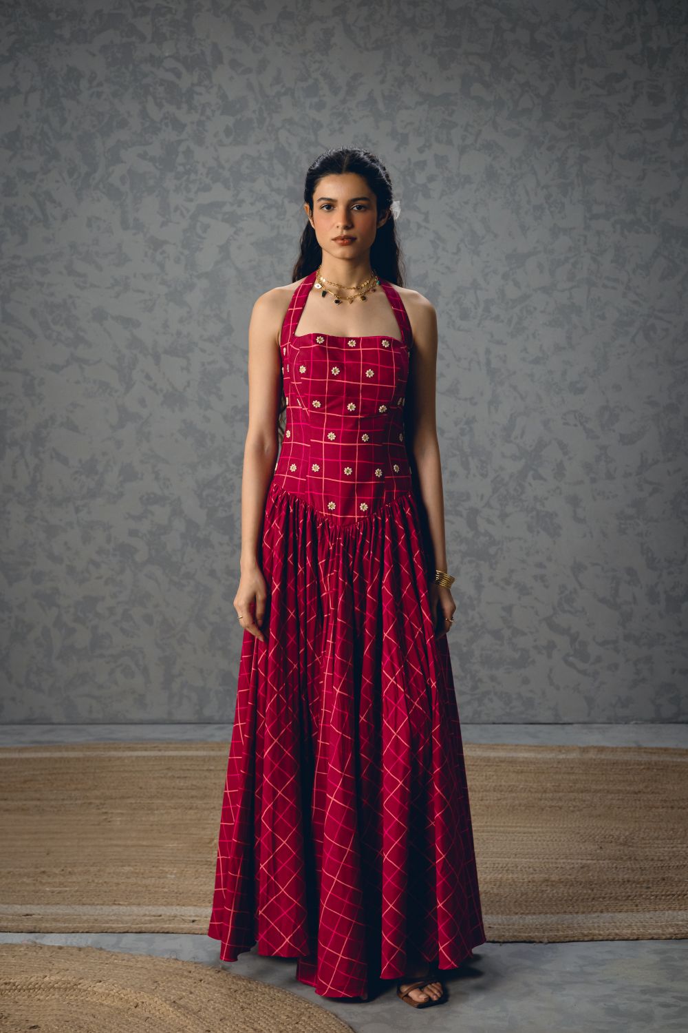 A maroon checks printed corset dress with delicate embroidery and gathering details is the perfect wardrobe staple for summer.