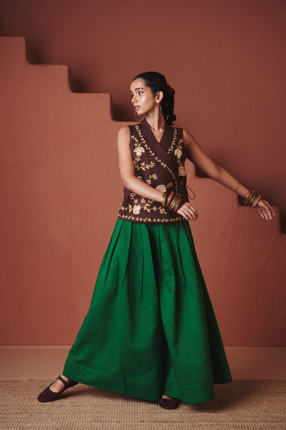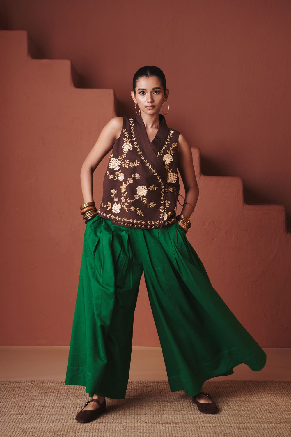Multi-pleated co-linen pants crafted with a high waist and generous volume for a fluid, skirt-like flare. The structured pleats add definition and movement, making them a versatile piece that balances festive elegance with everyday comfort.