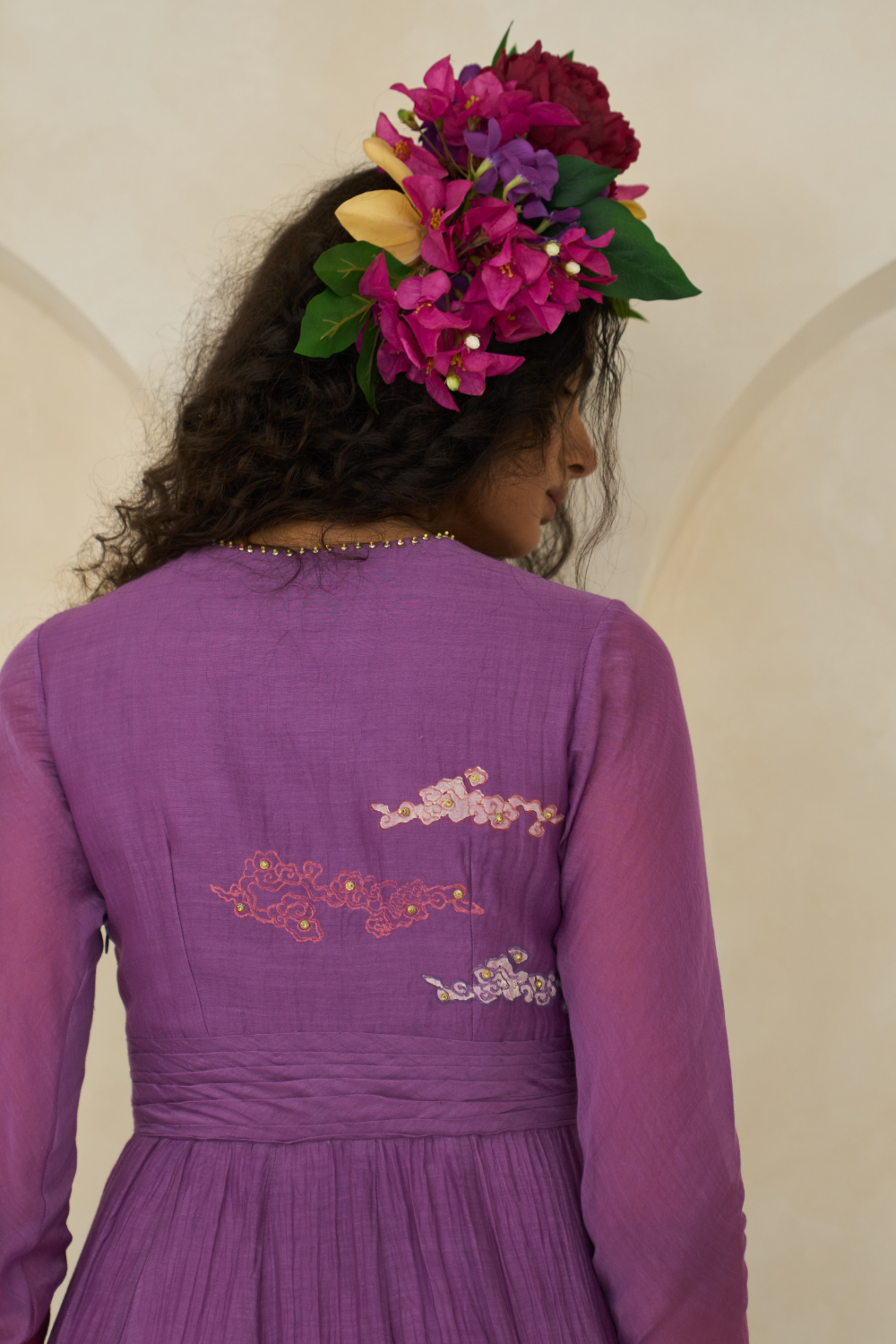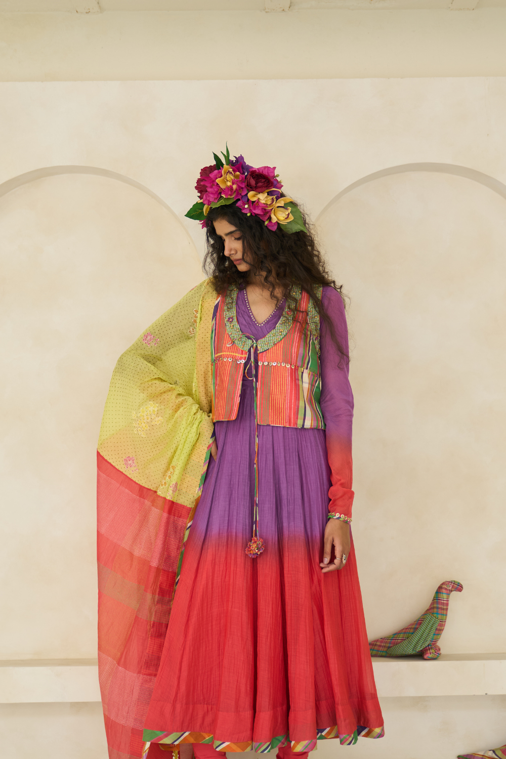 Tie-dyed ombre handwoven 40 gm Chanderi kurta with a fabric-manipulated yoke, enhanced with a block-printed back motif and hand-done beaded details.